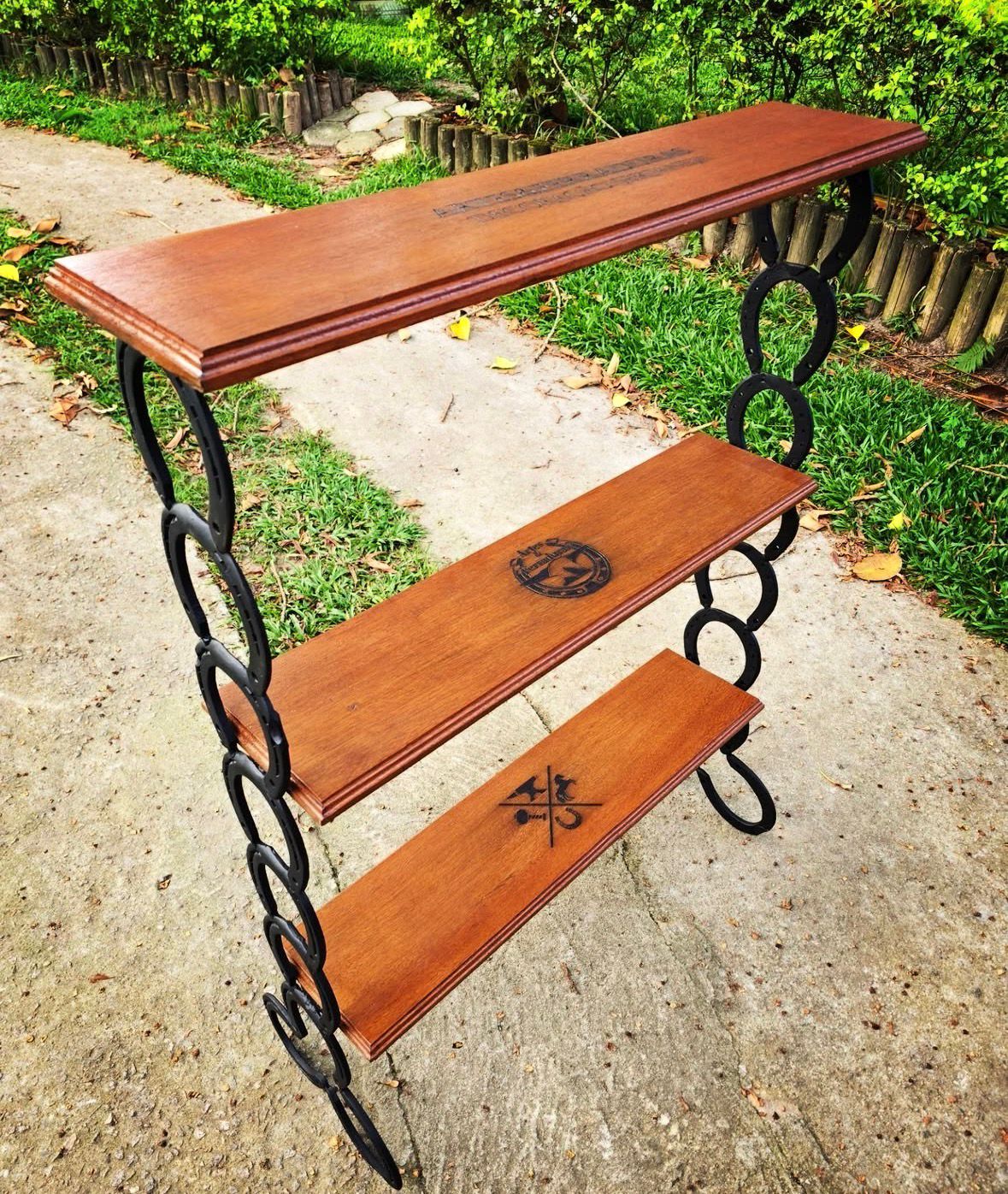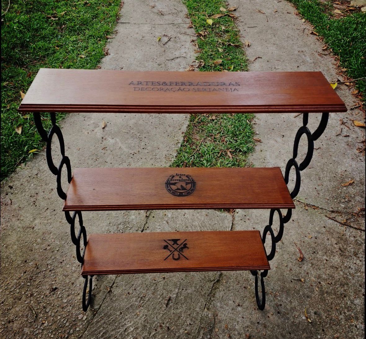Estante feita de ferraduras com três prateleiras