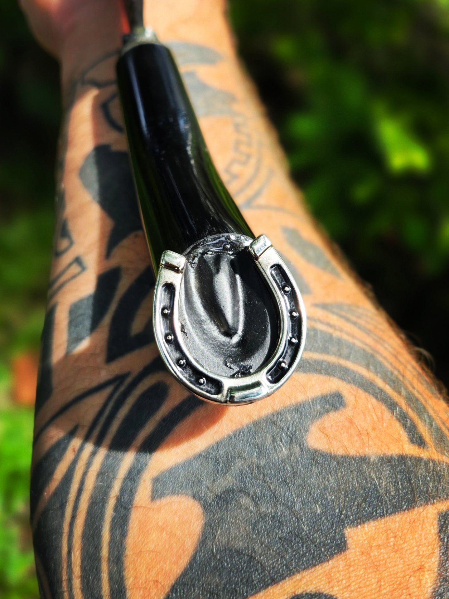 Picanheira de lâmina forjada em grosa, cabo em chifre e um Lindo acabamento no formato de casco com Ferraduras.