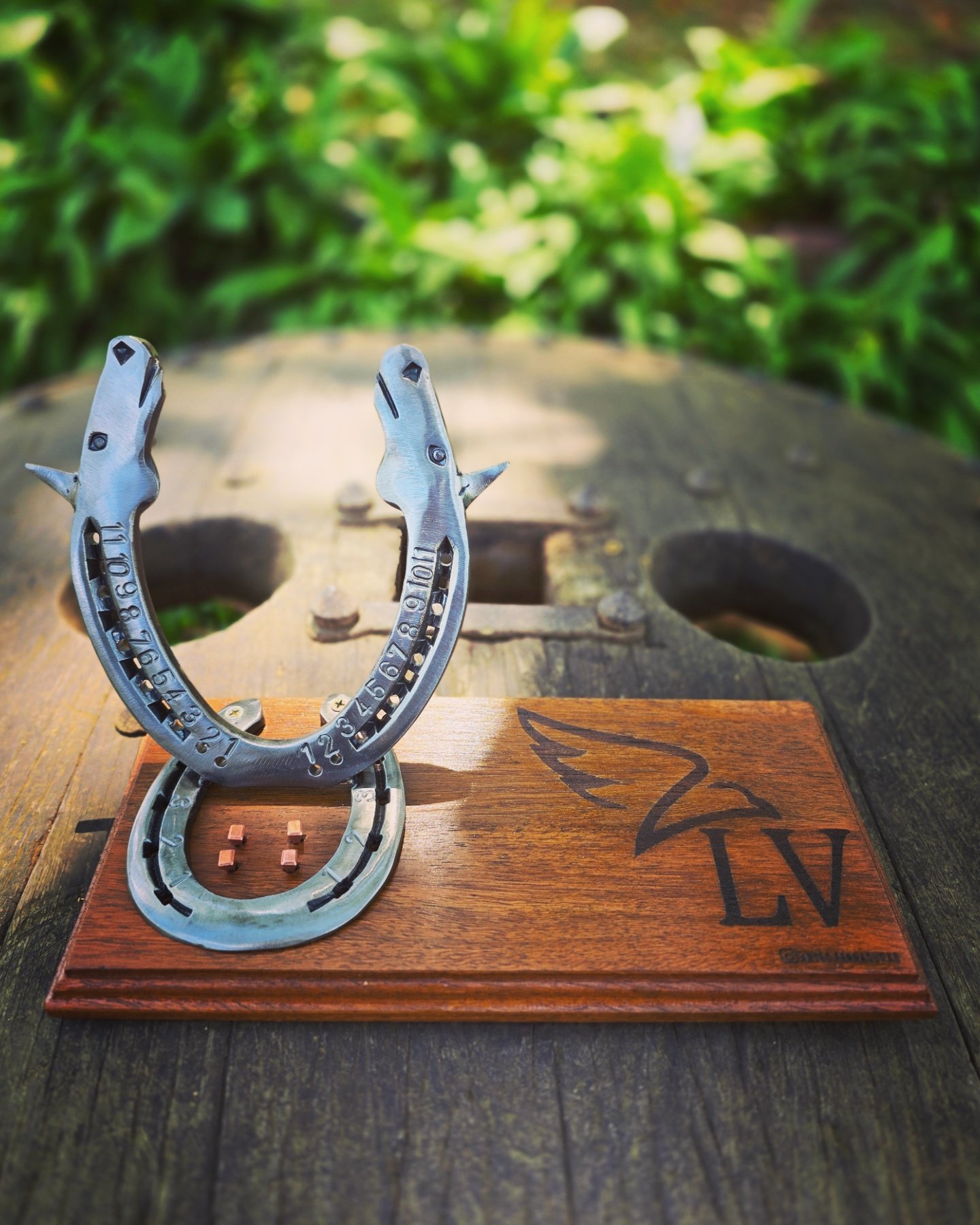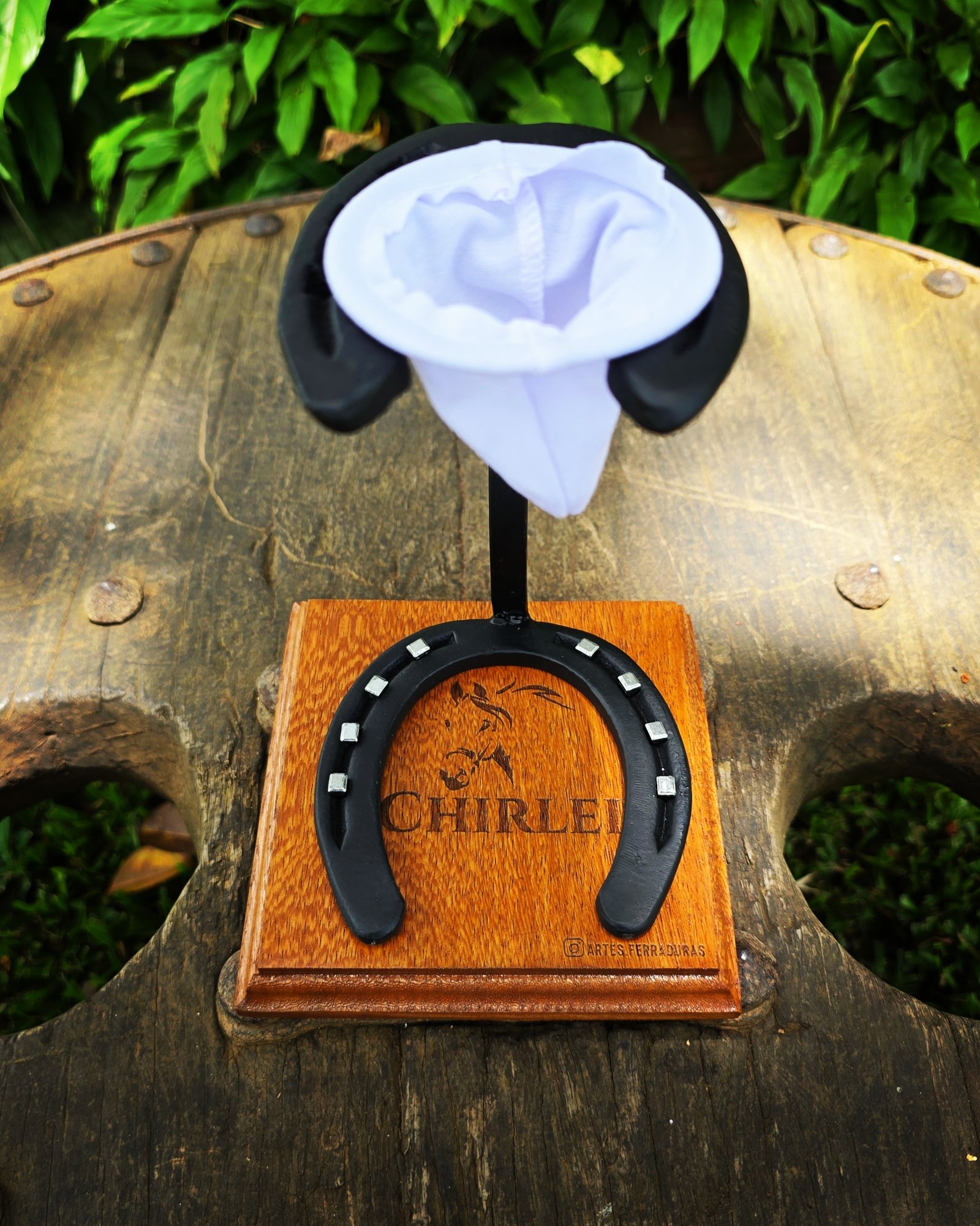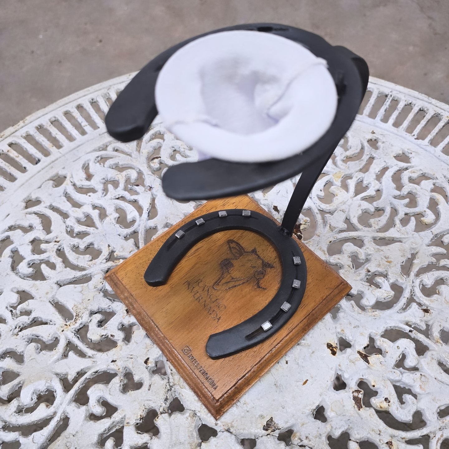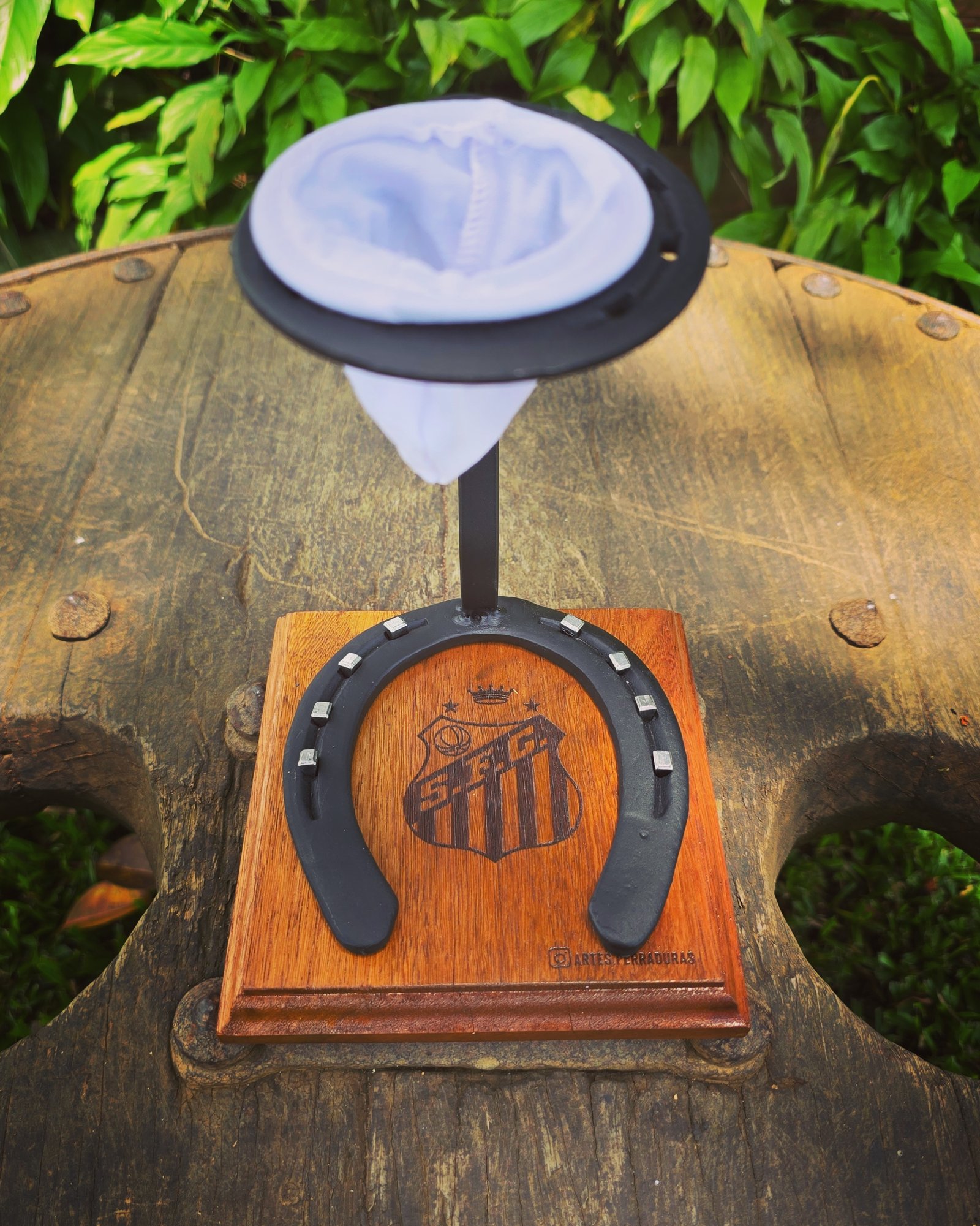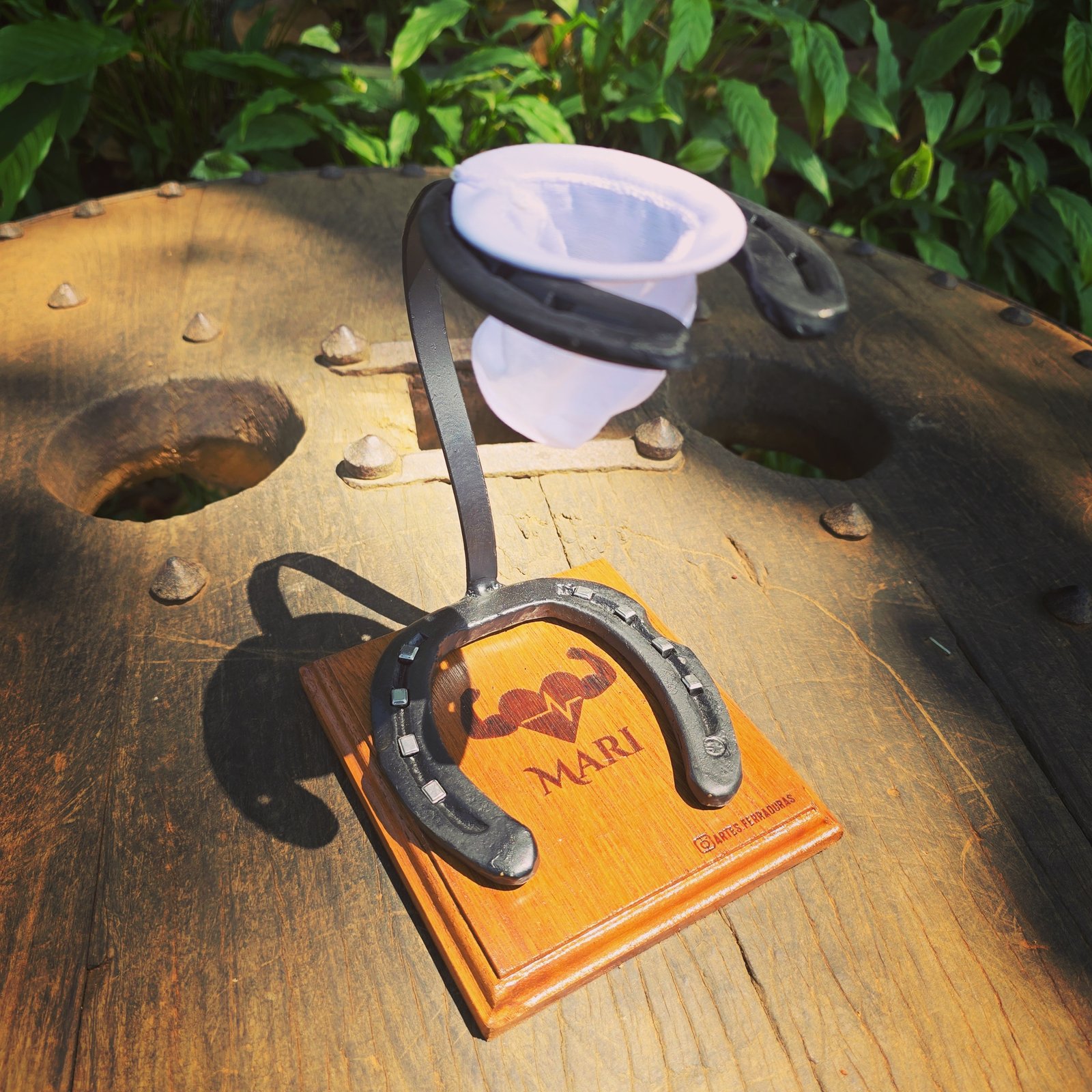 A medida perfeita para sua dose diária de café, para xícaras e canecas. Base em madeira com ferradura e cravos, podendo ser personalizado com Nomes/Frases/Logomarca. Acompanha coador de pano.