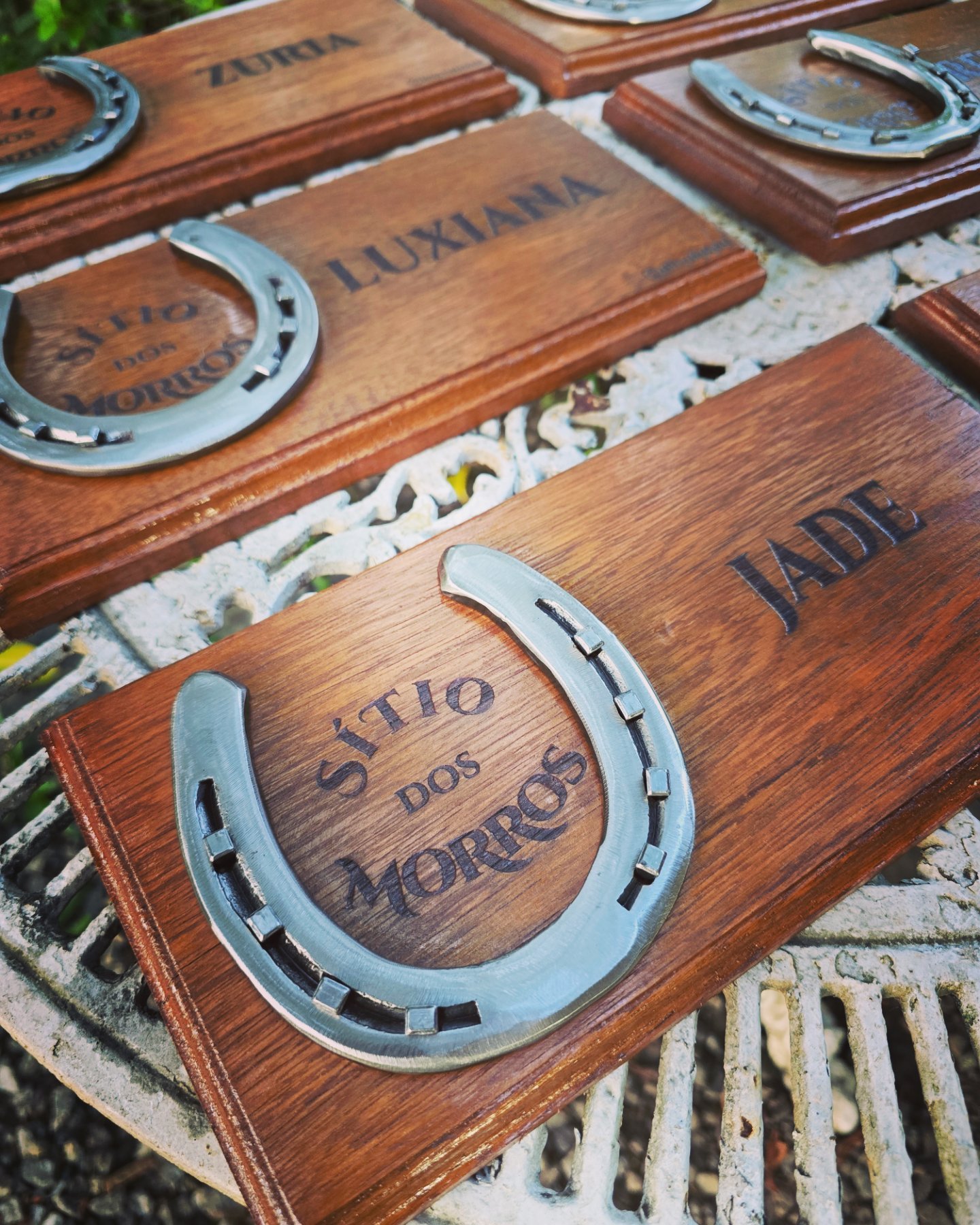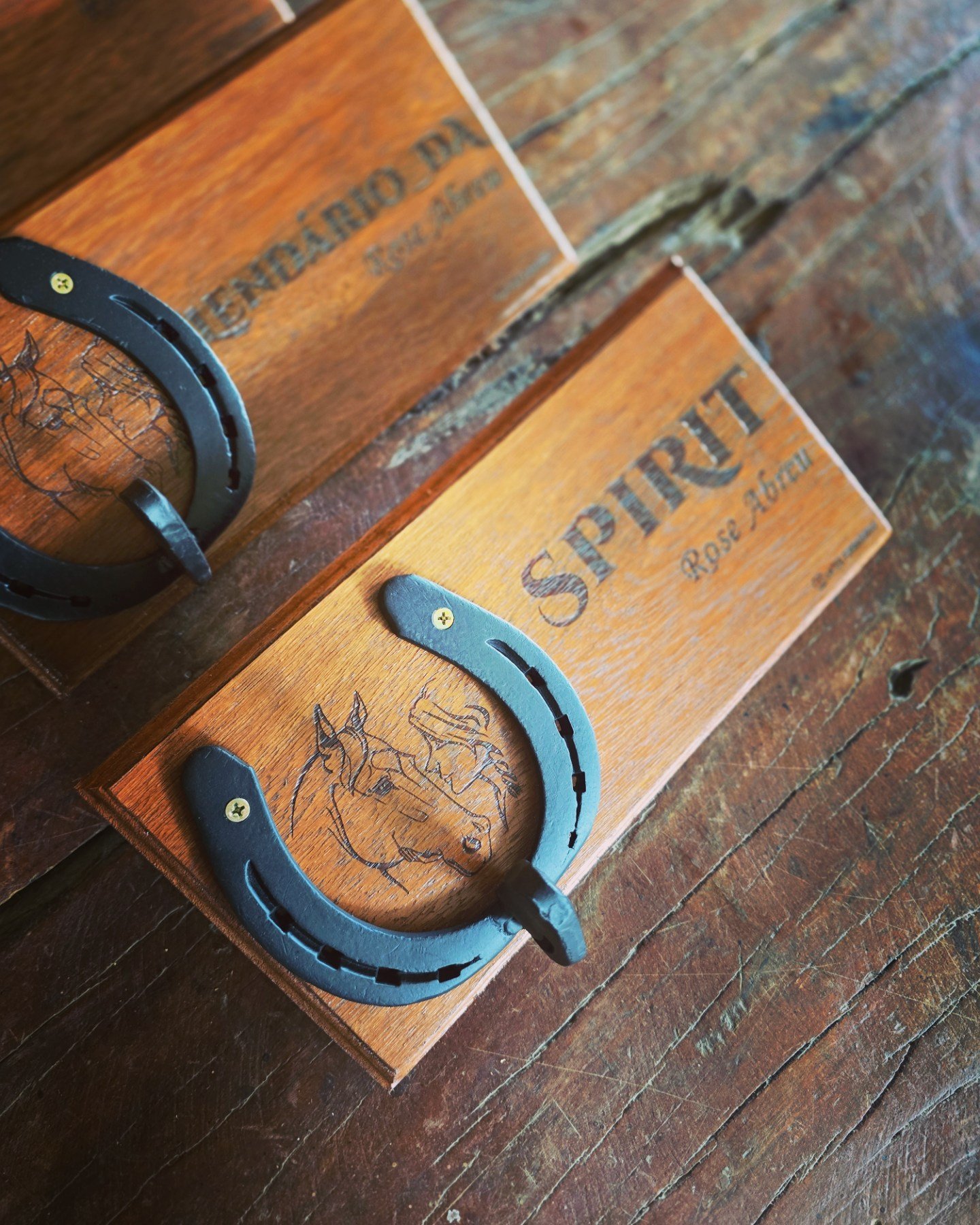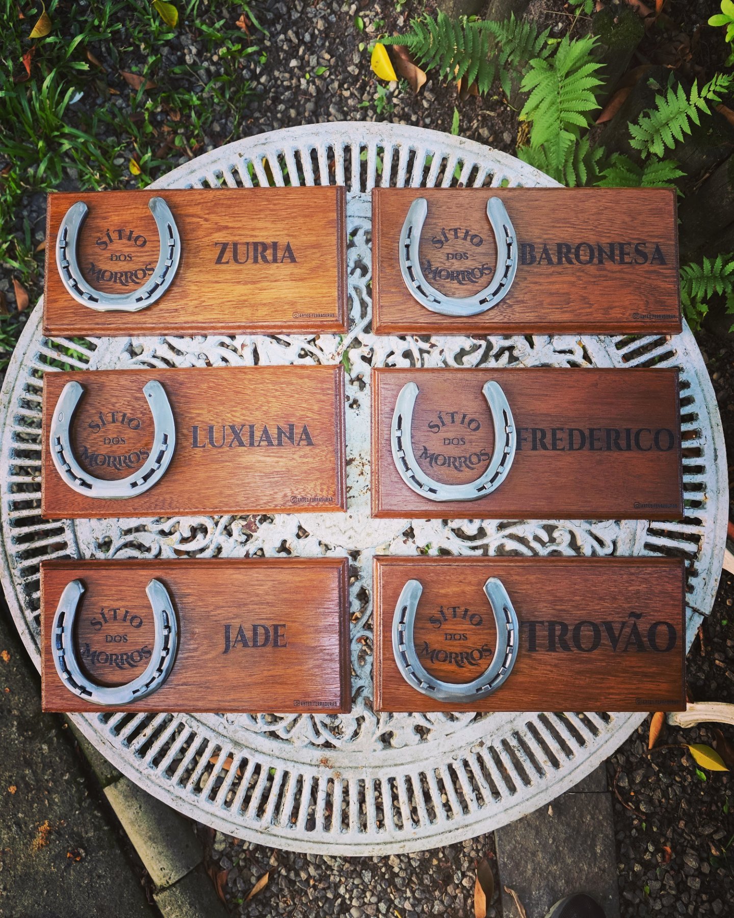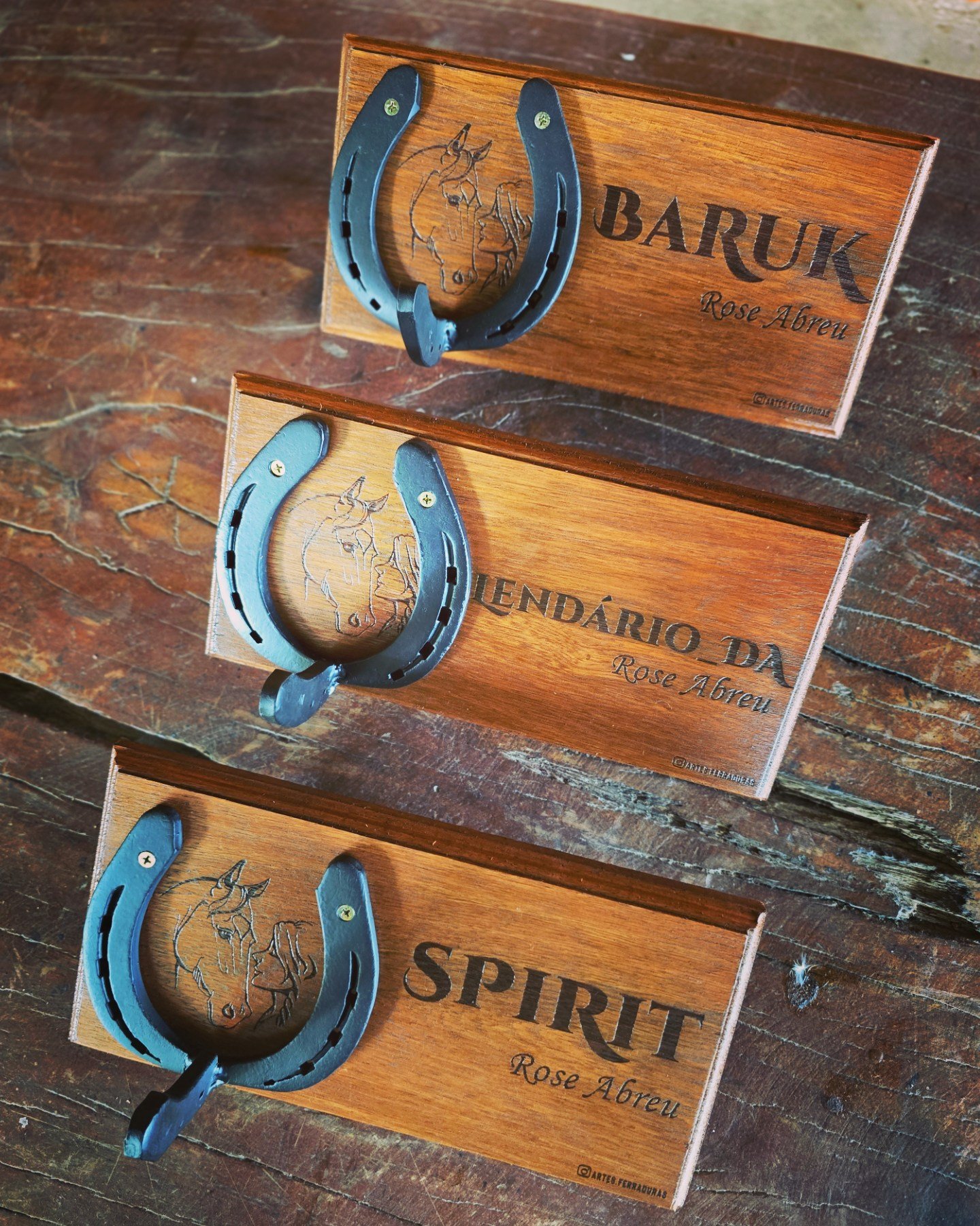 Placa em madeira tamanho 15x30, personalizado como quiser. Com ferradura com cabeças de cavalo forjadas.