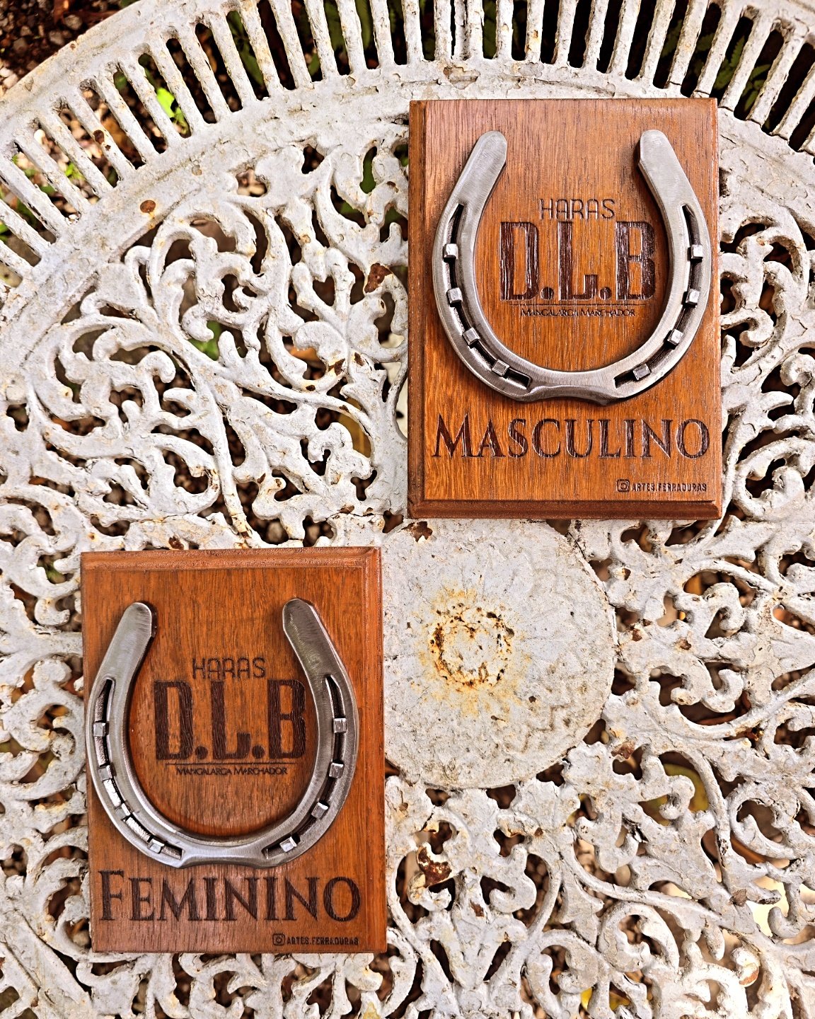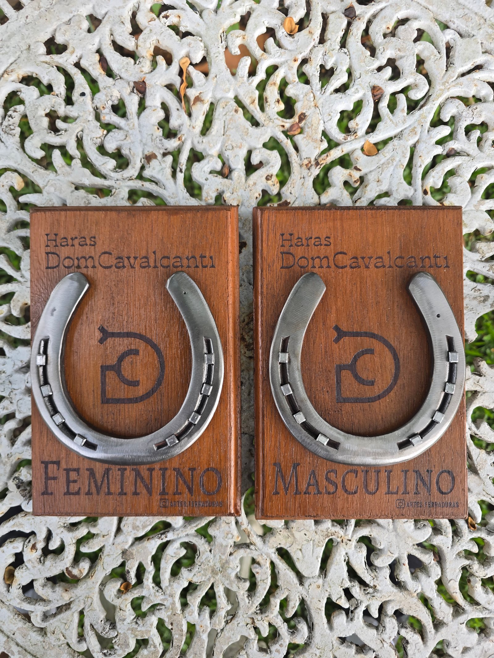 Placa de identificação banheiro Masculino e Feminino, com ferradura e cravo. Base em madeira, Personalizado como quiser.