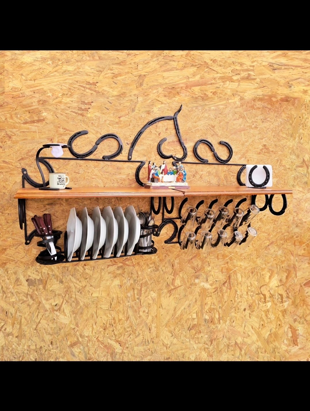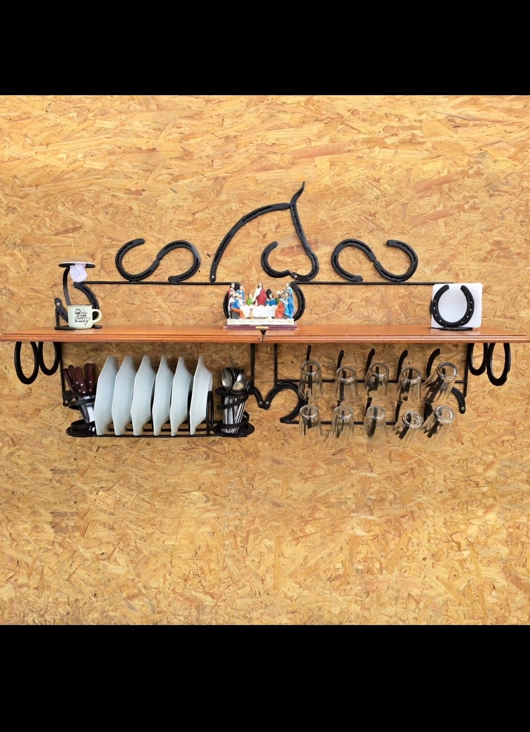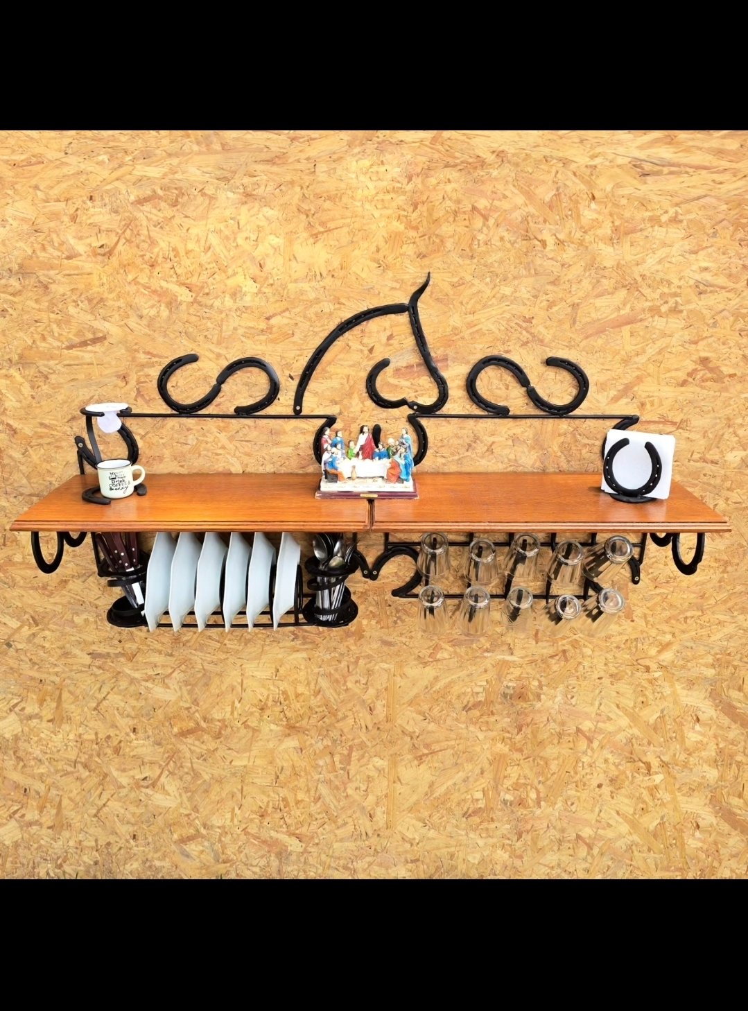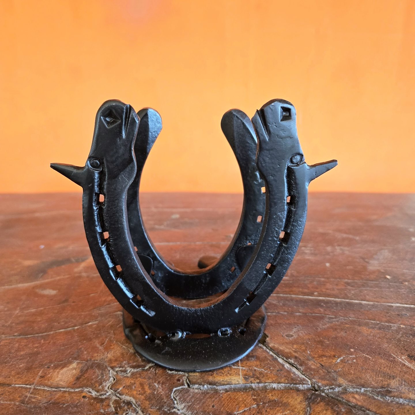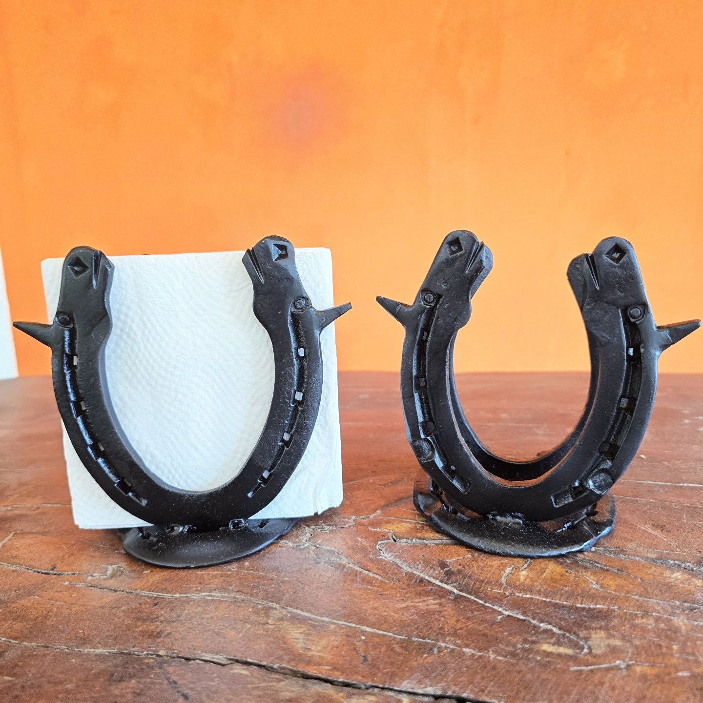 Suporte para guardanapos de papel, feito com ferraduras, detalhe com Cabeças de Cavalo Forjadas na Ferradura.