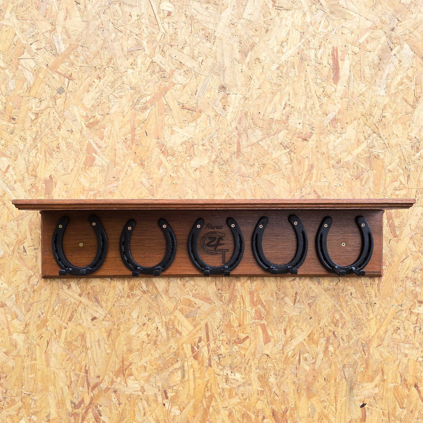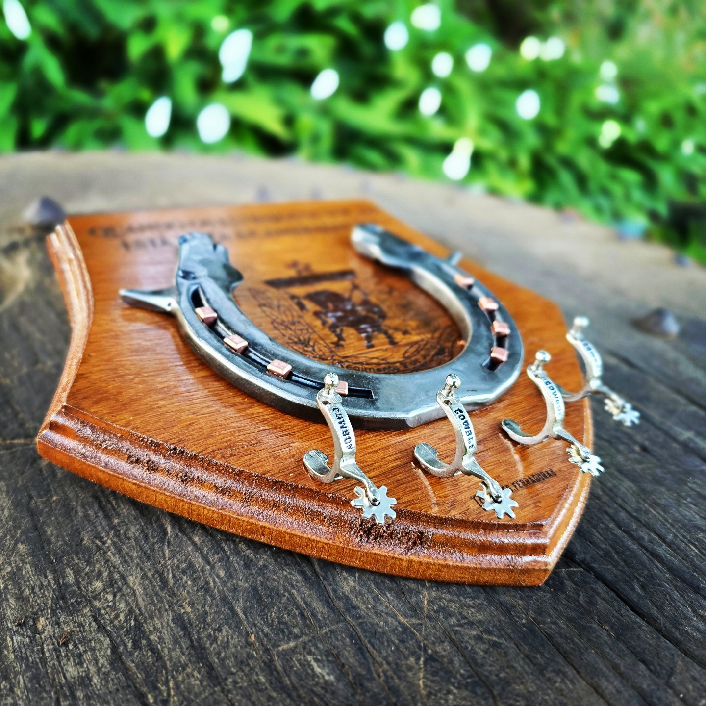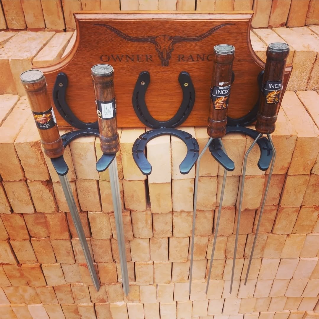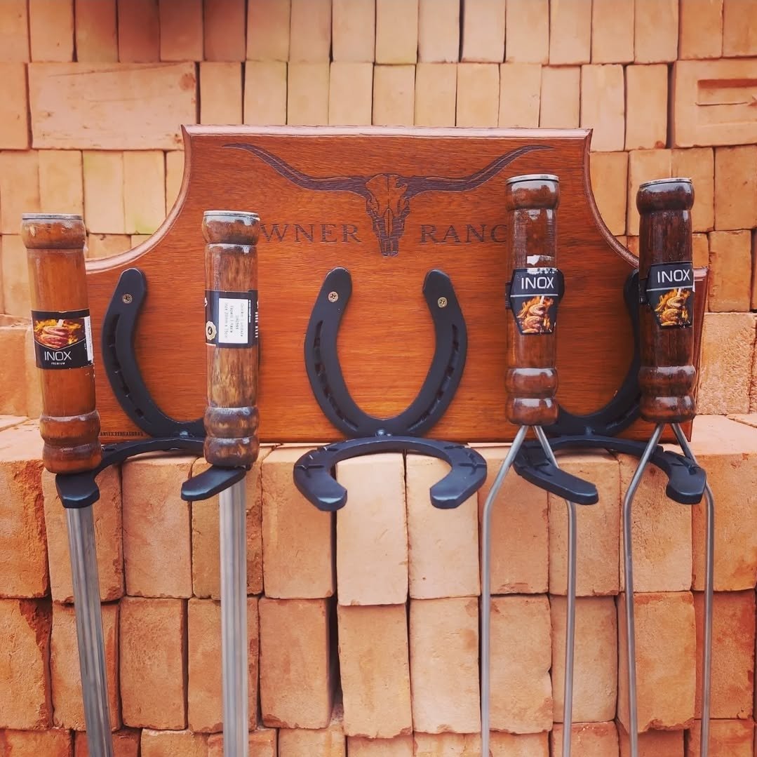 Suporte para espetos de churrasco, feito com ferraduras e base em madeira, podendo ser personalizada com Nome/Logo.