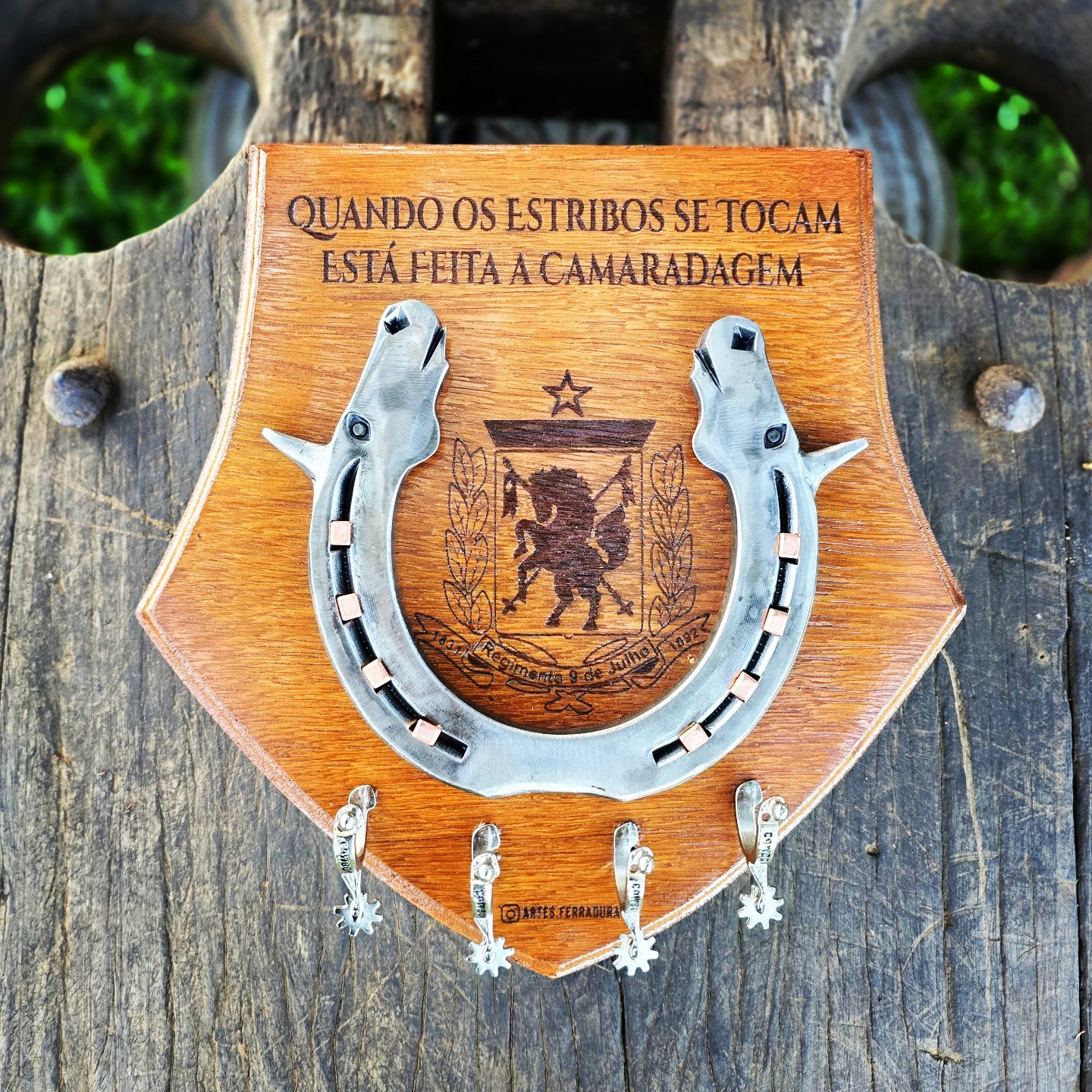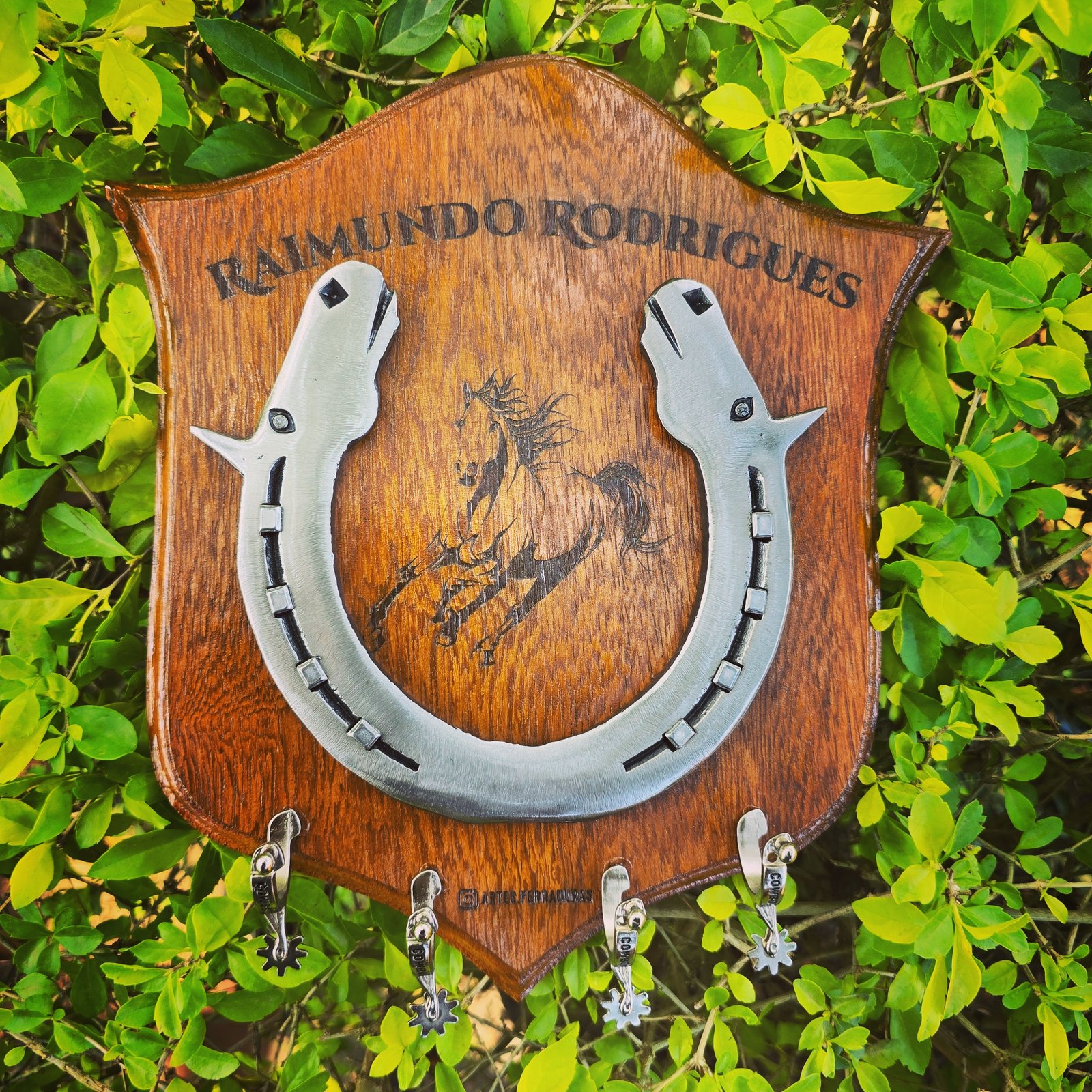 Ferradura com Cabeças de Cavalos Forjados, com mini Esporas, podendo escolher entre diversos formatos de Escudo e a gravação personalizada como quiser.