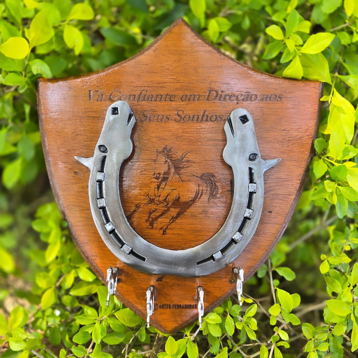 Ferradura com Cabeças de Cavalos Forjados, com mini Cavalinhos, podendo escolher entre diversos formatos de Escudo e a gravação personalizada como quiser.