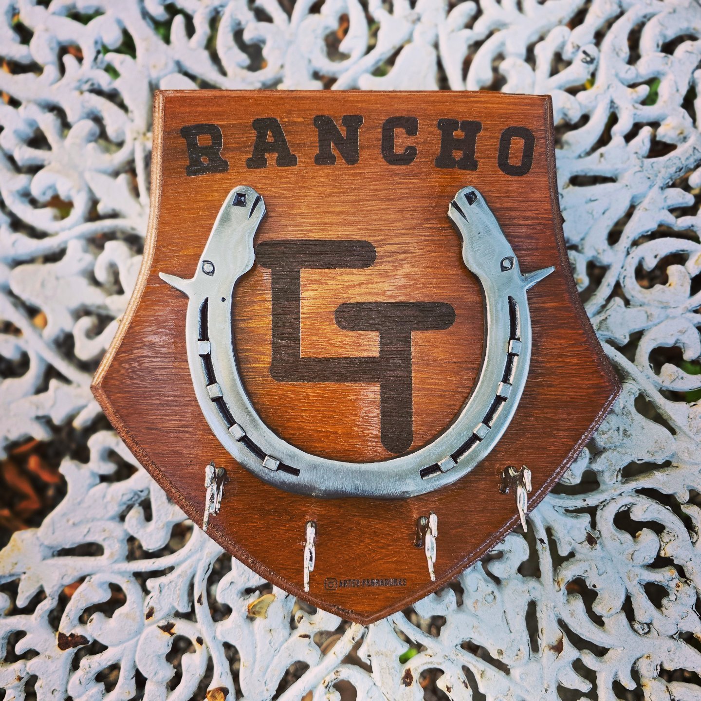 Porta Chaves com ferradura, cabeça de touro e cravos.