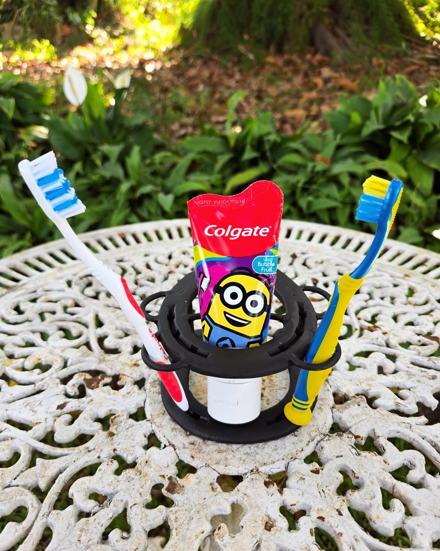 Suporte, acomoda 4 escovas de dente e 1 tubo de pasta.