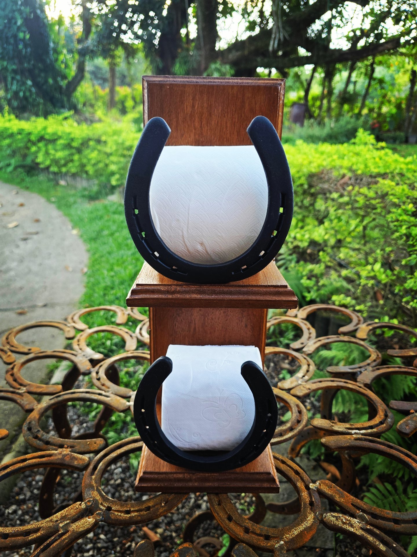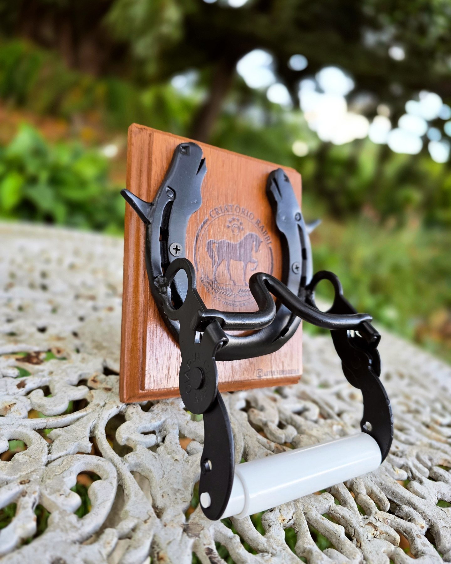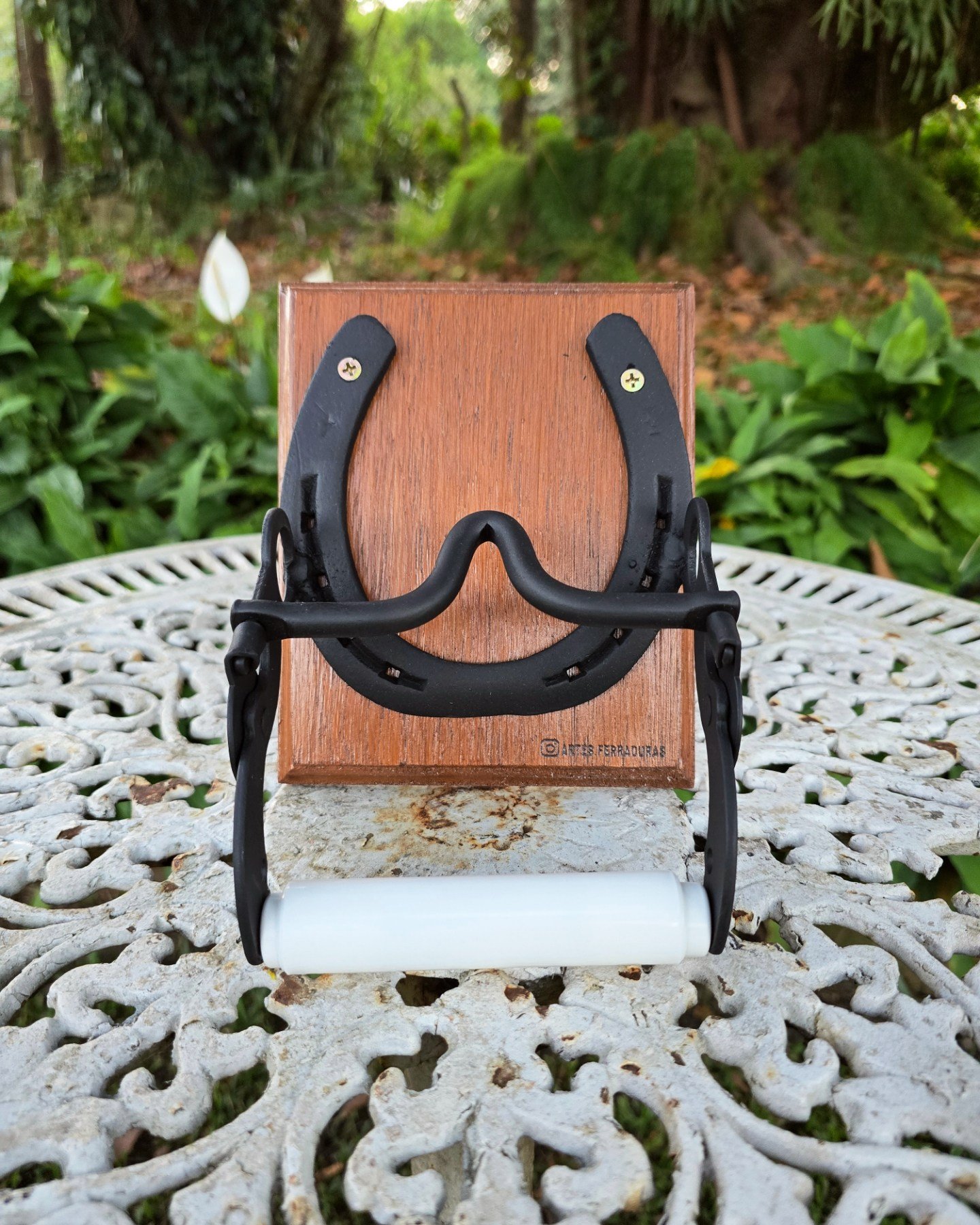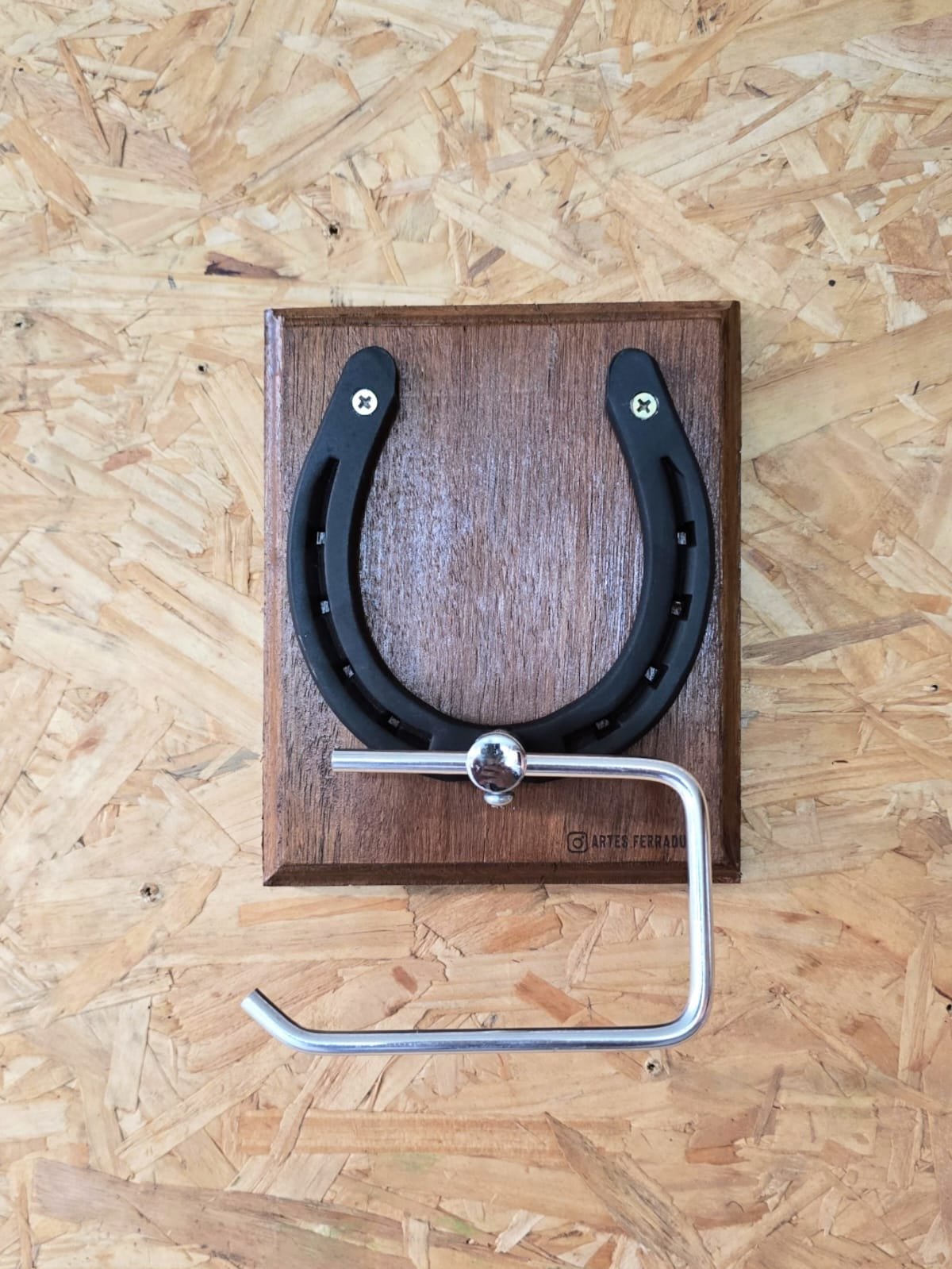 Suporte para papel higiênico com freio e cabeças de Cavalos forjadas na Ferradura, base de madeira, Podendo ser personalizado.