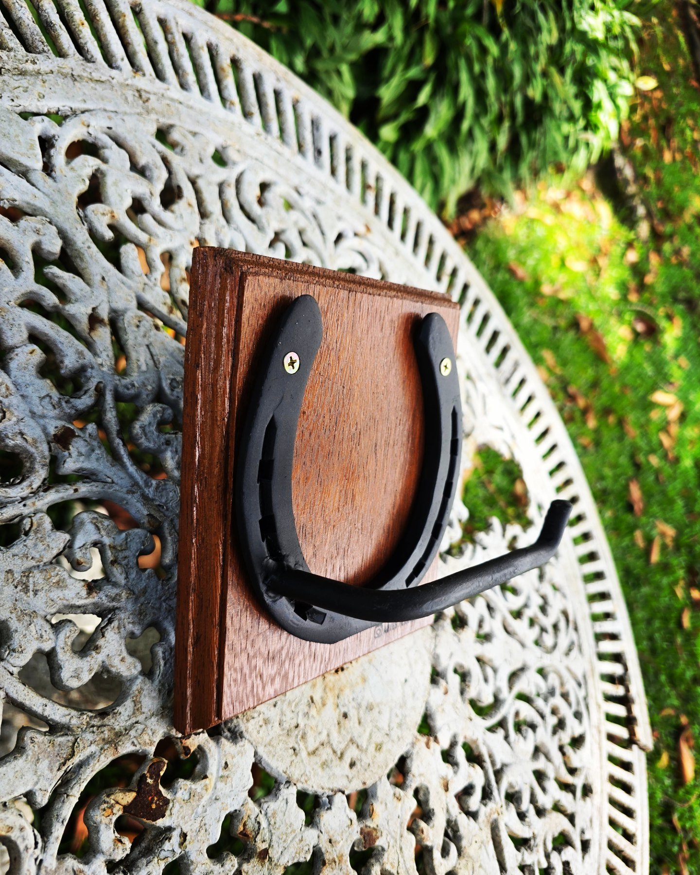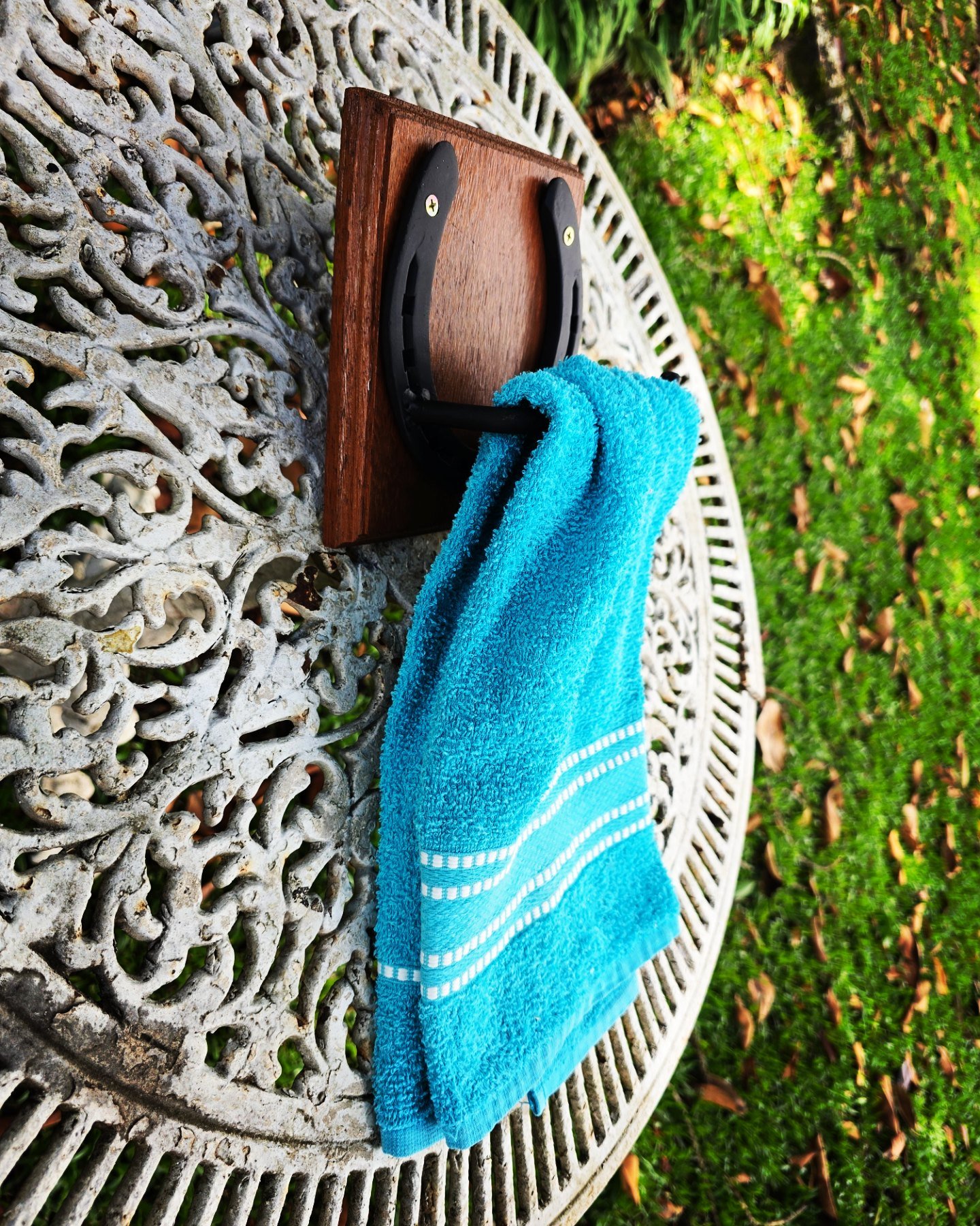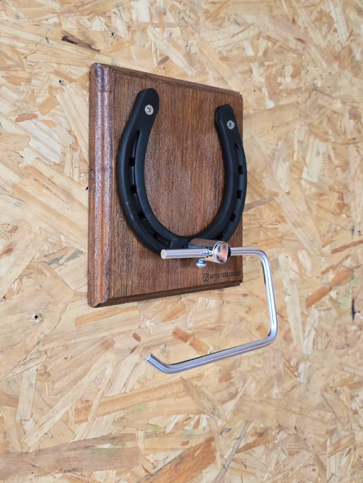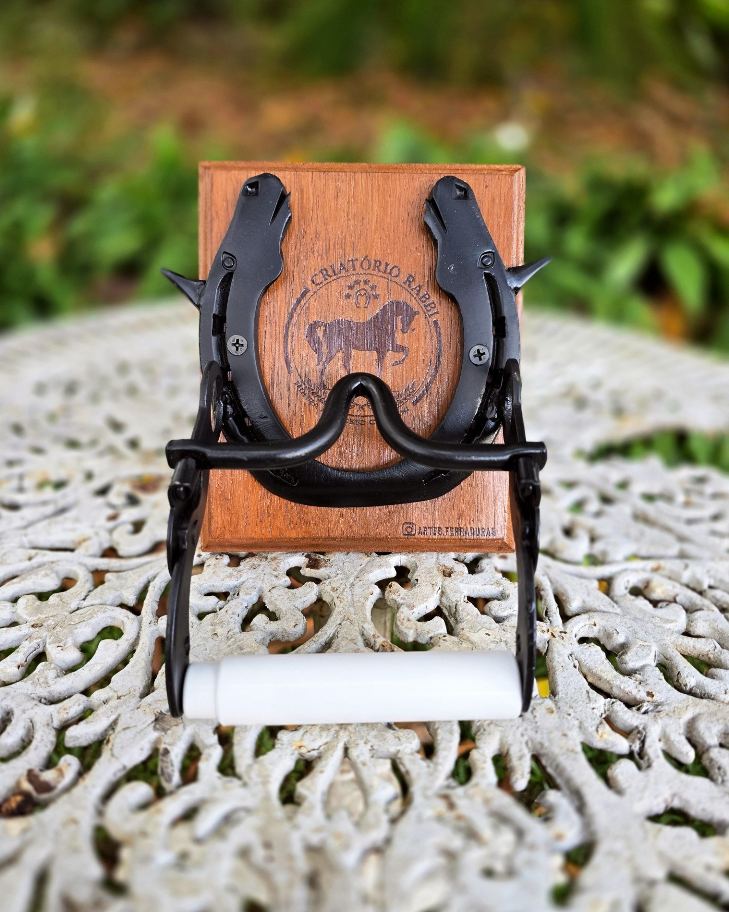 Suporte para papel higiênico com freio e cabeças de Cavalos forjadas na Ferradura, base de madeira, Podendo ser personalizado.