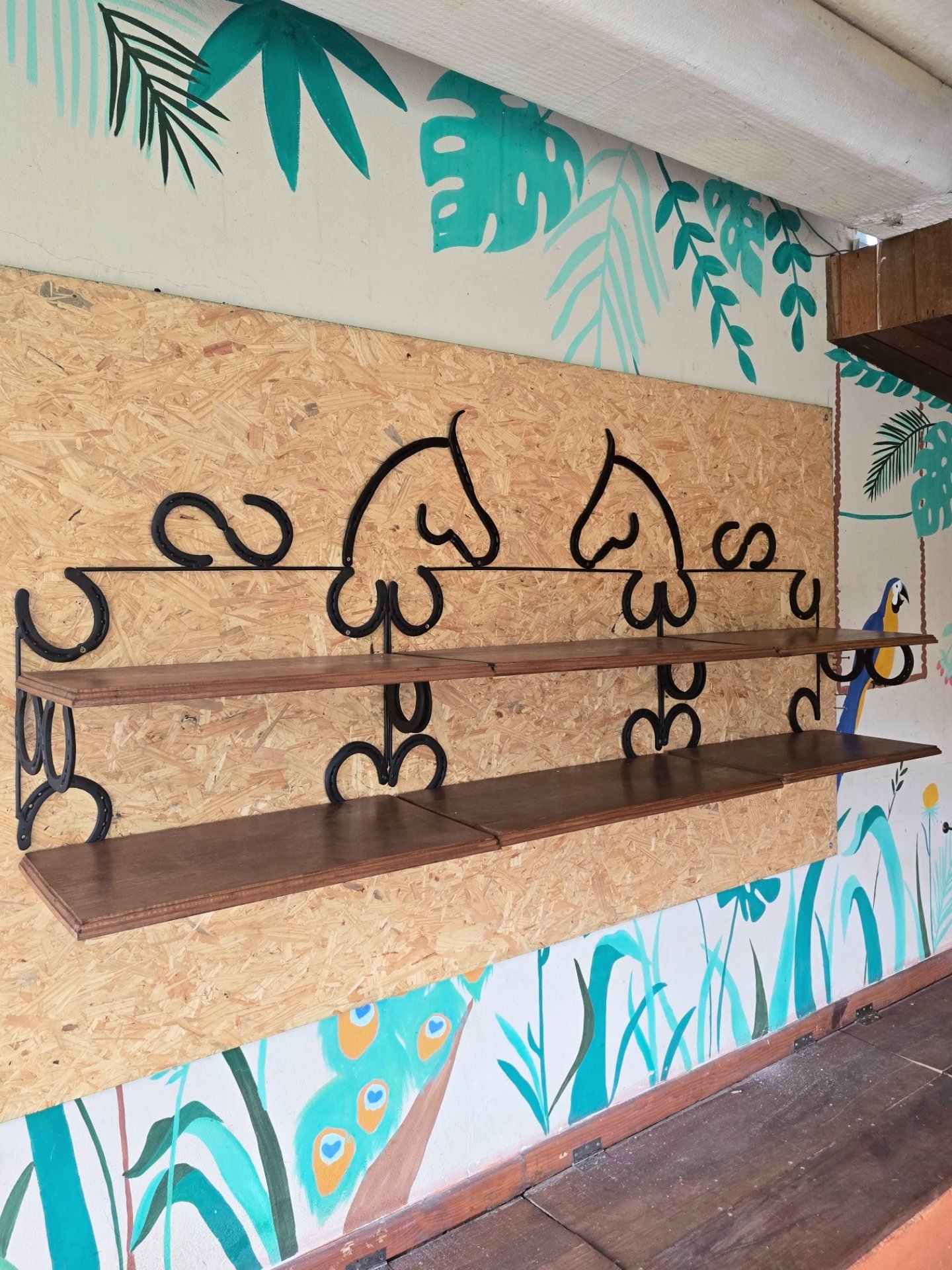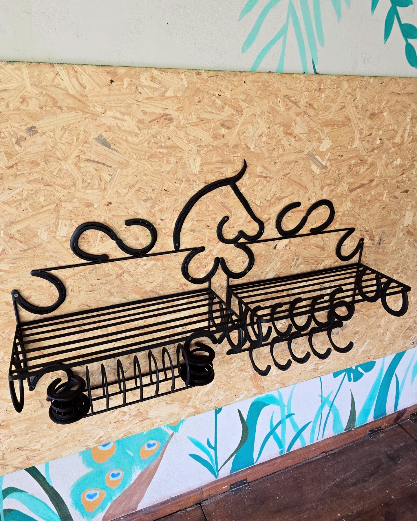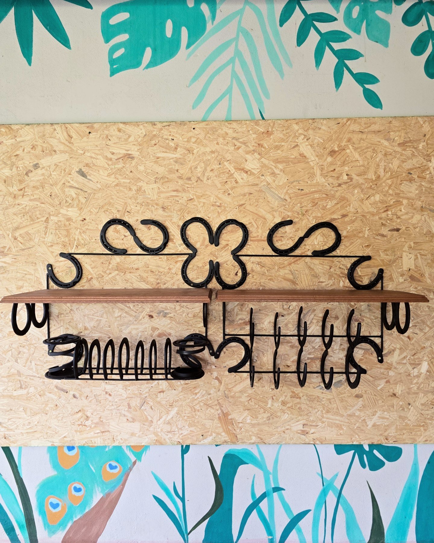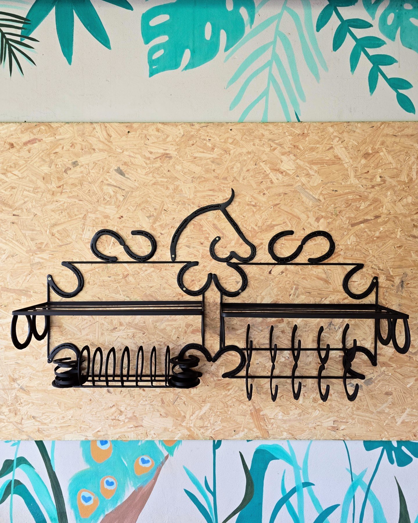Capacidade 6 Pratos, 10 Copos, diversos Talheres. Prateleira superior em madeira. Comprimento total 1.80 mt. Com duas cabeças de cavalo feitas em ferraduras forjadas.