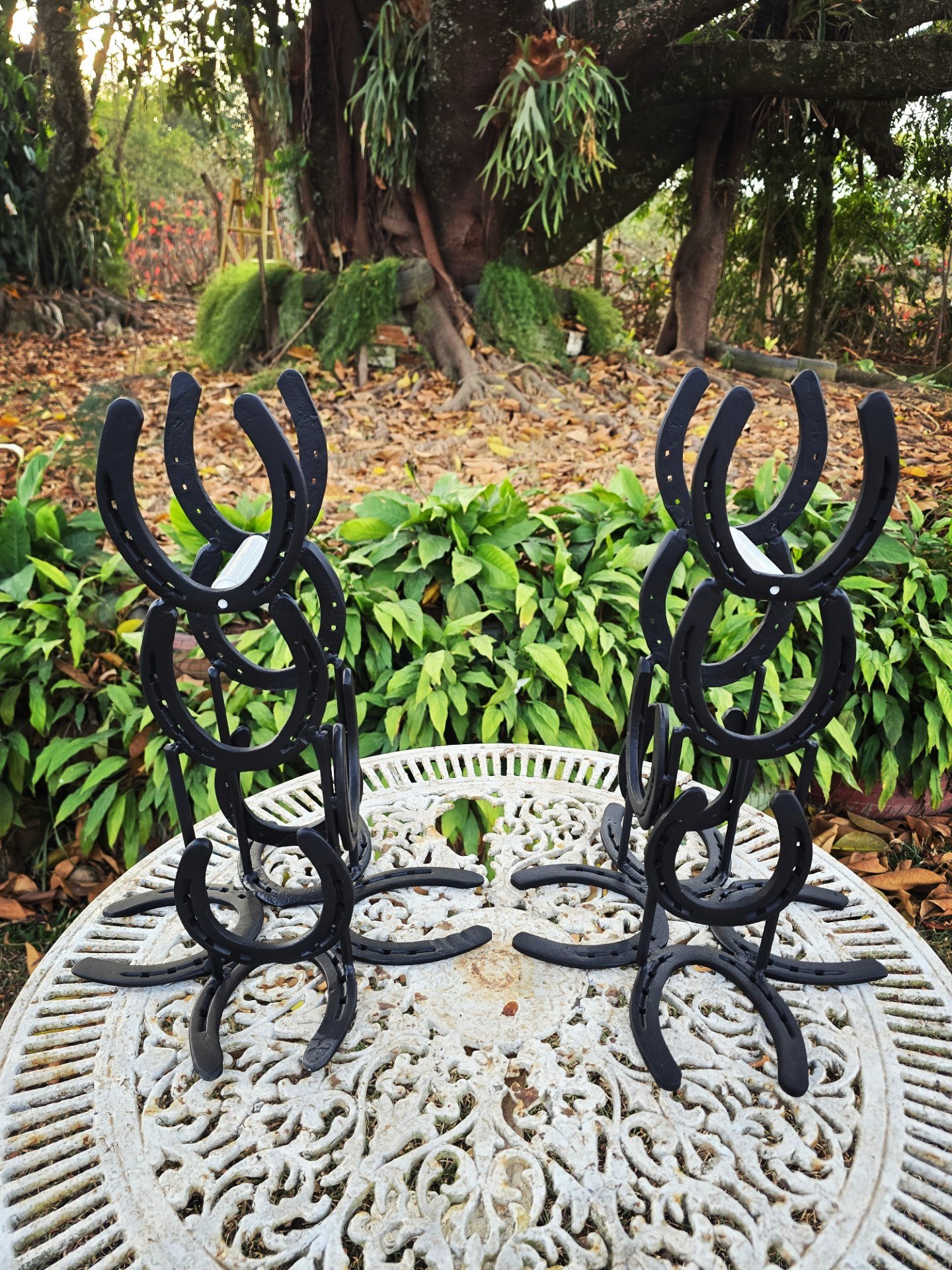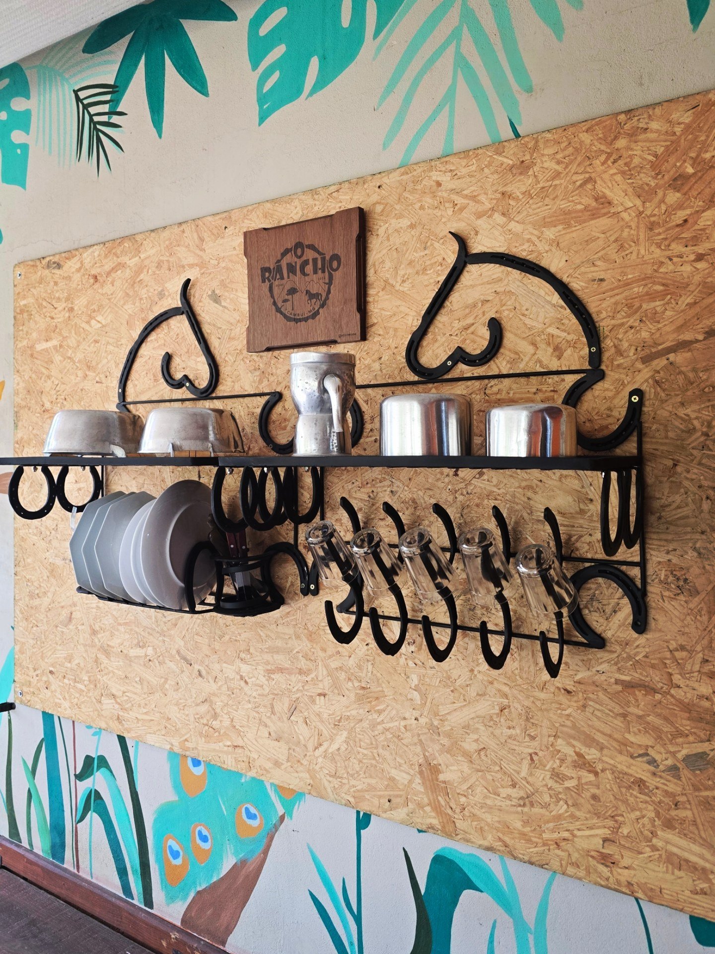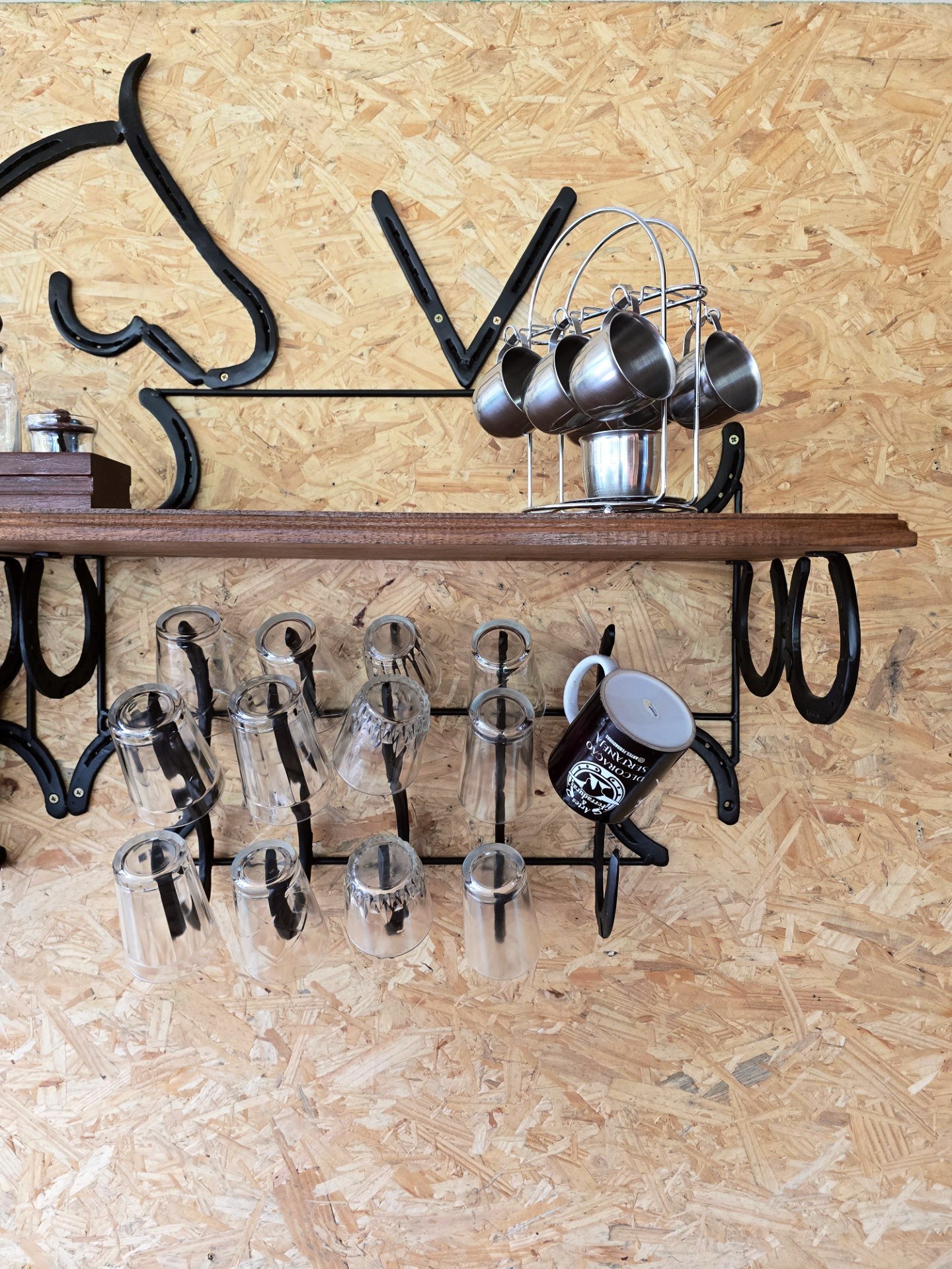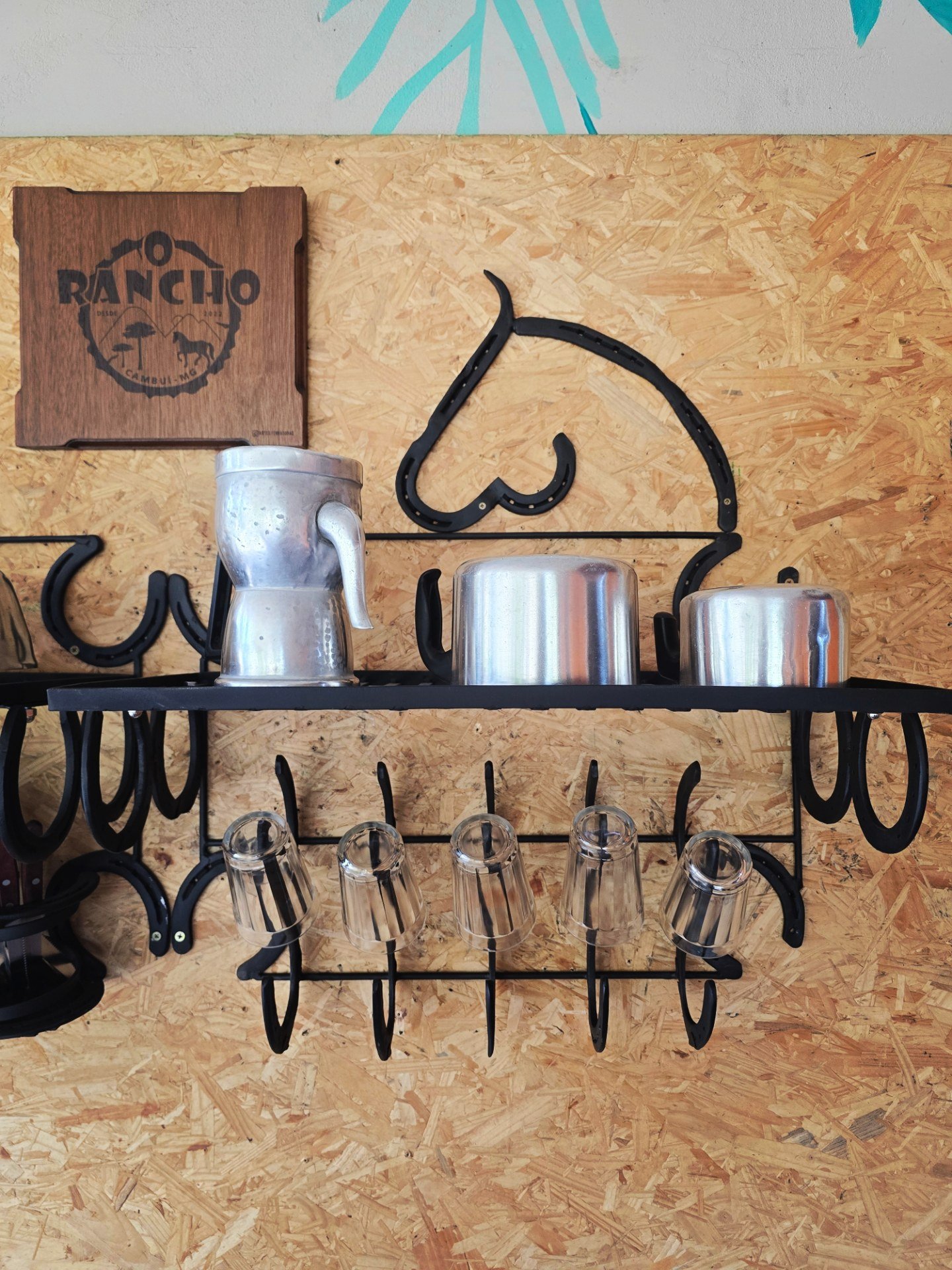 Capacidade 6 Pratos, 10 Copos, diversos Talheres. Prateleira superior em madeira. Comprimento total 1.80 mt. Com duas cabeças de cavalo feitas em ferraduras forjadas.