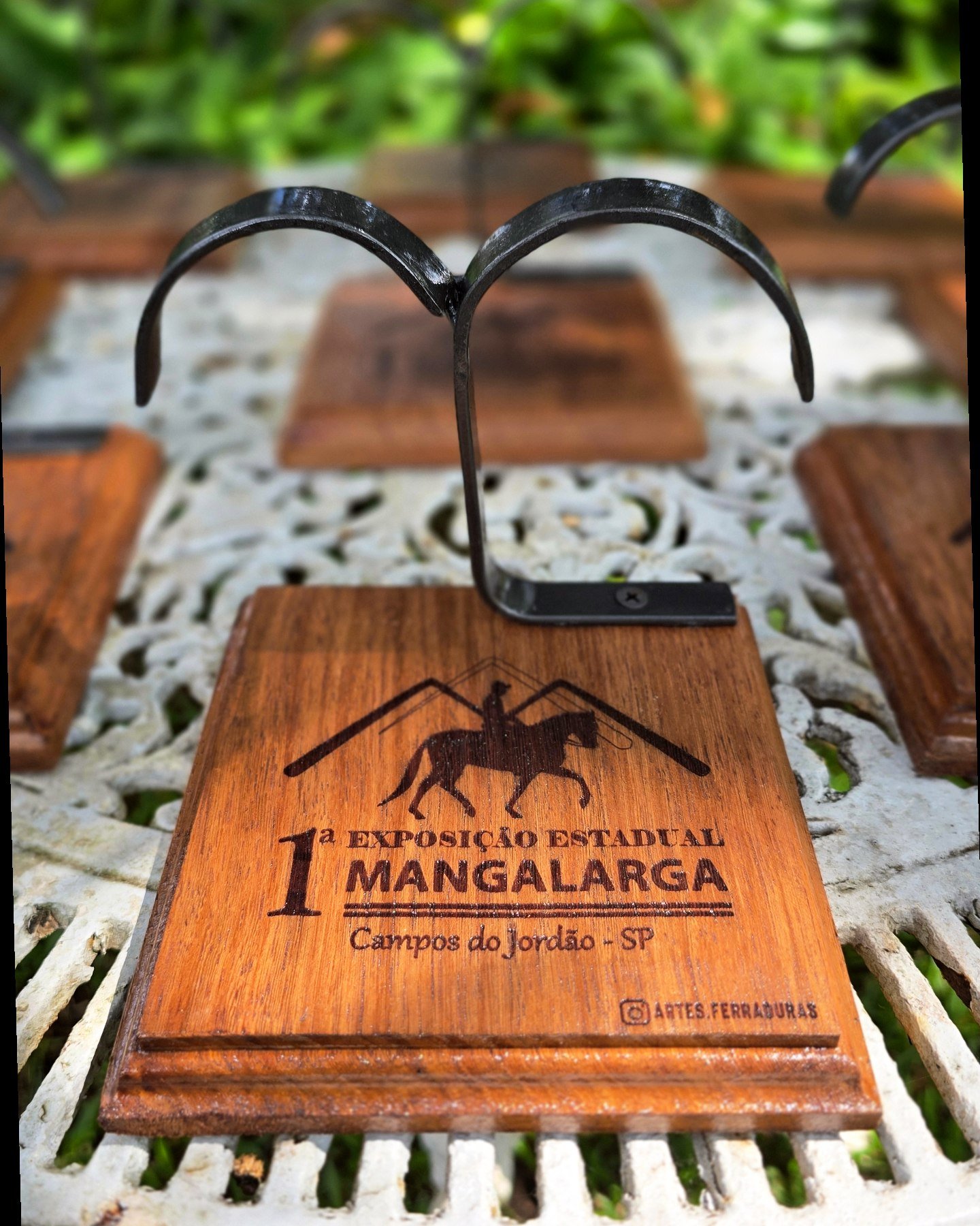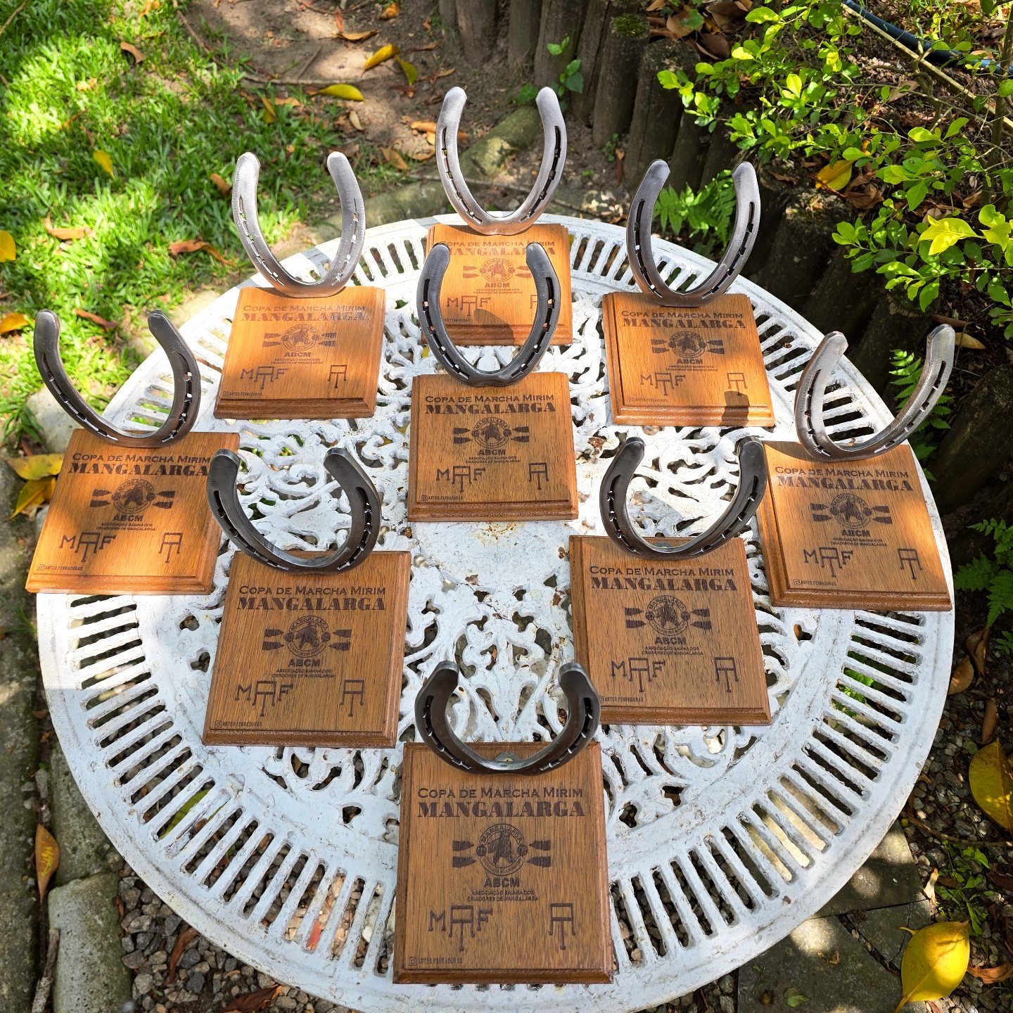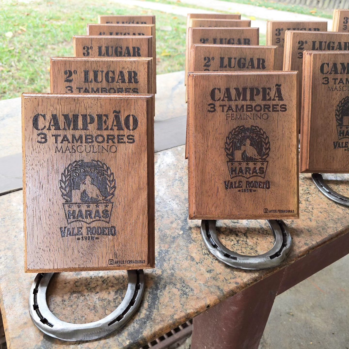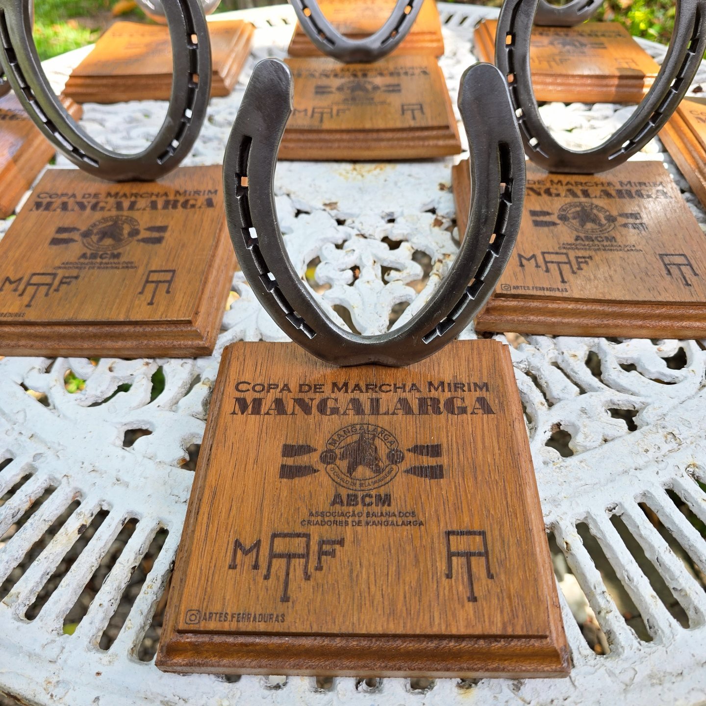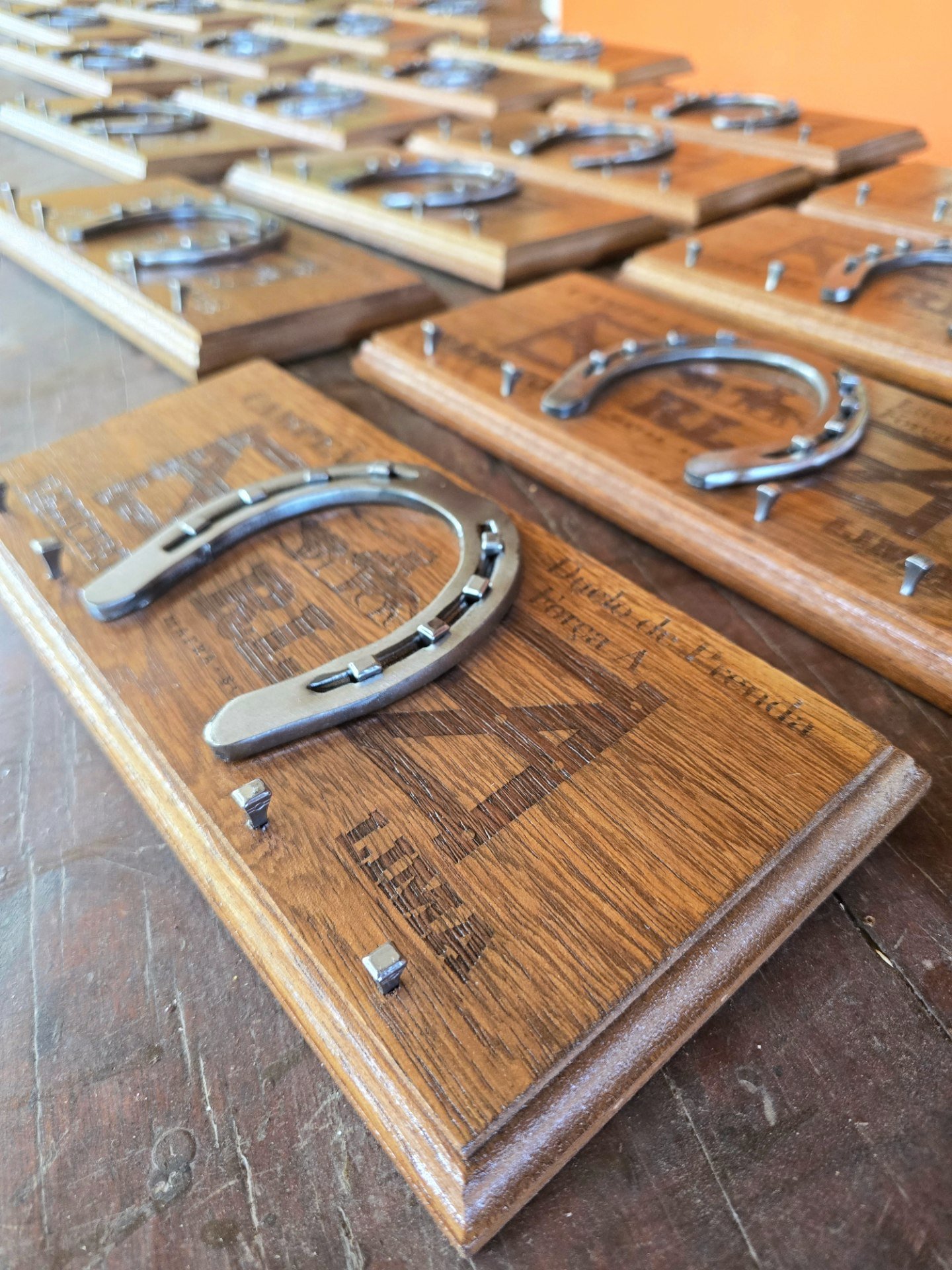 Troféu com ferradura, base de madeira, personalizado para o seu evento. Valor para no mínimo 12 unidades.