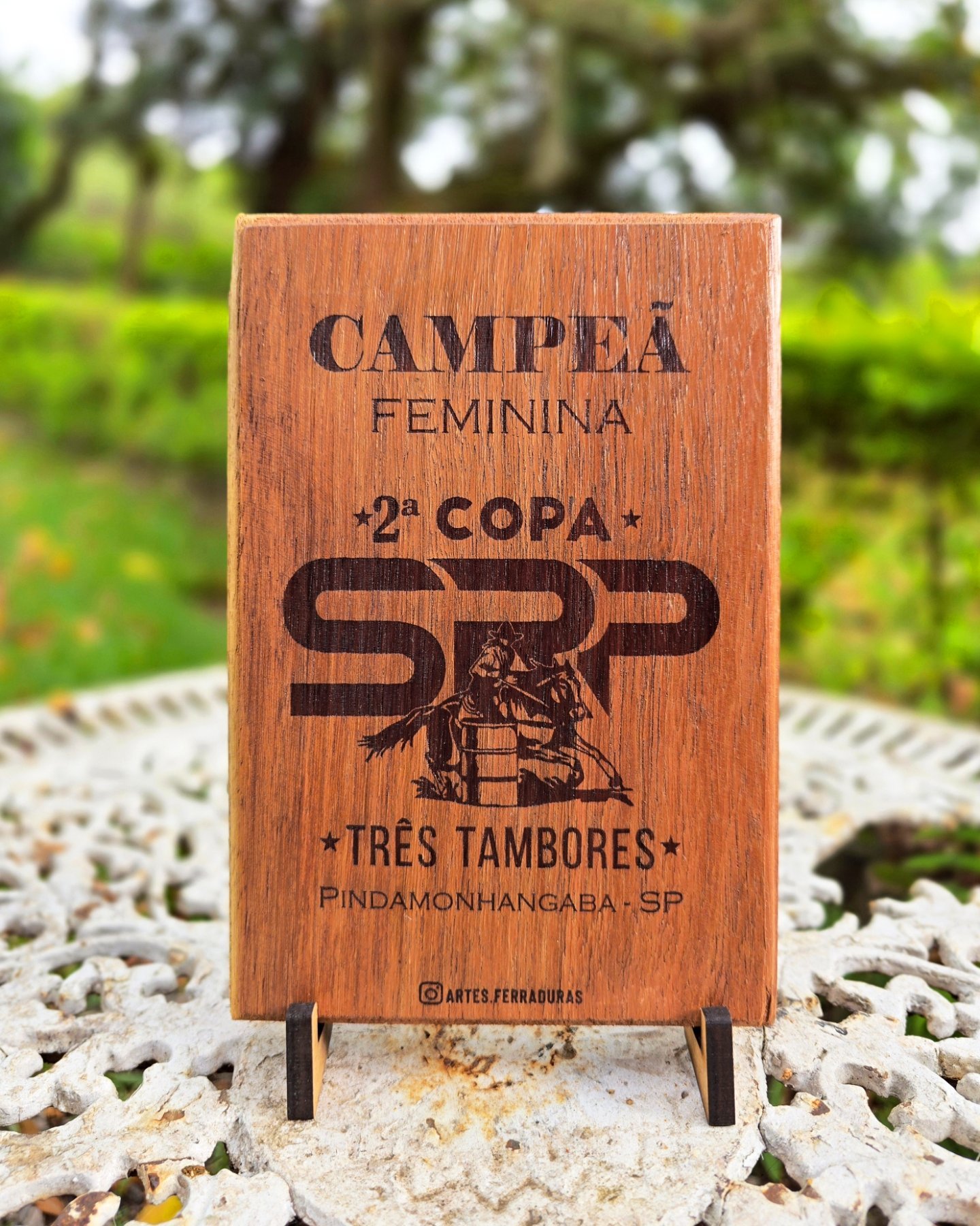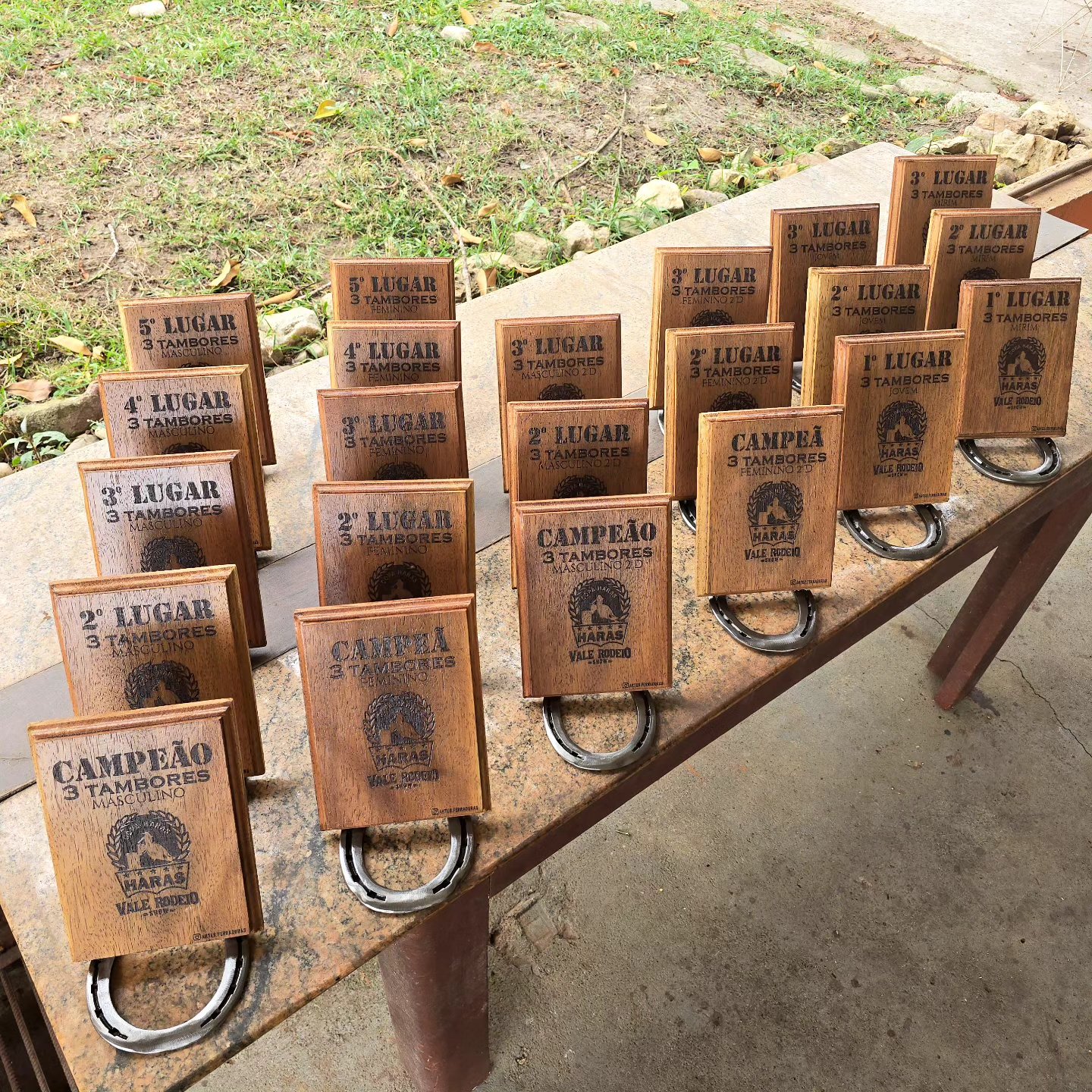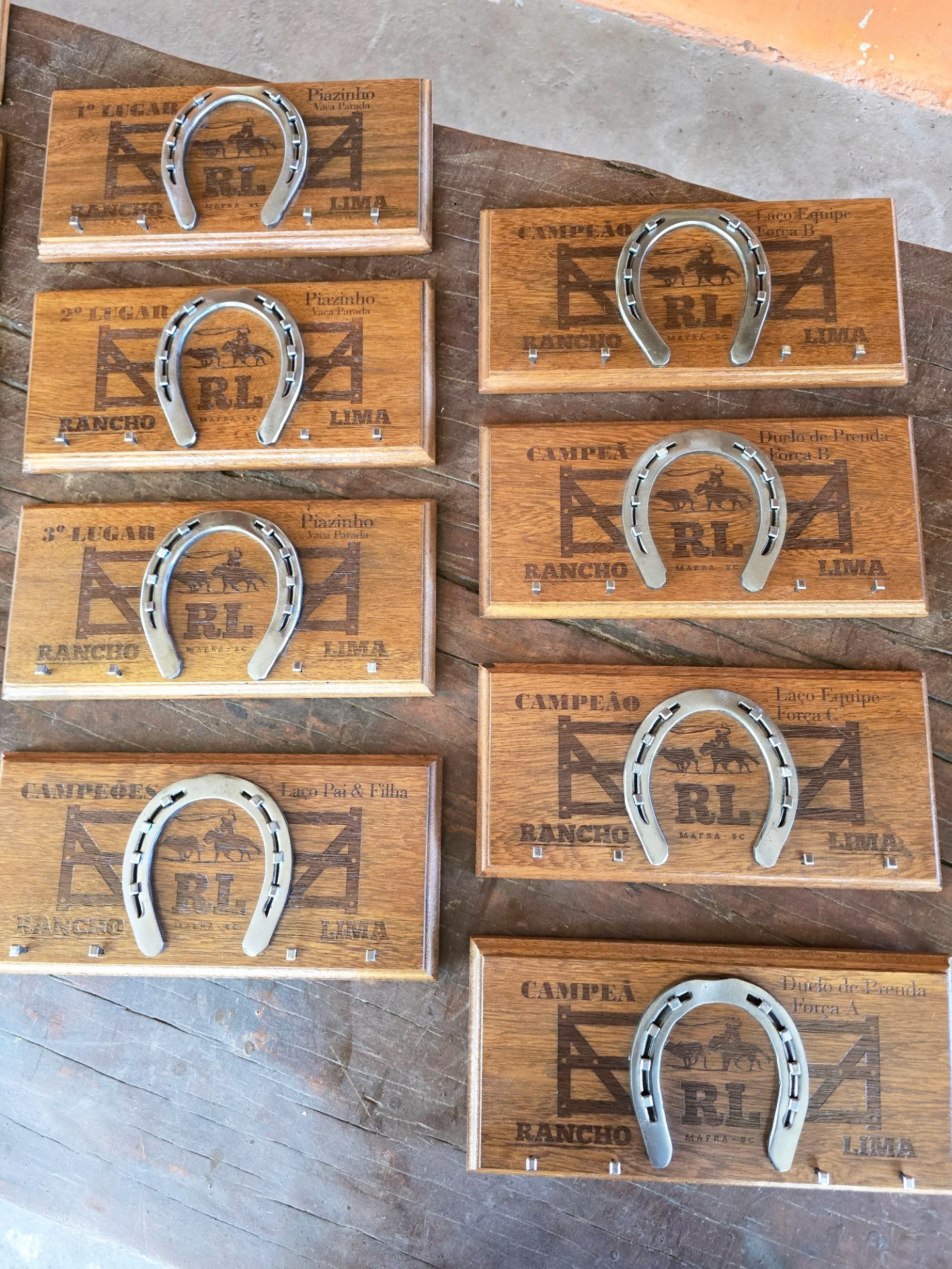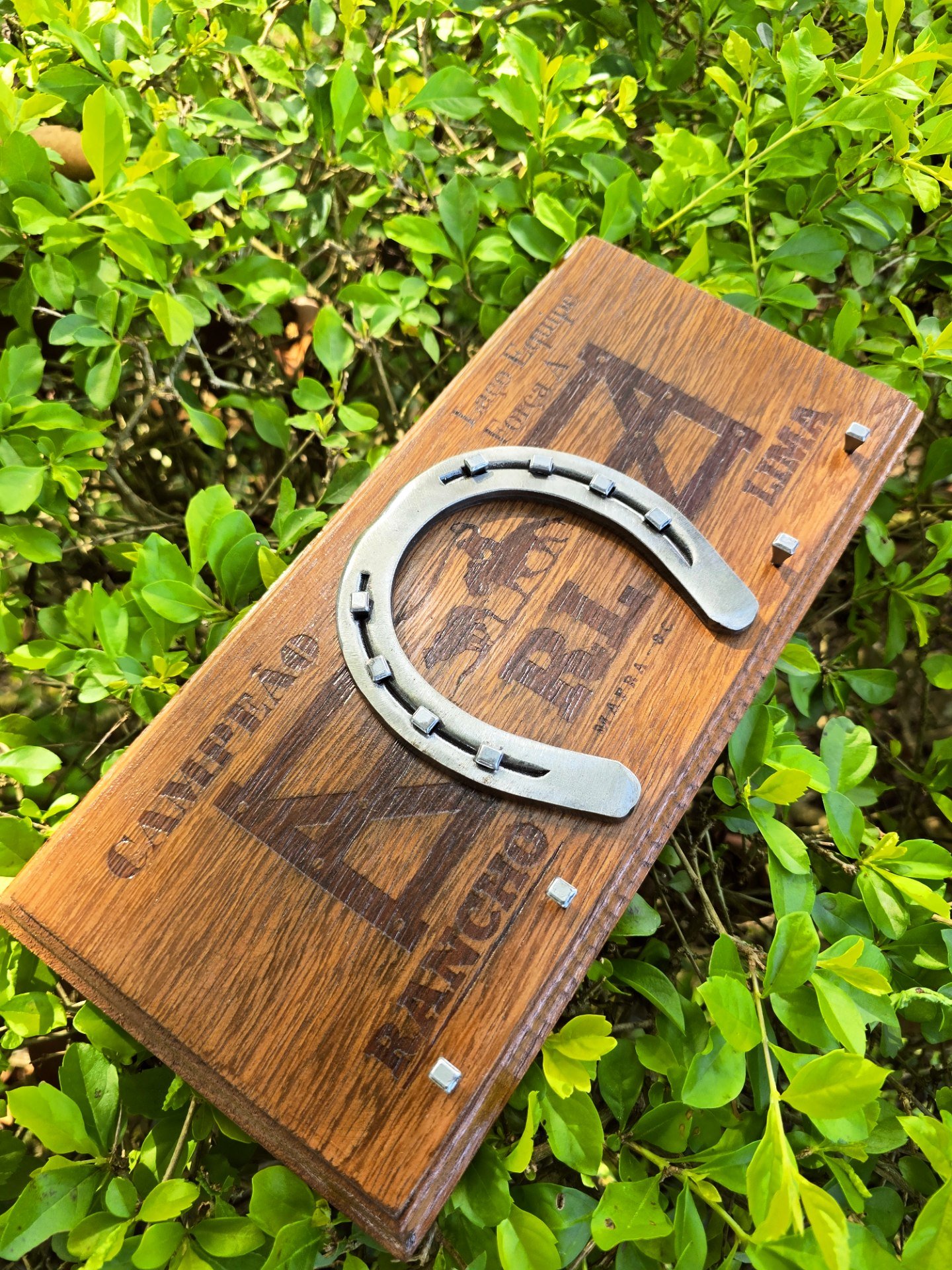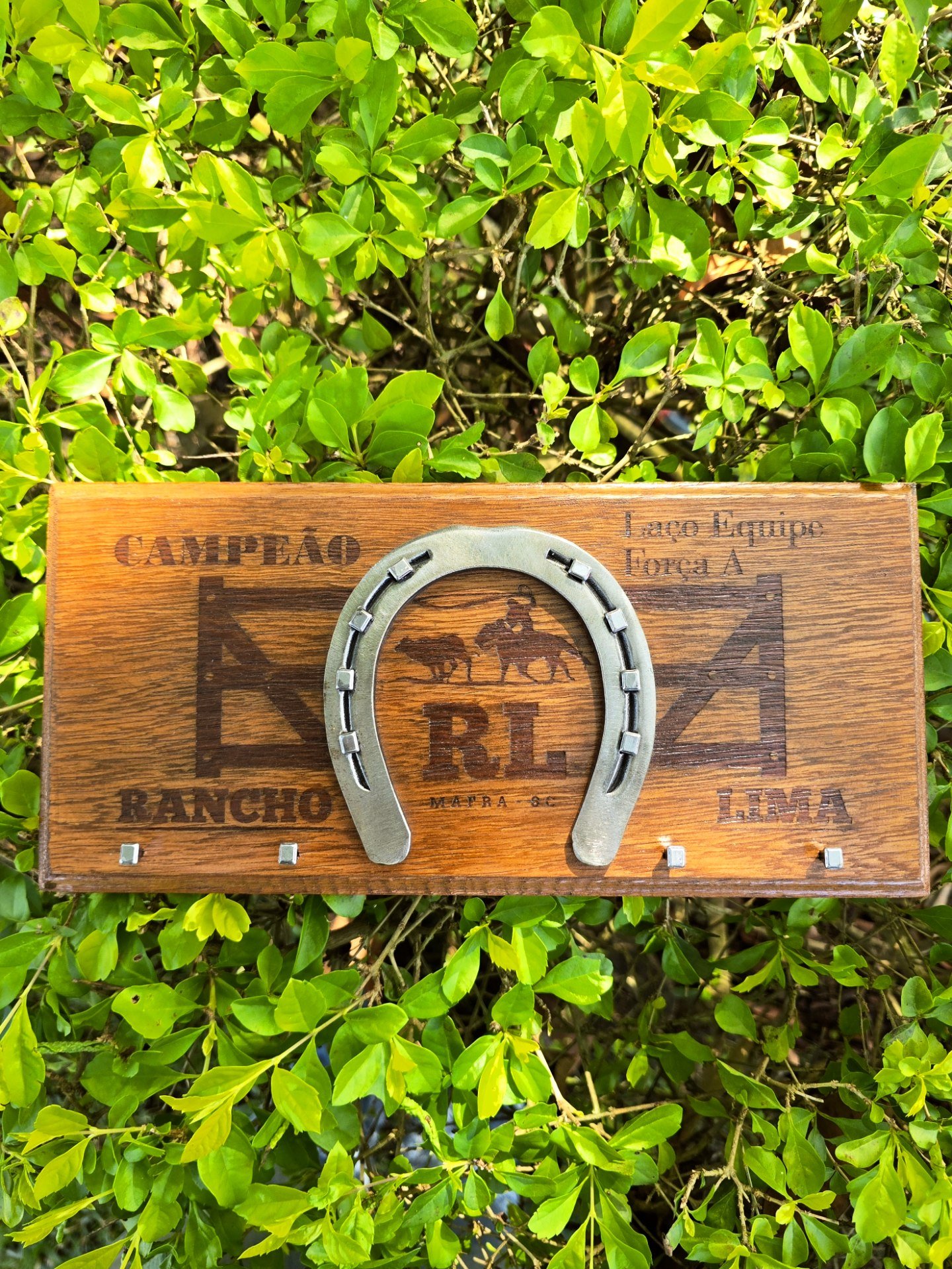 Troféu com ferradura, base de madeira, personalizado para o seu evento. Valor para no mínimo 12 unidades.