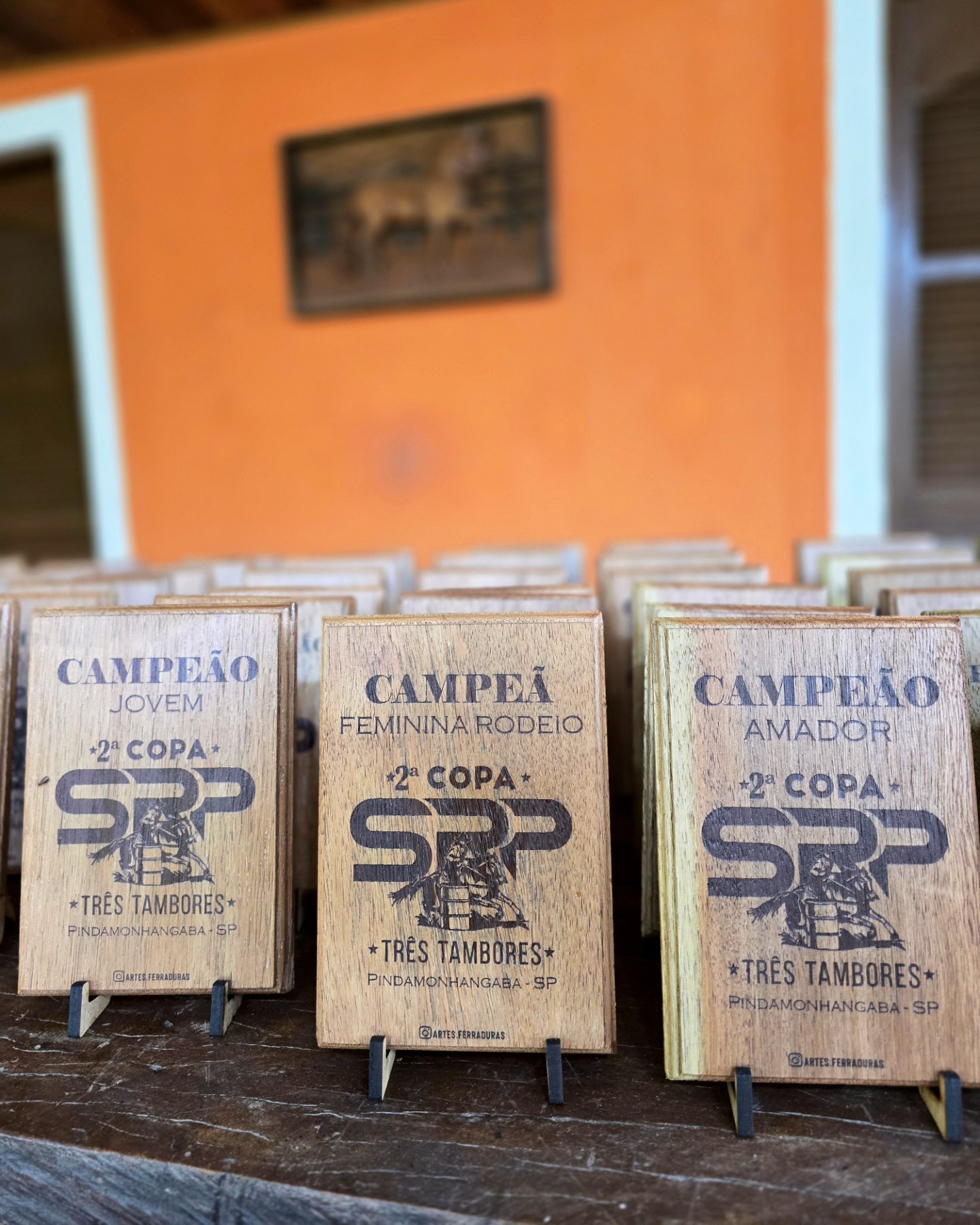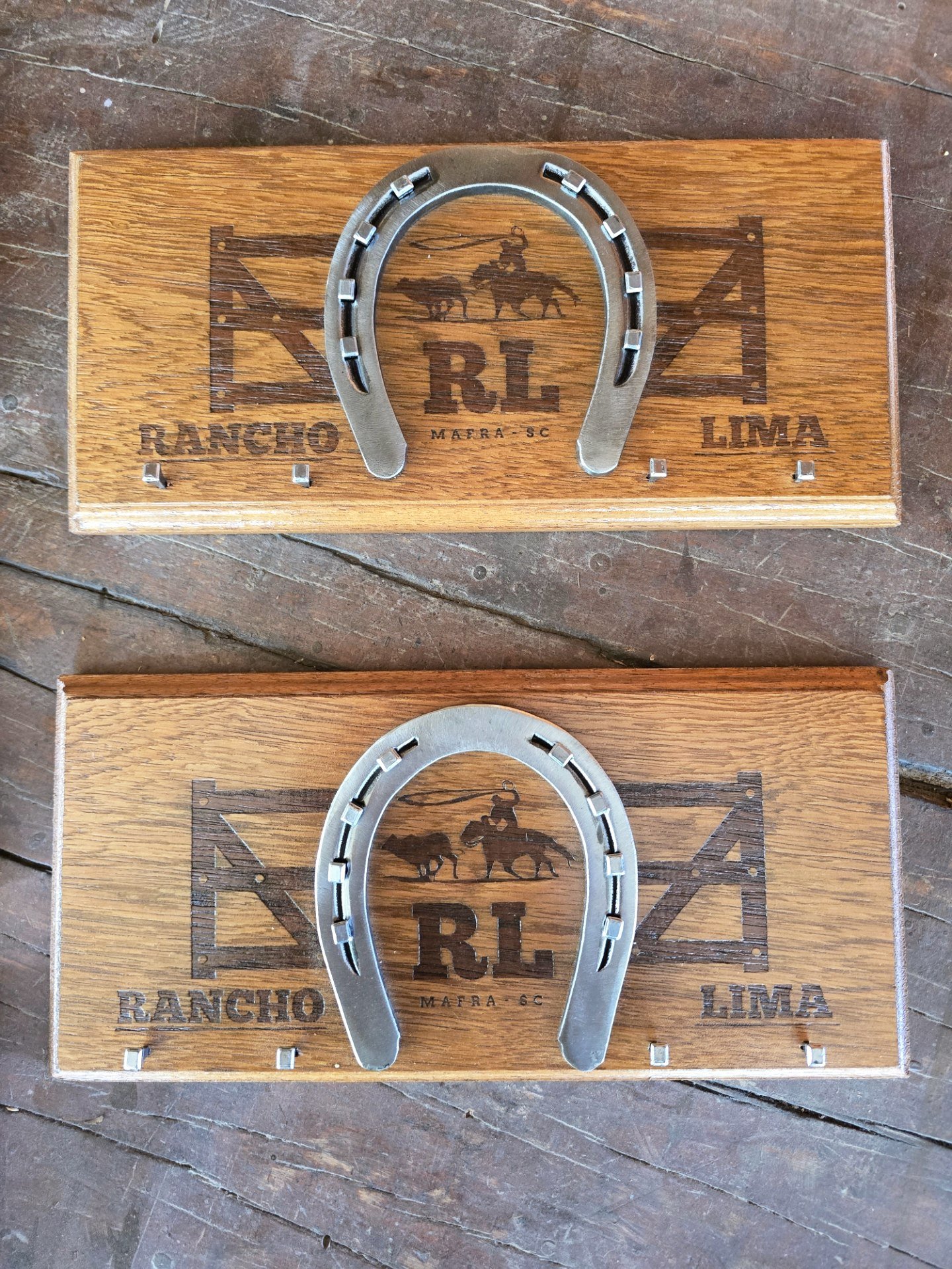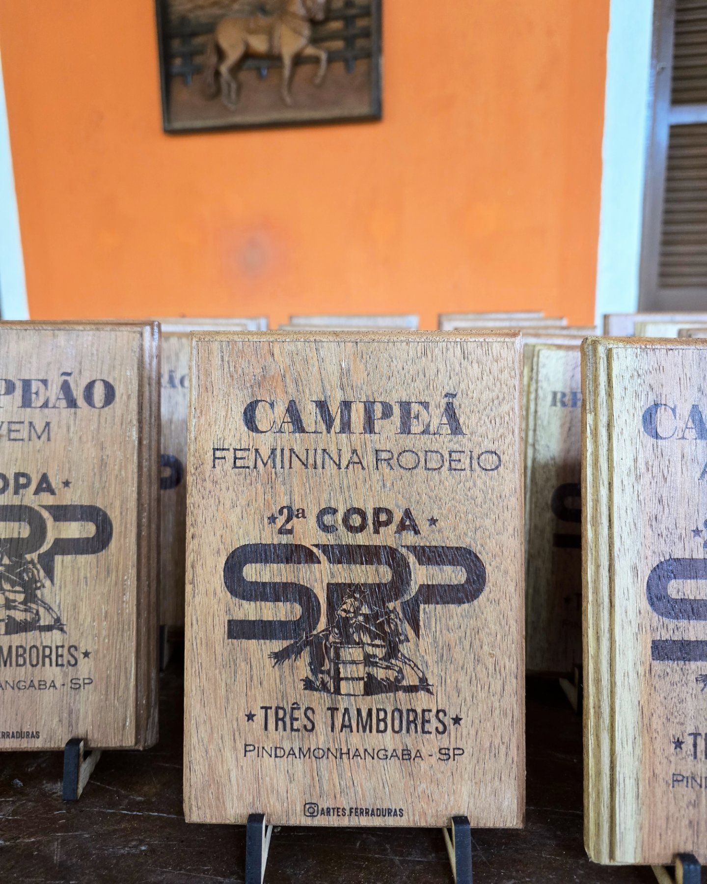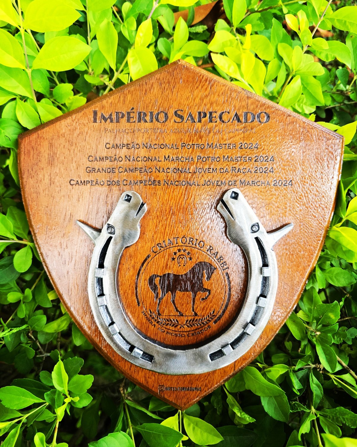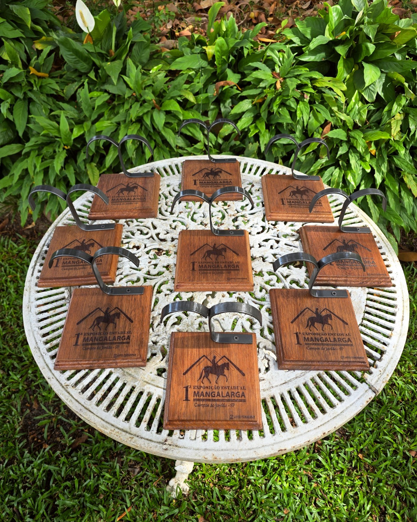 Troféu com ferradura, base de madeira, personalizado para o seu evento. Valor para no mínimo 12 unidades.
