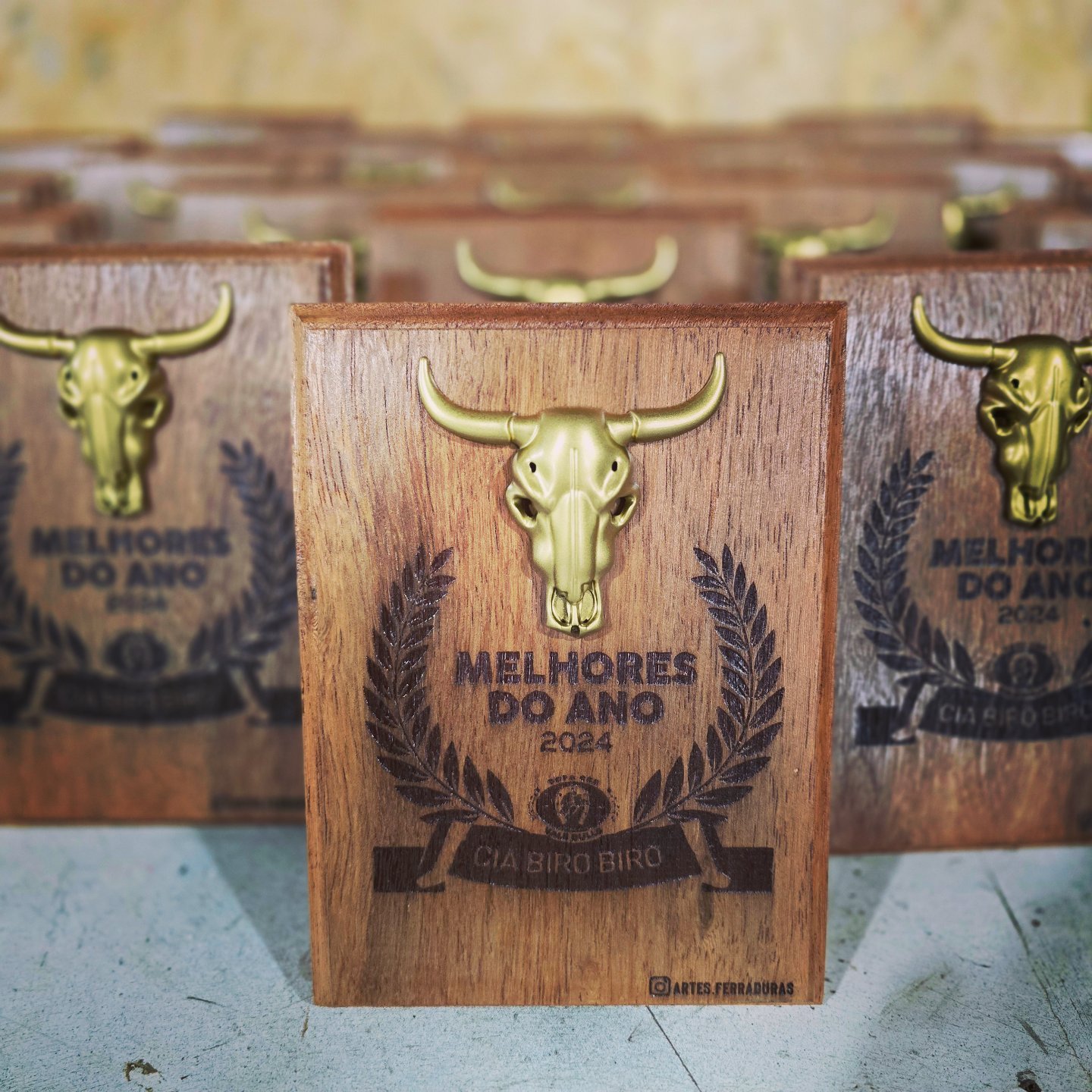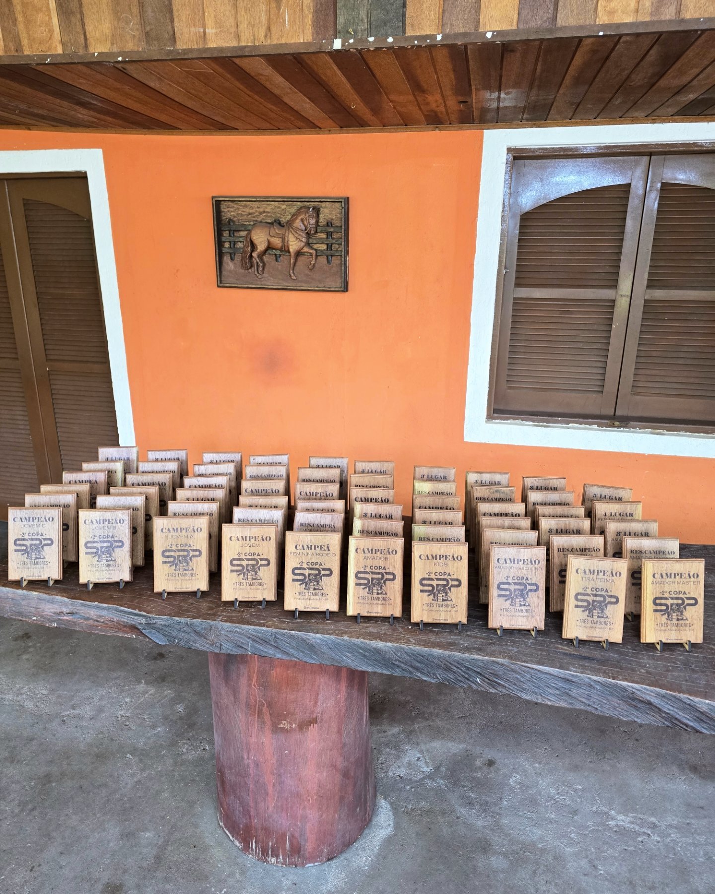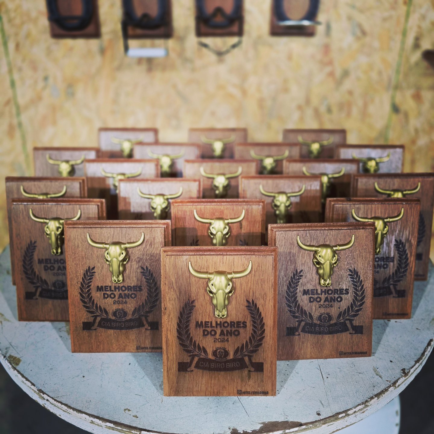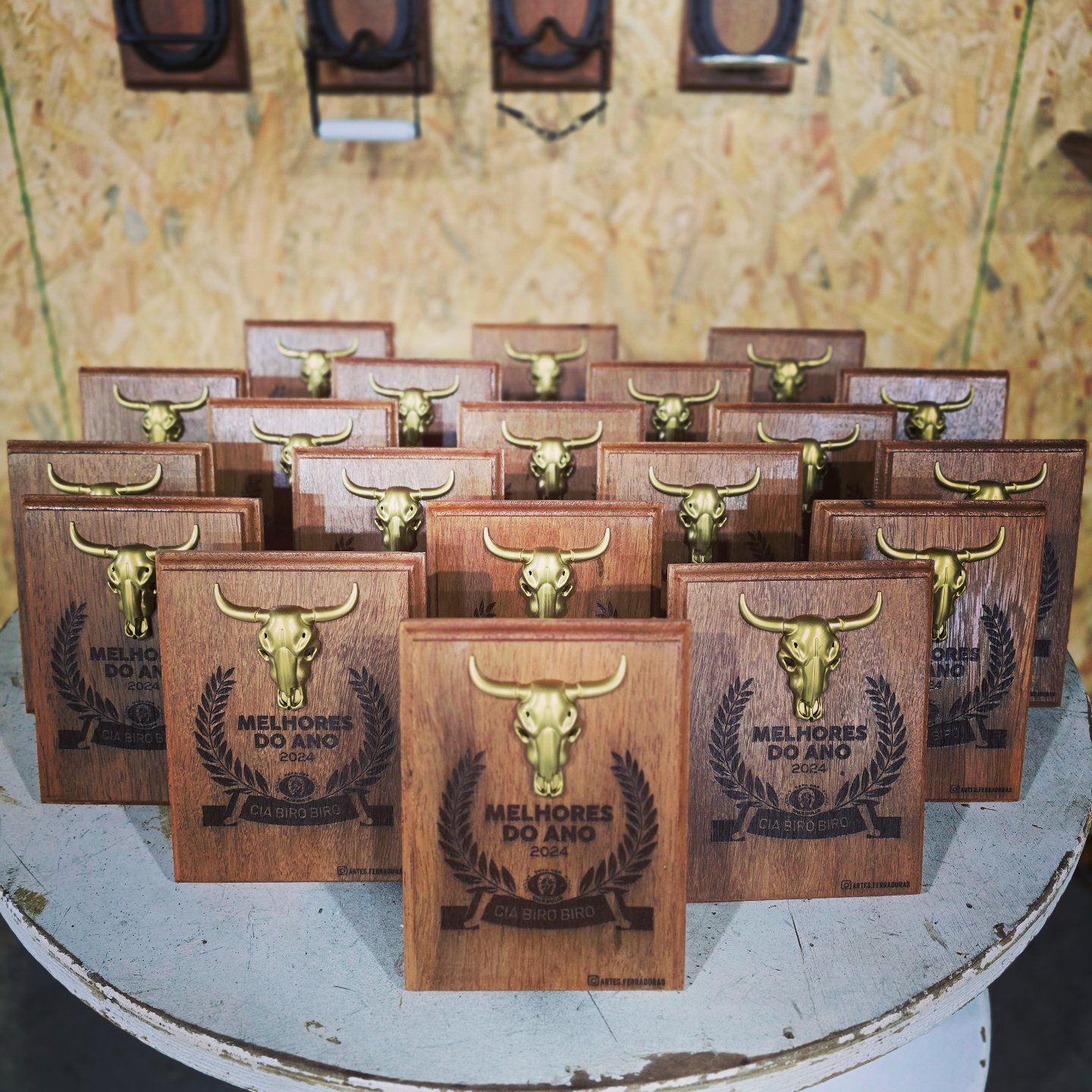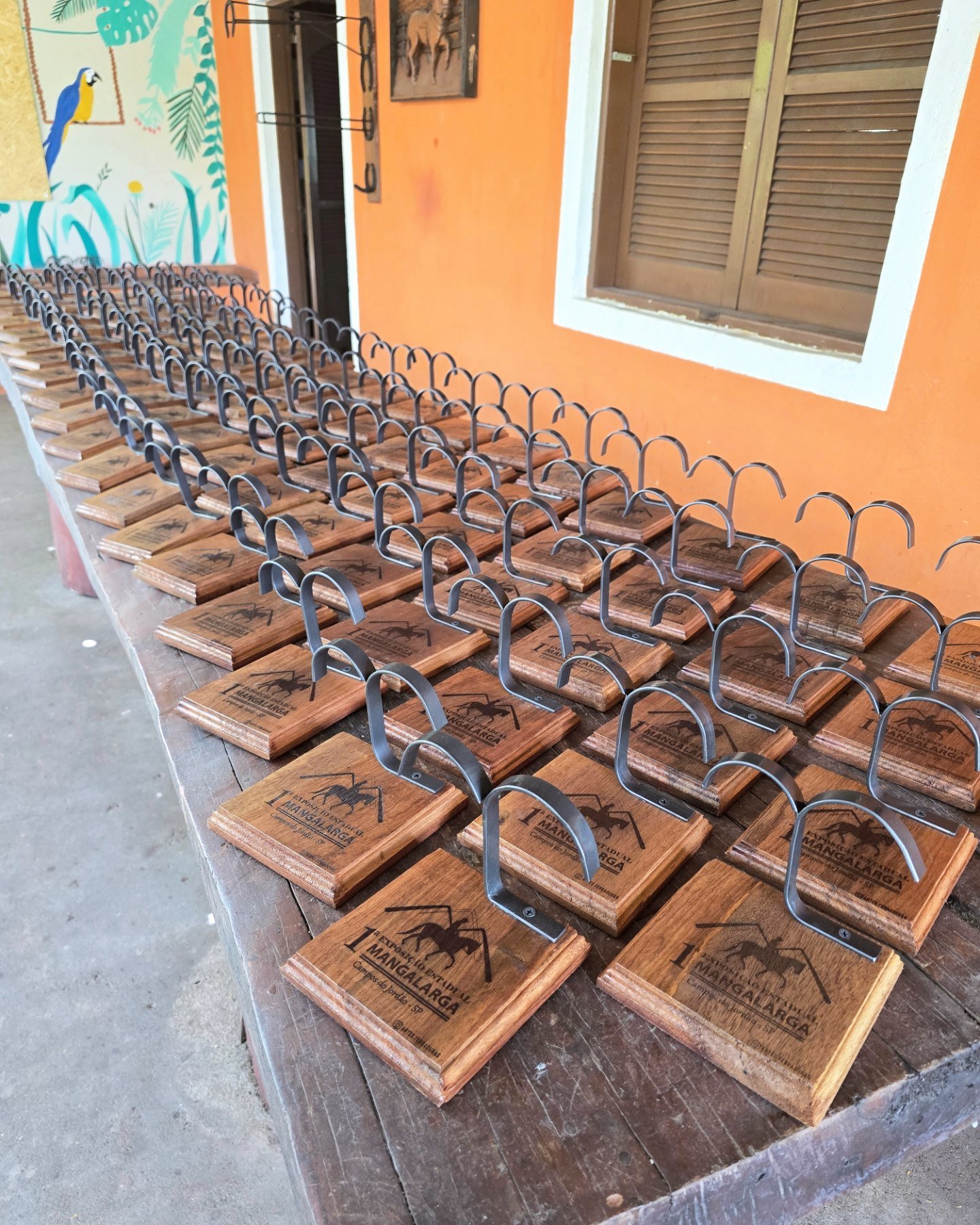 Troféu com ferradura, base de madeira, personalizado para o seu evento. Valor para no mínimo 12 unidades.