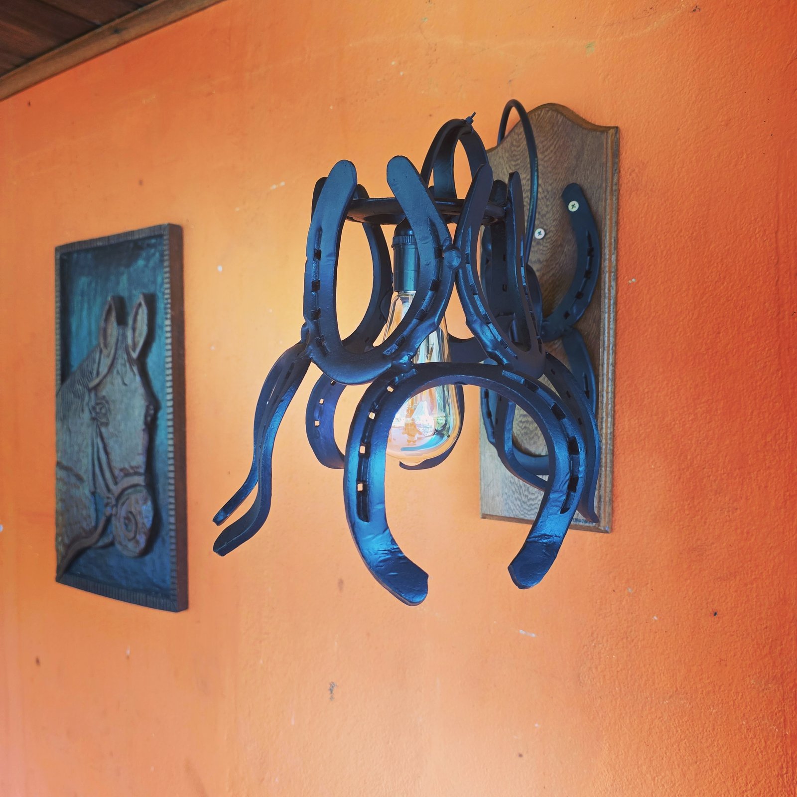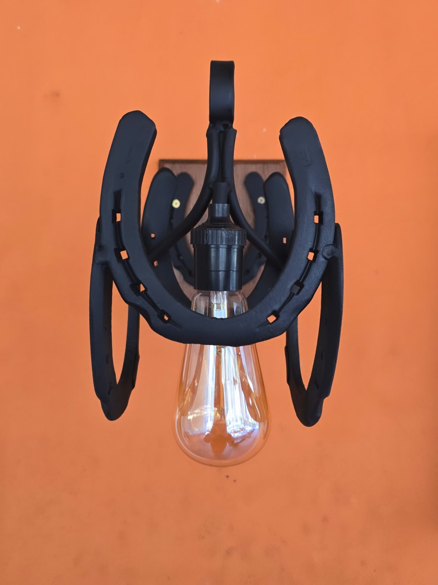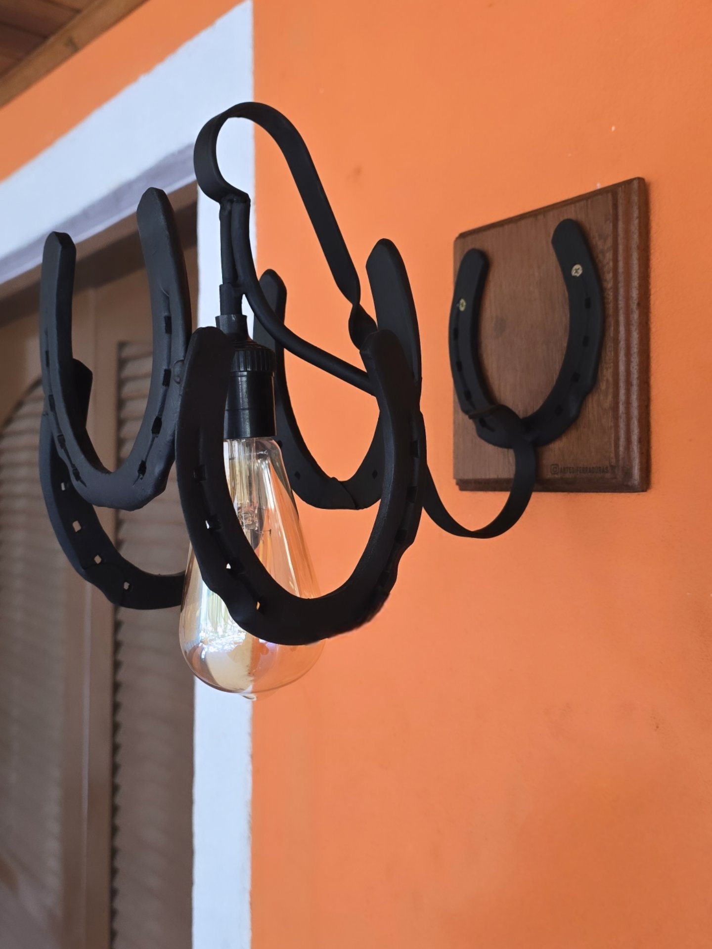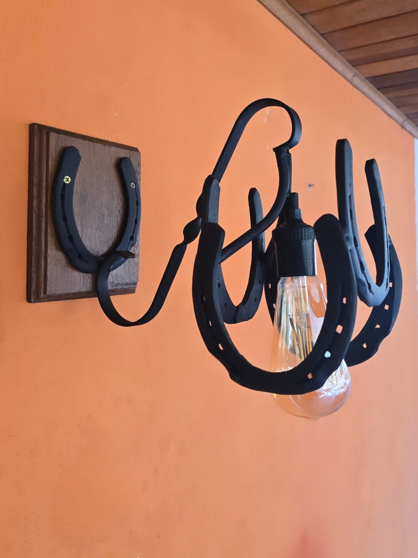 Arandela feita de ferraduras, base de madeira. Um Charme na Iluminação de qualquer Ambiente. Acompanha parafuso e bucha para fixação na parede.