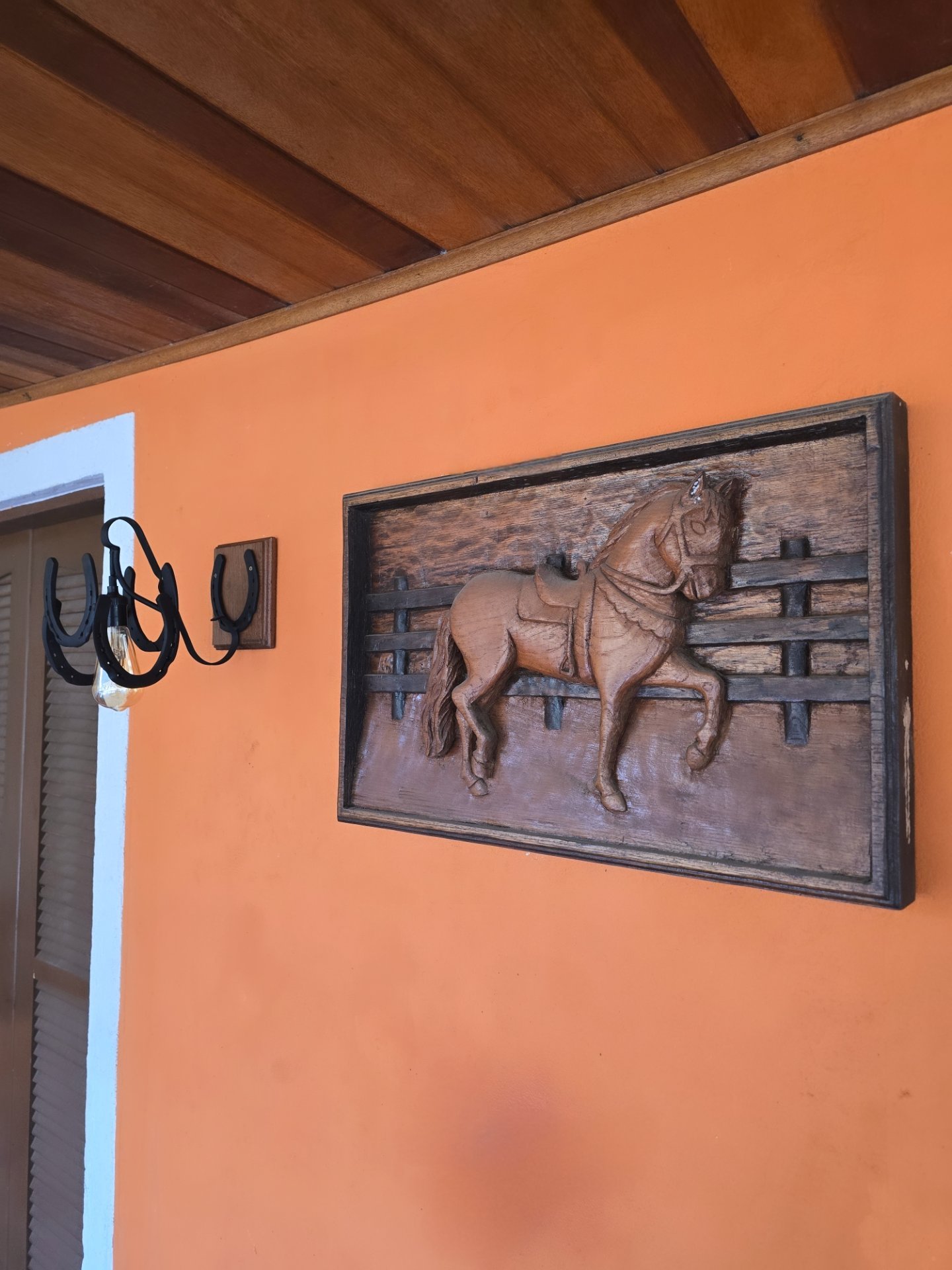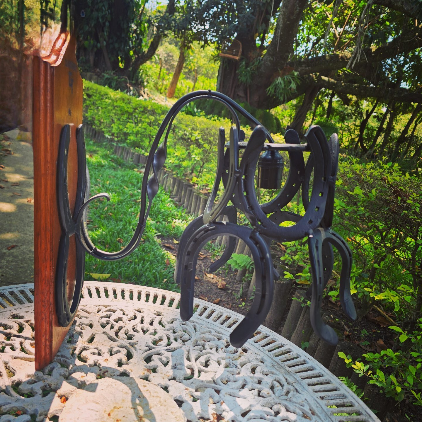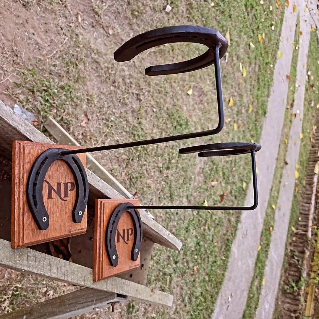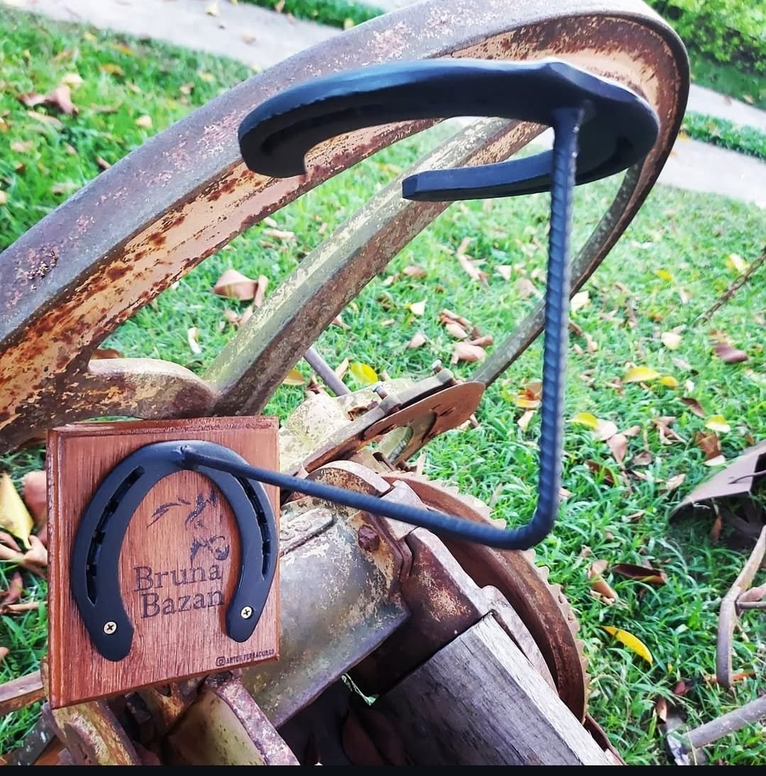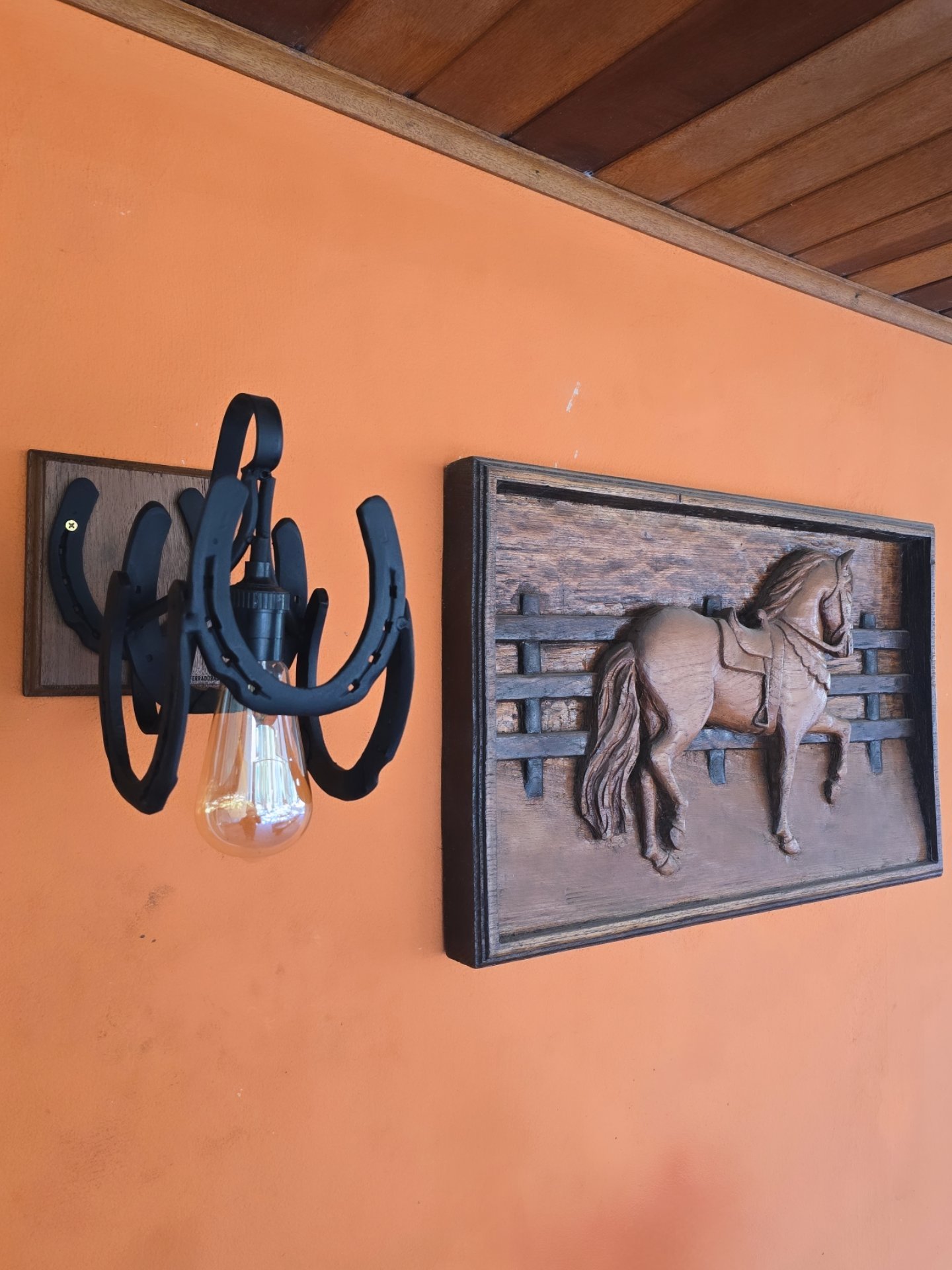 Arandela feita de ferraduras, base de madeira. Um Charme na Iluminação de qualquer Ambiente. Acompanha parafuso e bucha para fixação na parede.