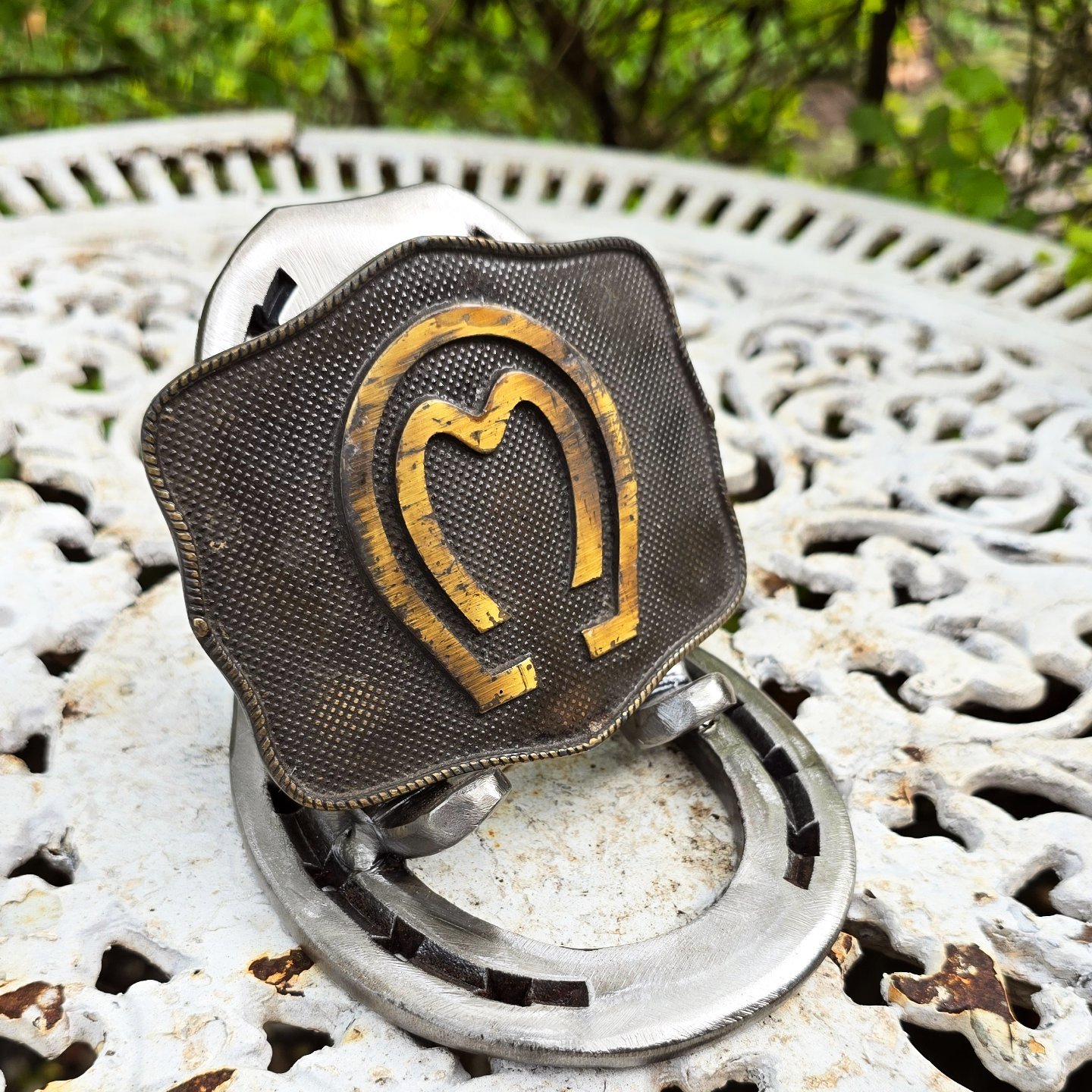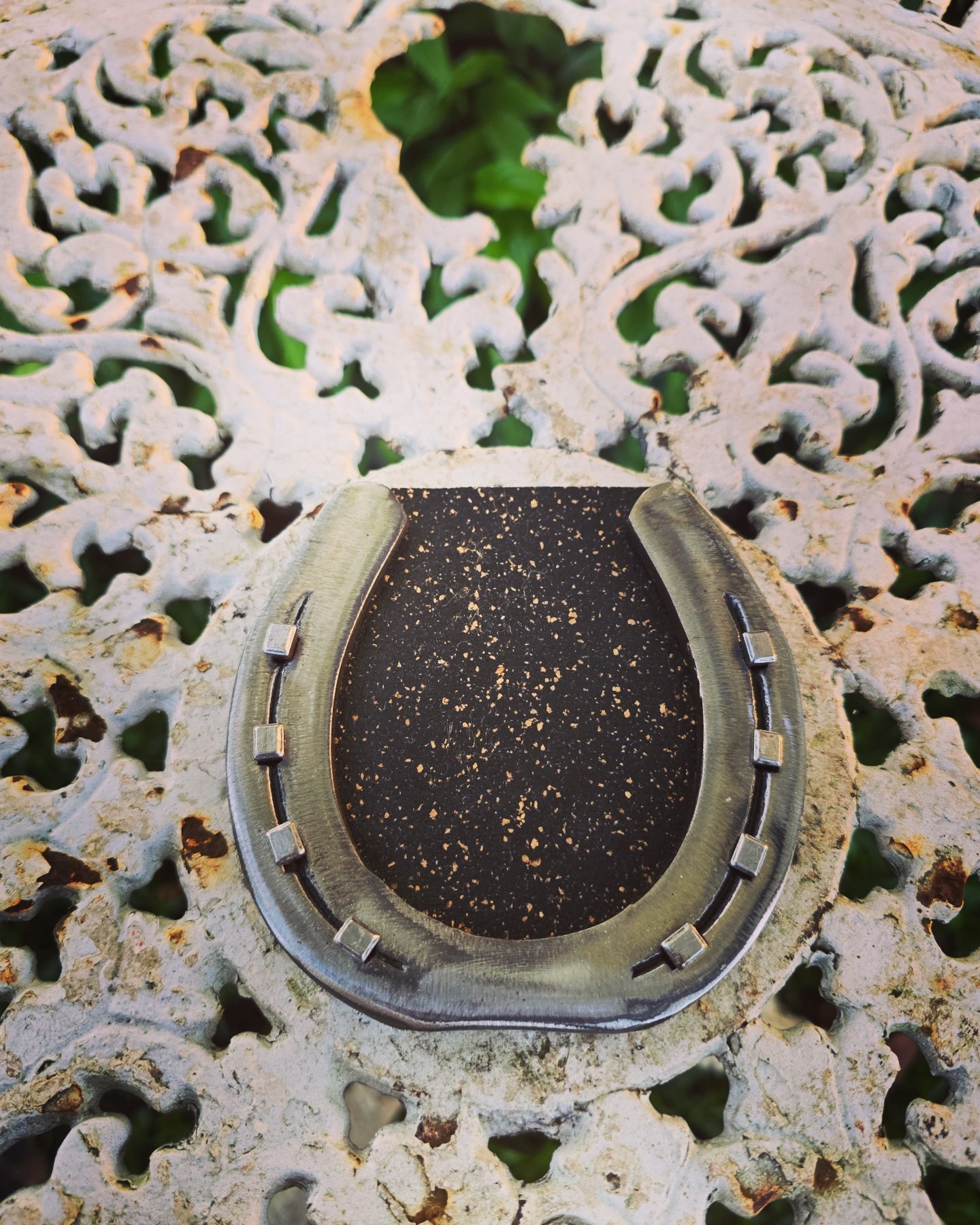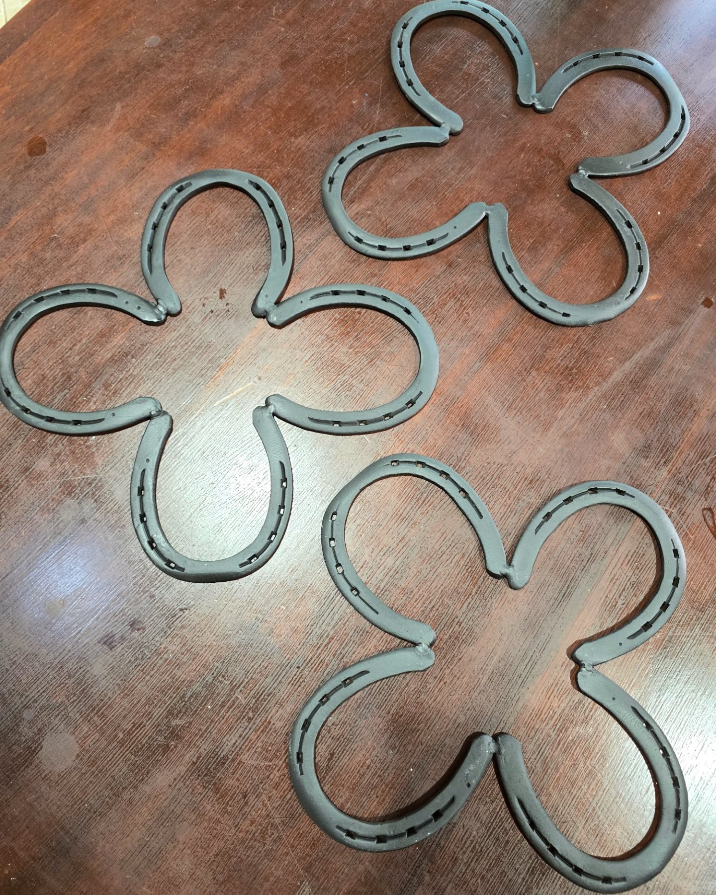 Apoio de panela ou travessa feito em ferraduras.