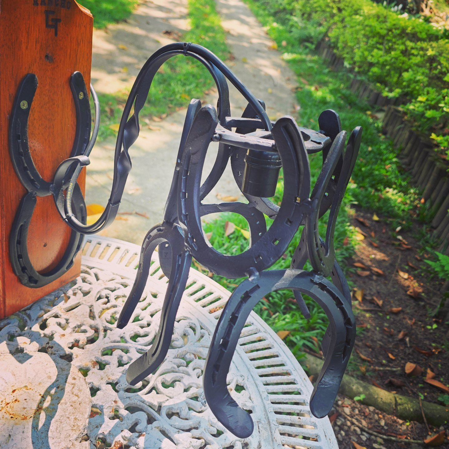 Arandela feita de ferraduras, Ideal para iluminar varandas e corredores de baias. Acompanha parafuso e bucha para fixação na parede.