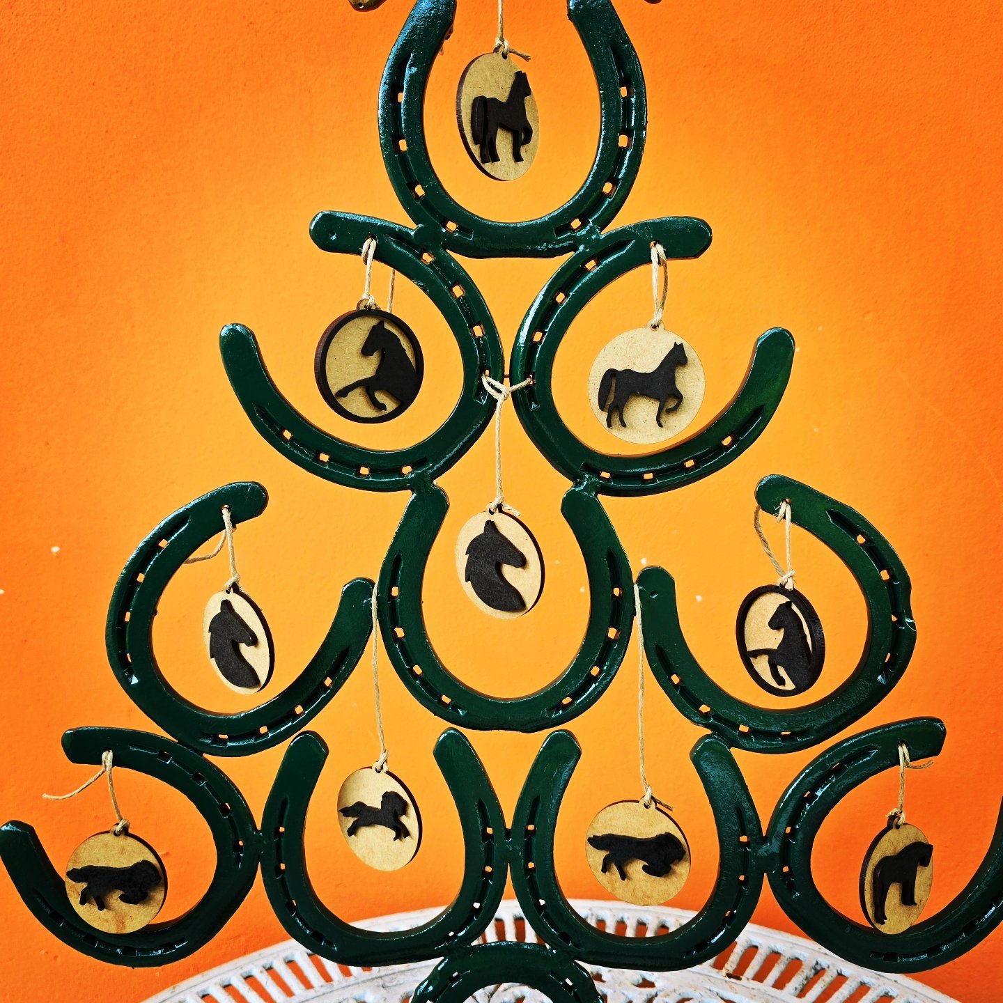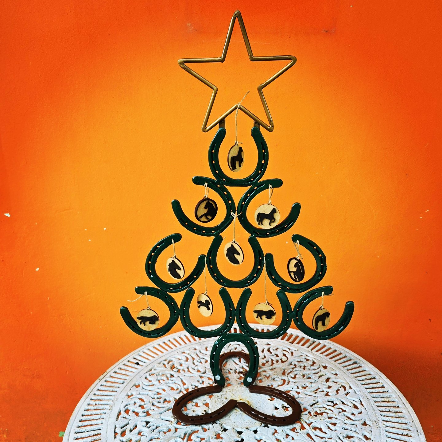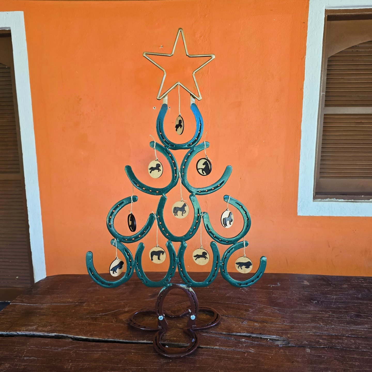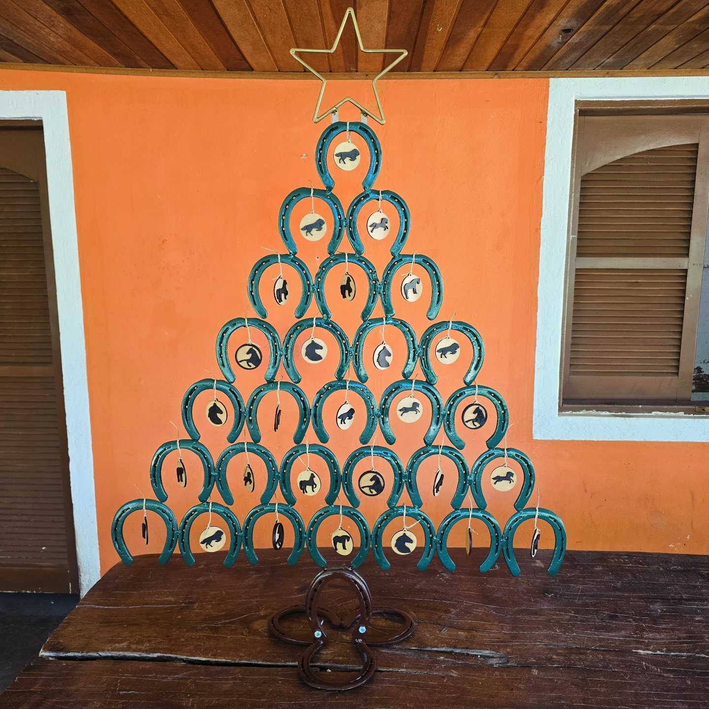 Árvore de ferraduras desmontável, inclui enfeites decorativos. Altura 1.20cm. Valor sem Enfeites 250,00
