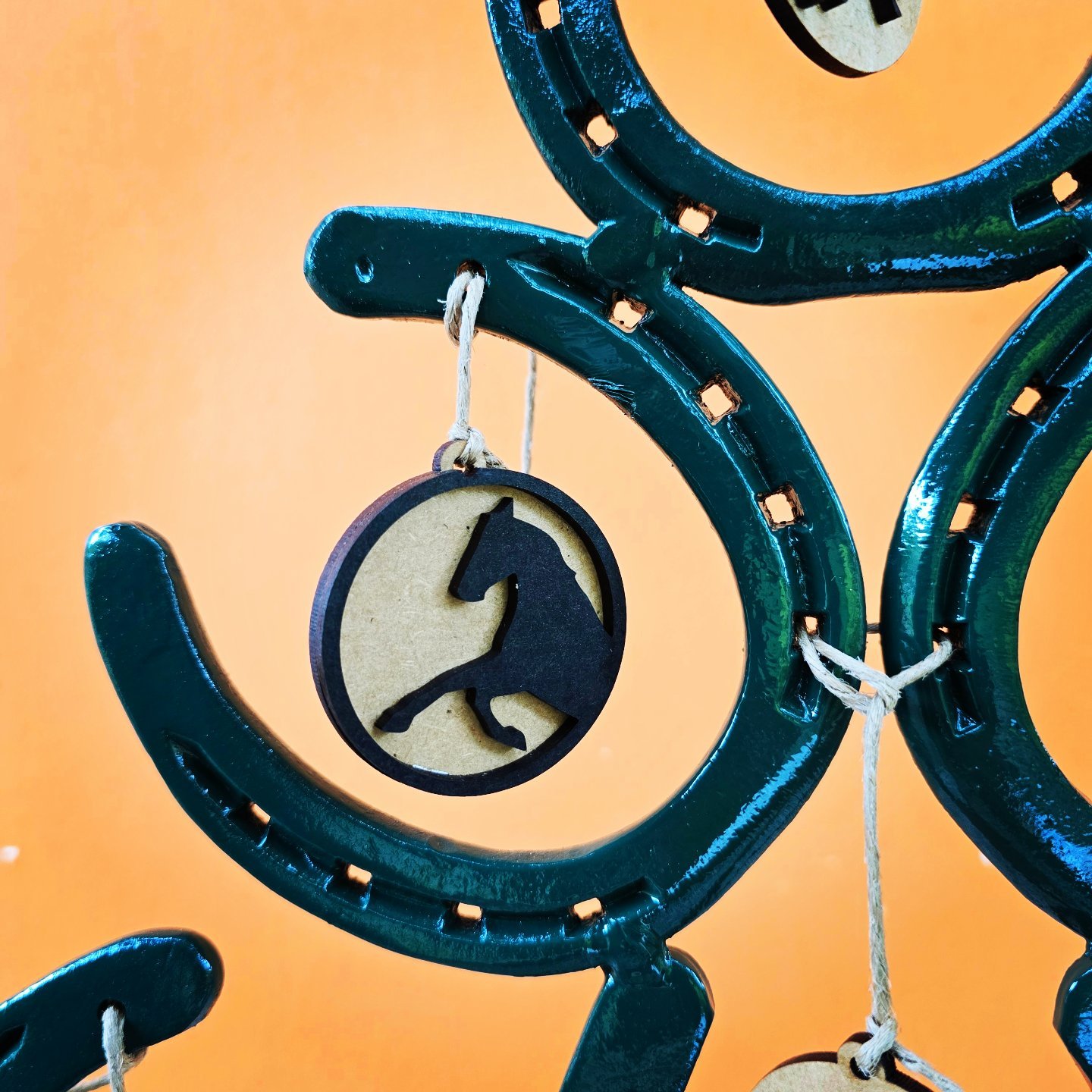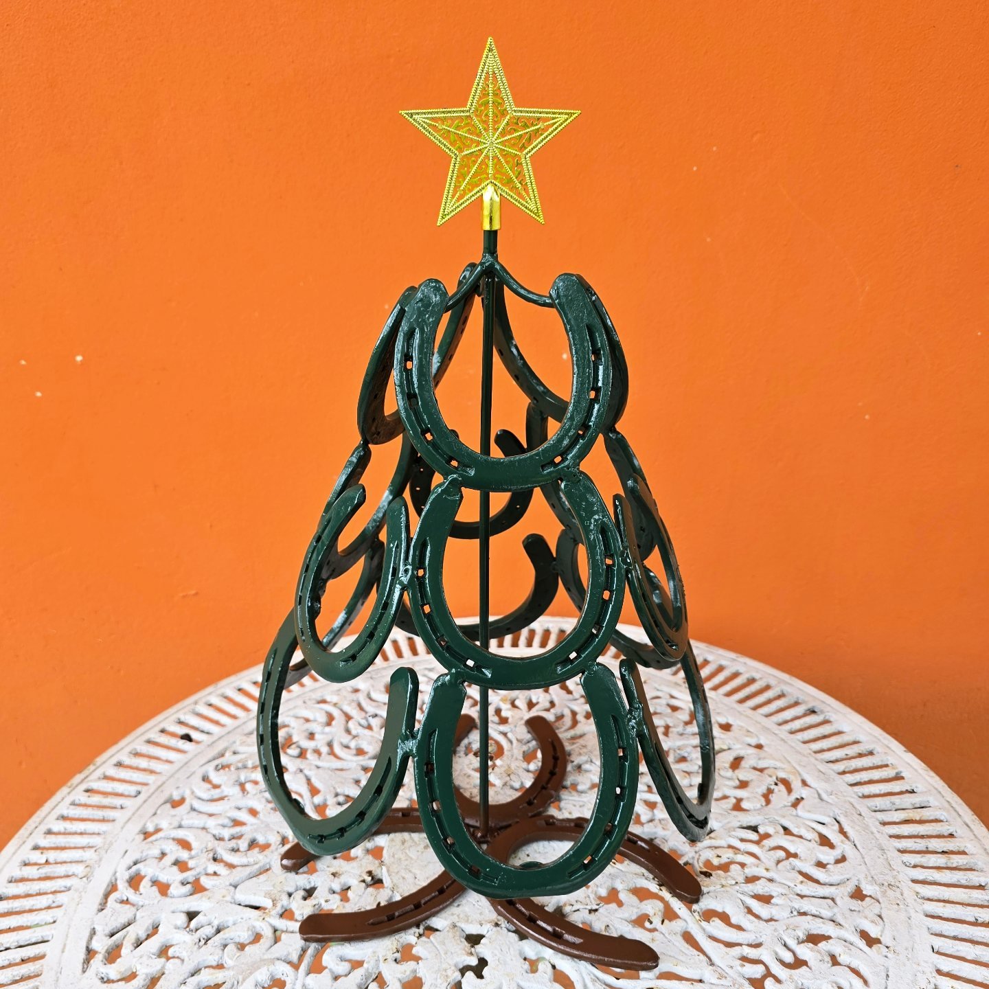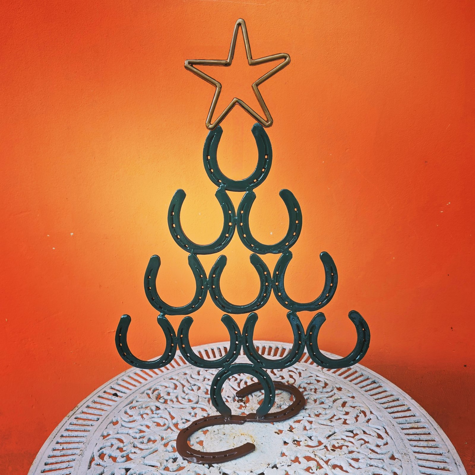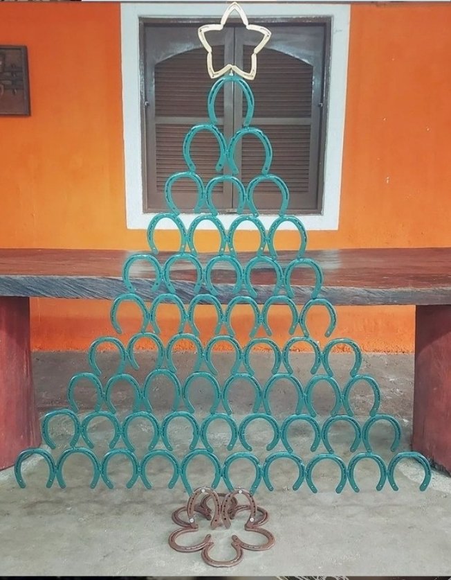Árvore de ferraduras em formato de pinheiro. Tamanho médio de 50cm. Não é desmontável.