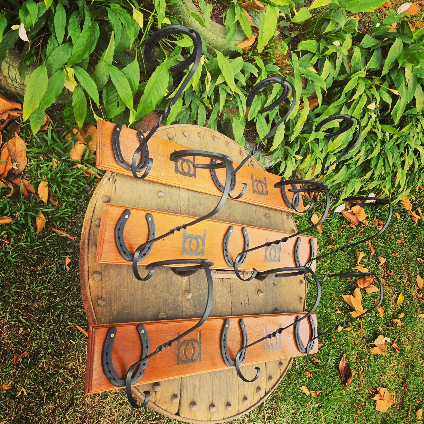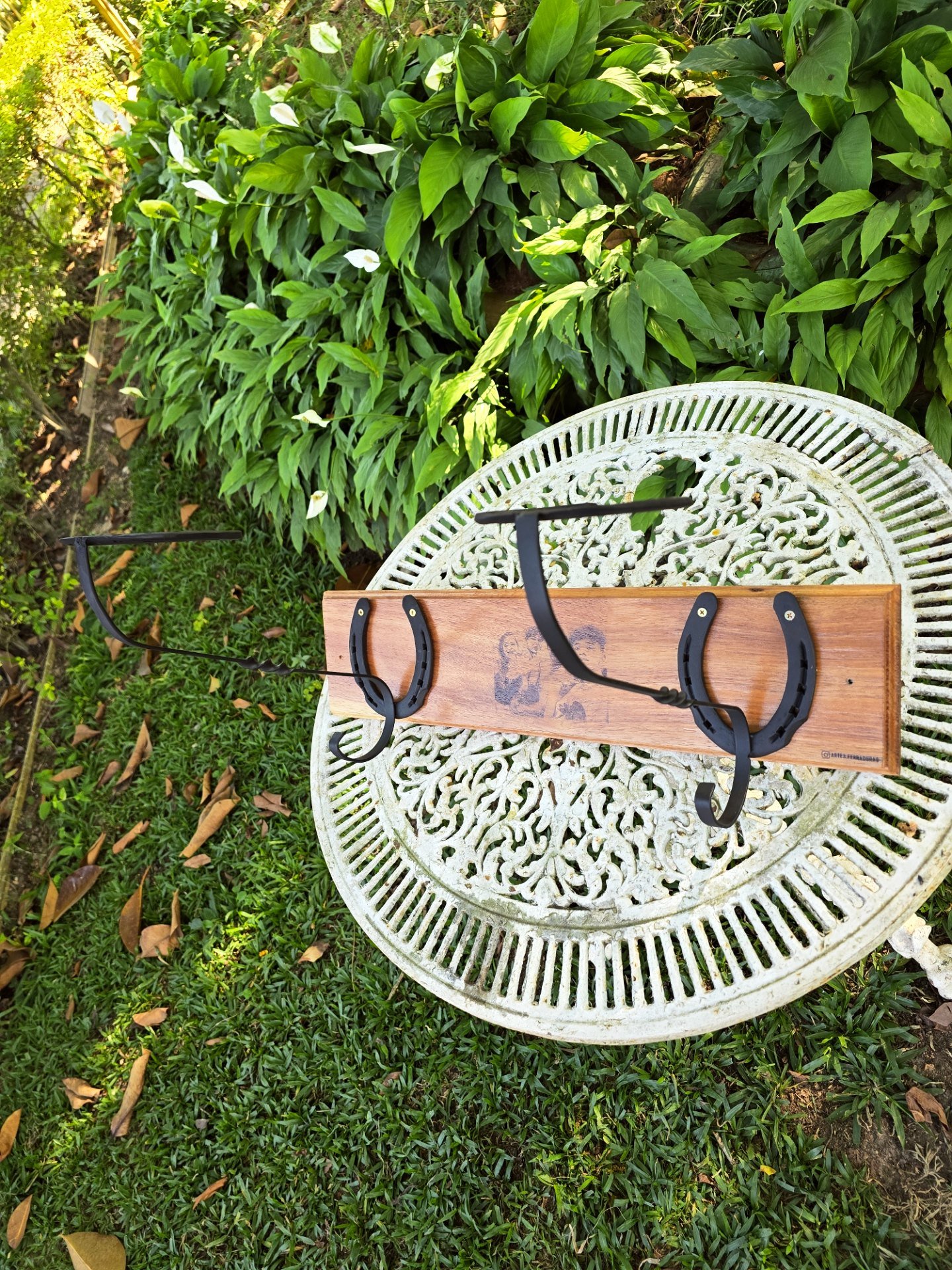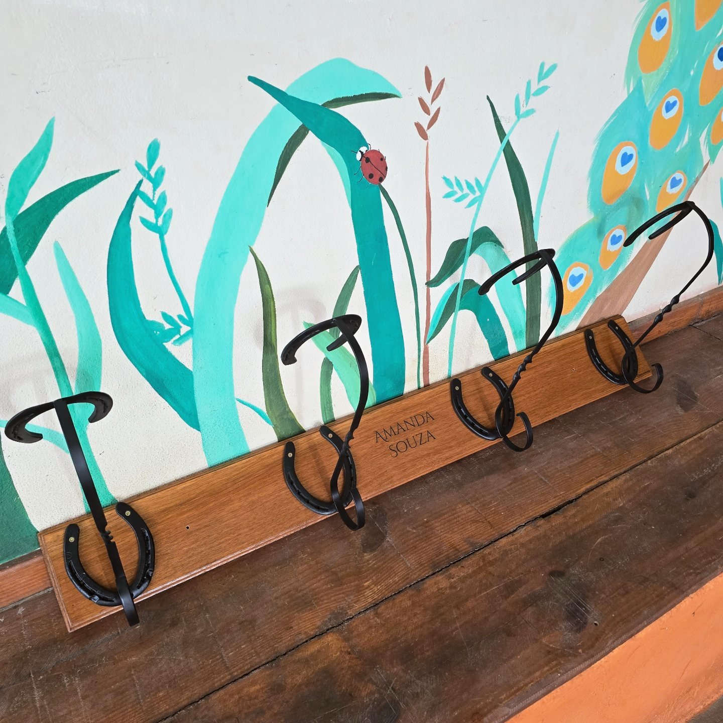 Suporte para 4 chapéus, na horizontal, com design Colonial formando um gancho na parte inferior possibilitando a pendurar bonés ou acessório. Base em madeira, podendo ser personalizado com Nome/Logomarca. Comprimento 120cm.