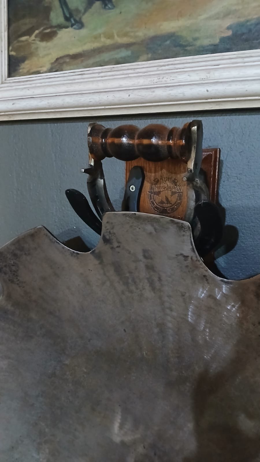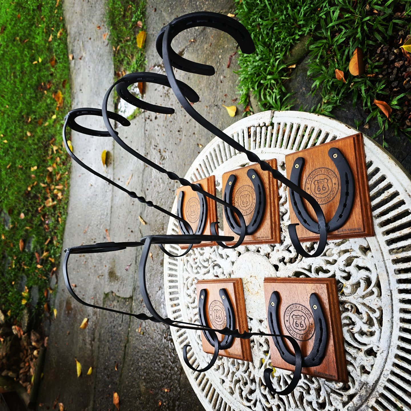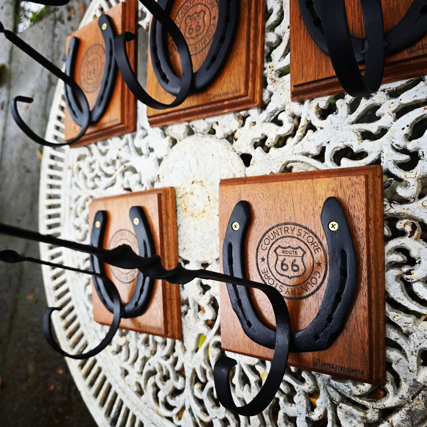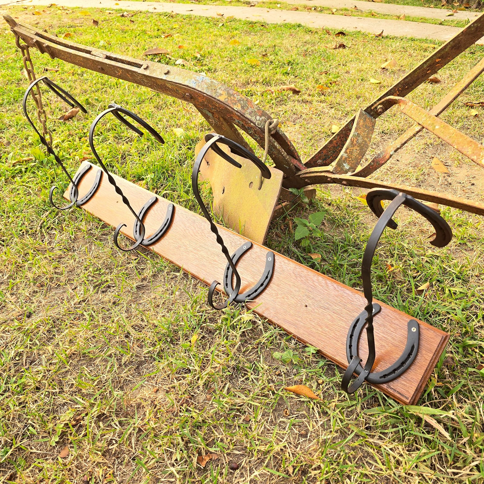 Suporte para 4 chapéus, na horizontal, com design Colonial formando um gancho na parte inferior possibilitando a pendurar bonés ou acessório. Base em madeira, podendo ser personalizado com Nome/Logomarca. Comprimento 120cm.