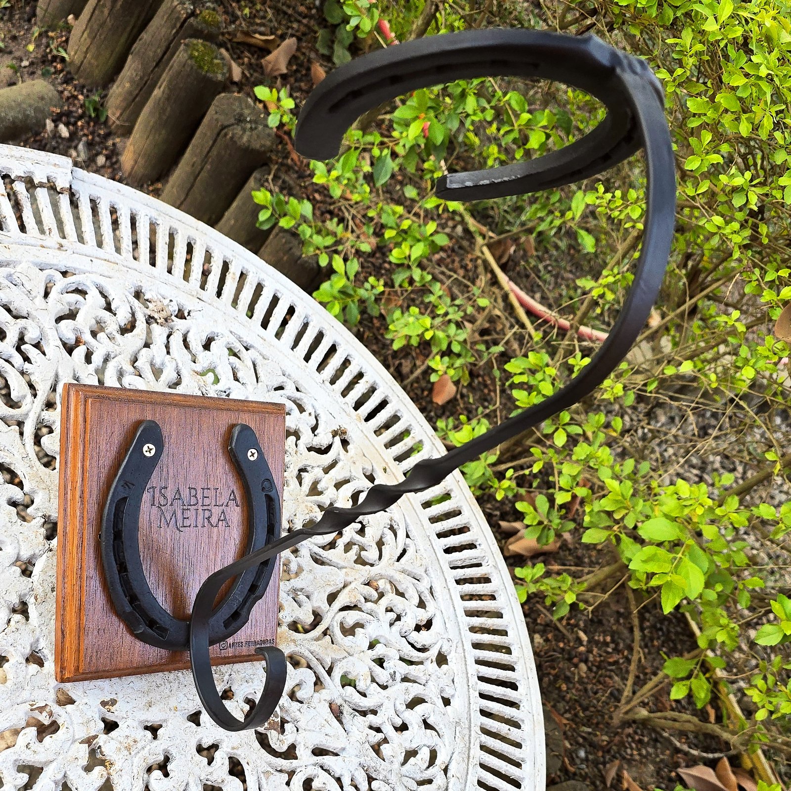 Suporte para 1 Chapéu de todos os modelos e tamanhos, Base em madeira, personalizada com Nome/Logo. Com design Colonial formando um gancho na parte inferior possibilitando a pendurar bonés ou acessório.