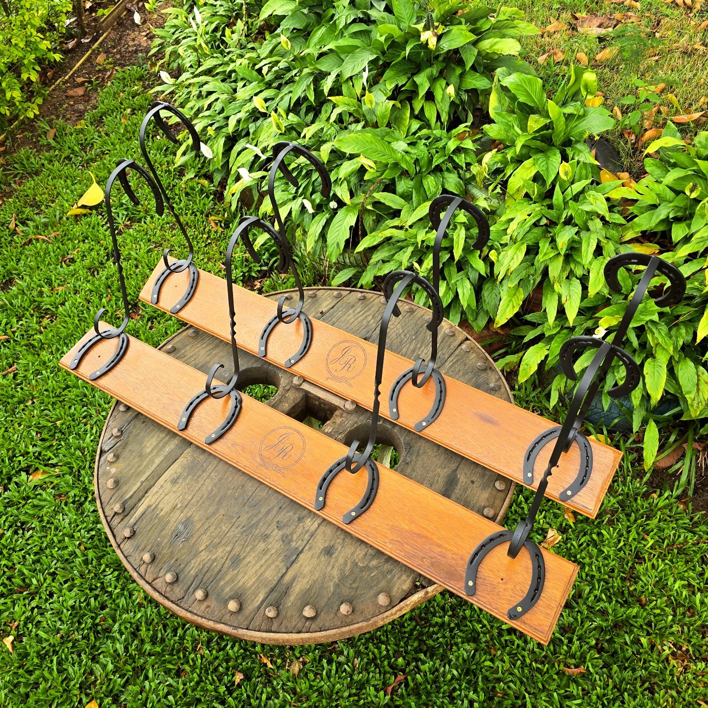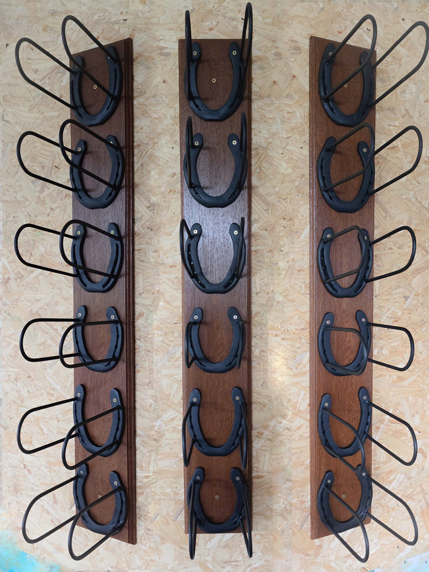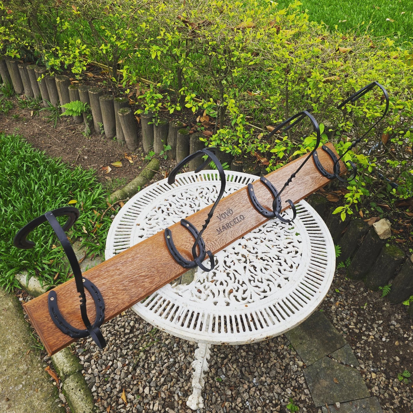 Cabide com espaço para 6 pares de Caneleiras. Com base em madeira.