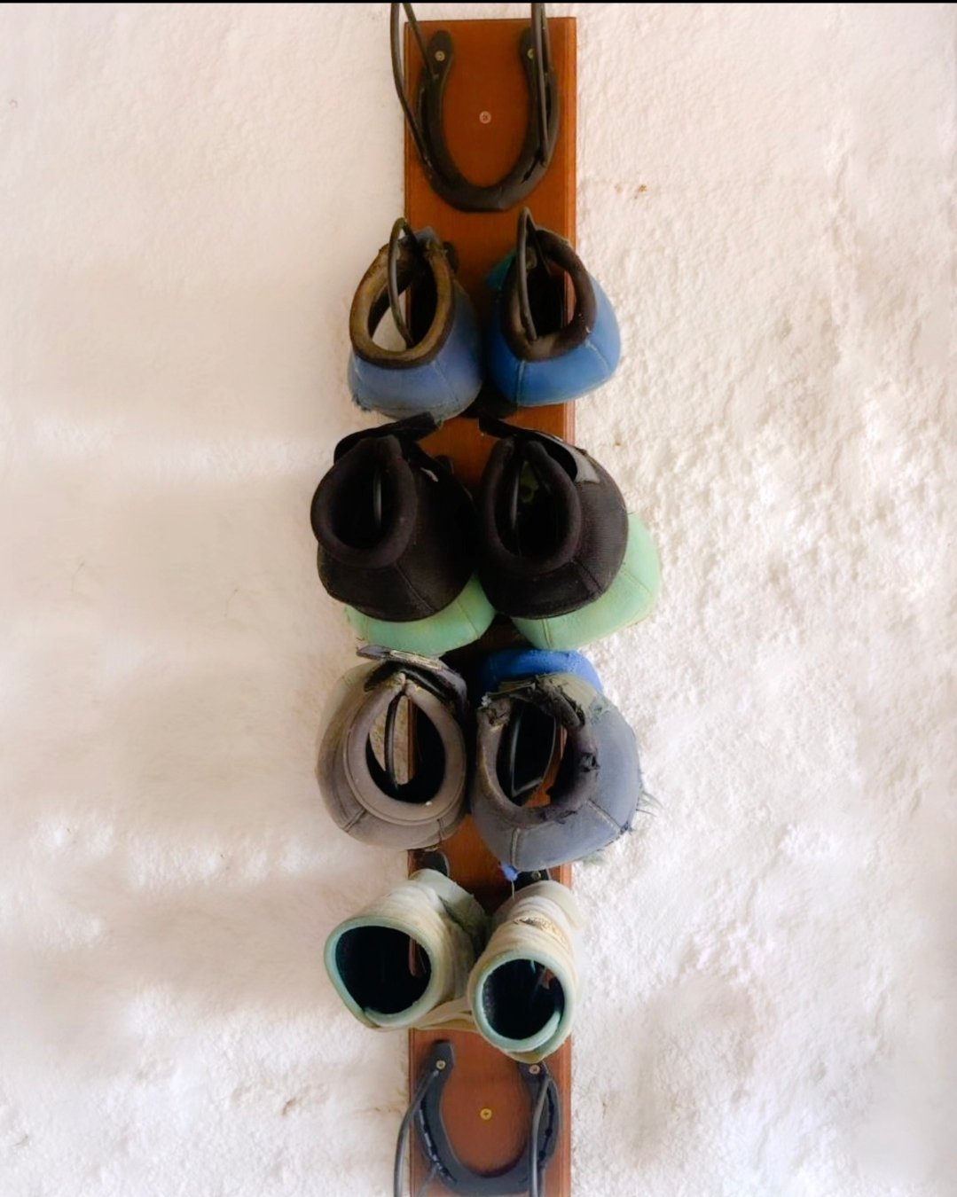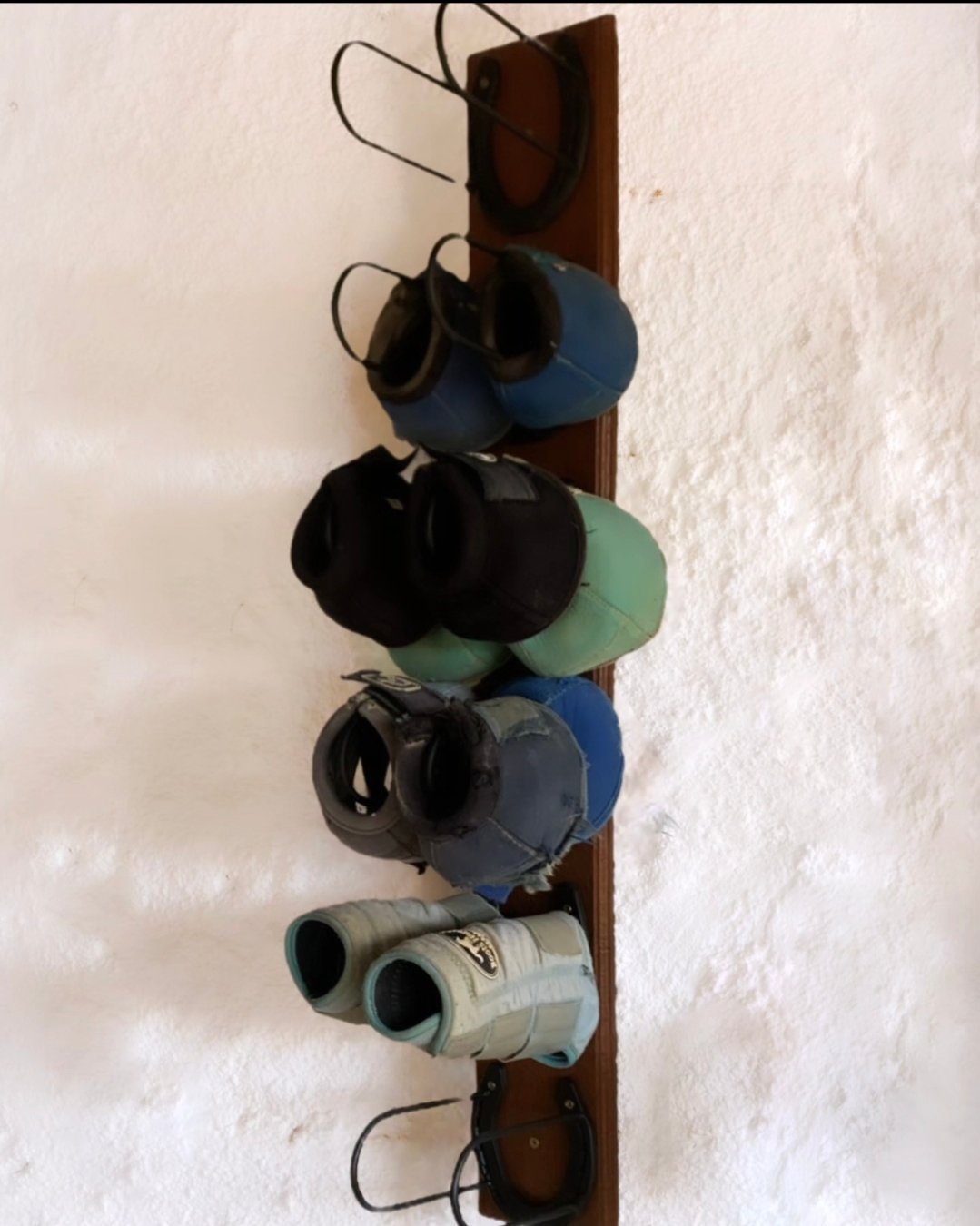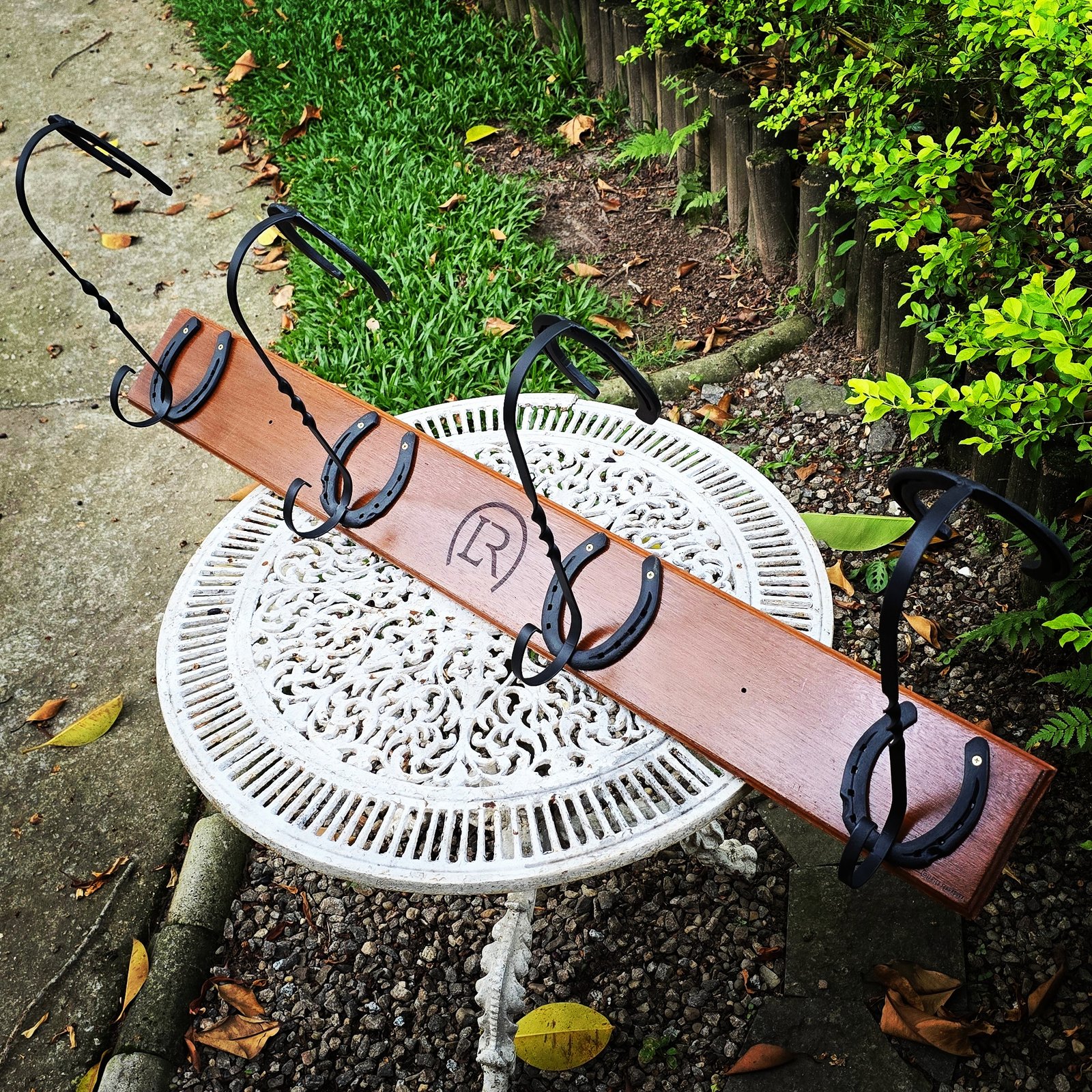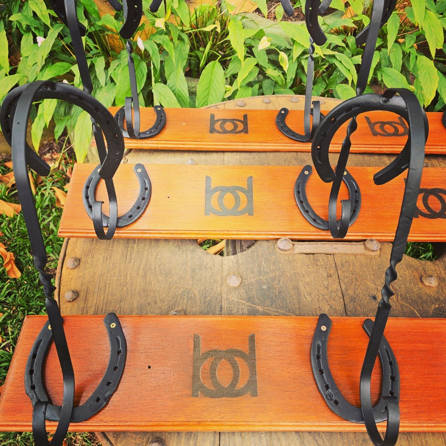 Cabide com espaço para 6 pares de Caneleiras. Com base em madeira.