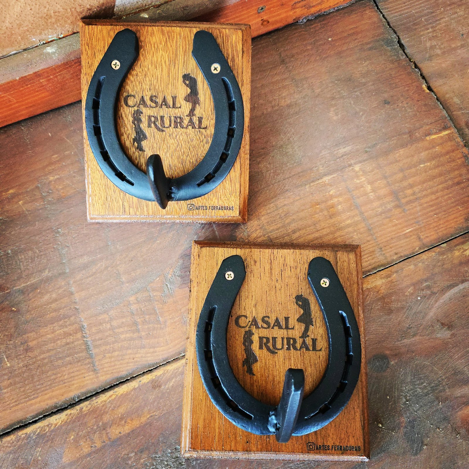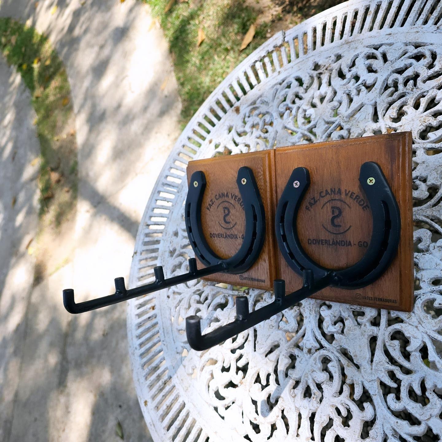 Suporte para 2 chapéus, na horizontal, com design Colonial formando um gancho na parte inferior possibilitando a pendurar bonés ou acessório. Base em madeira, podendo ser personalizado com Nome/Logomarca. Comprimento 90cm.