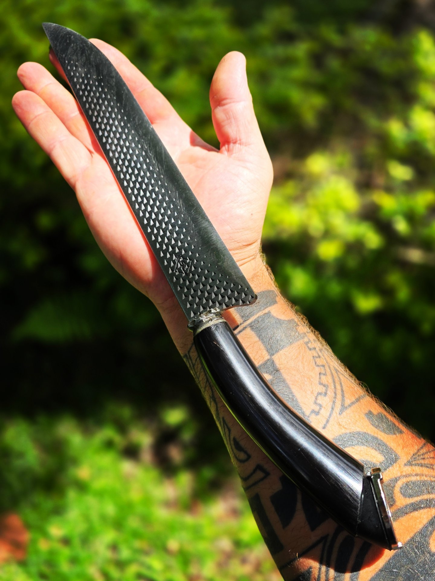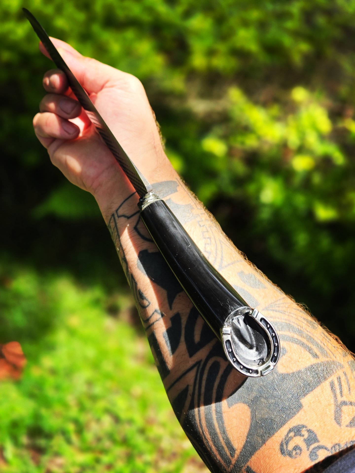 Picanheira de lâmina forjada em grosa, cabo em chifre e um Lindo acabamento no formato de casco com Ferraduras.