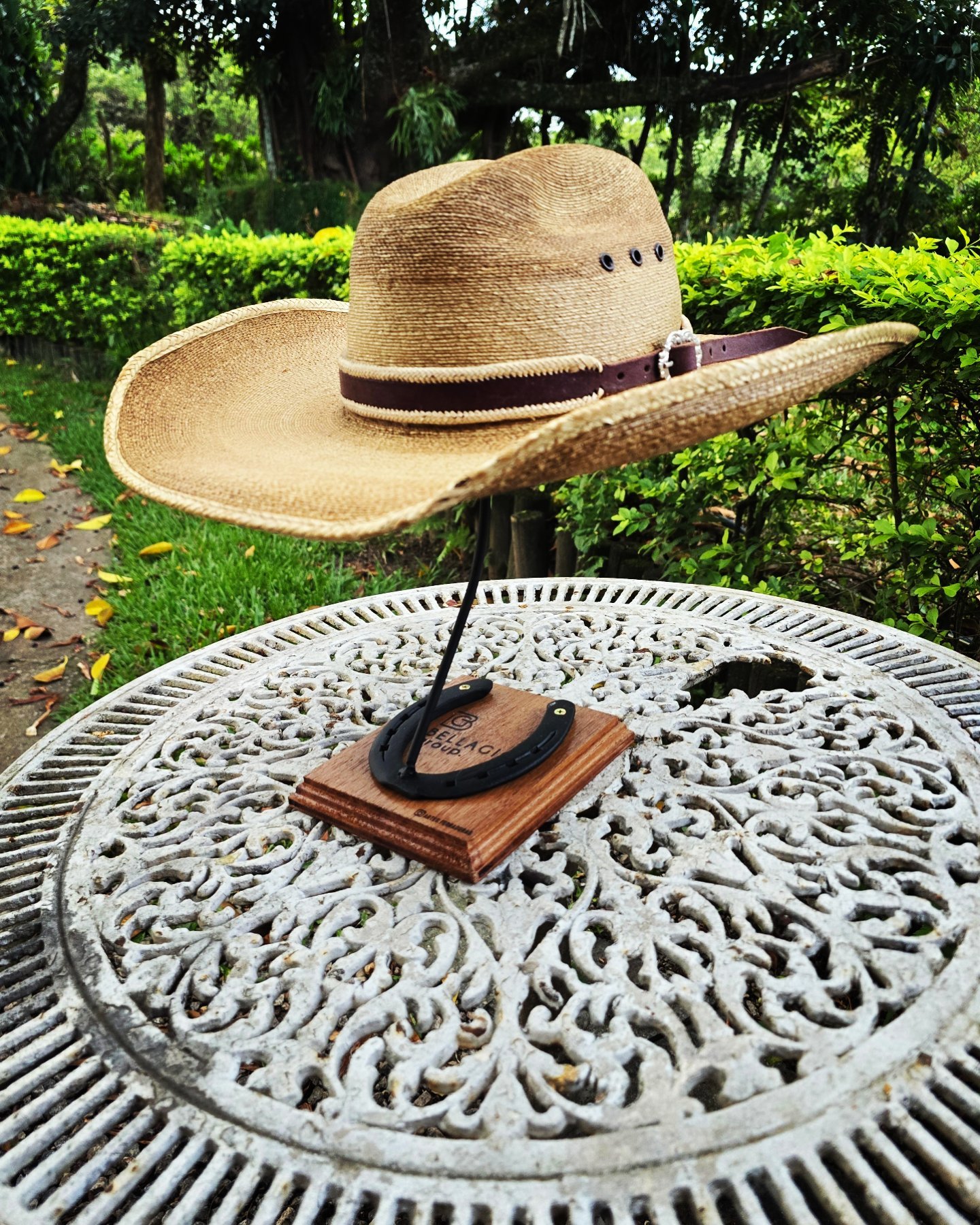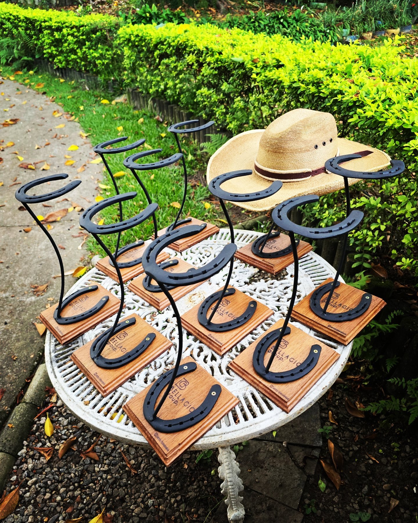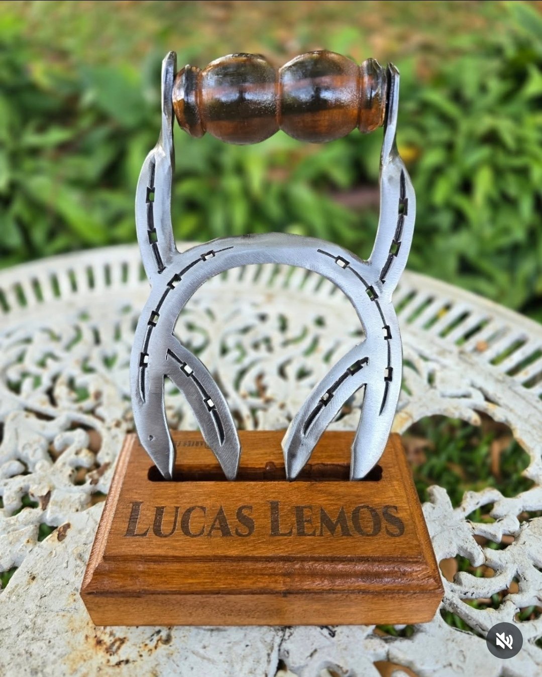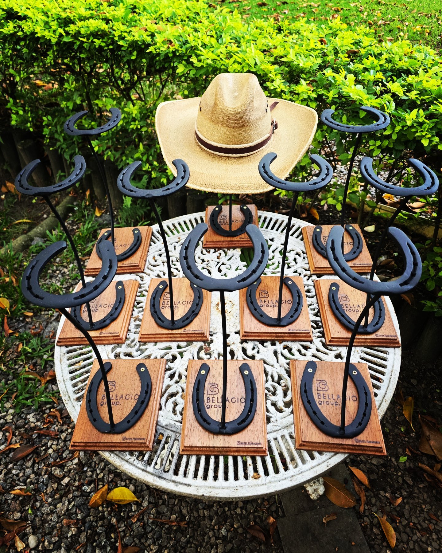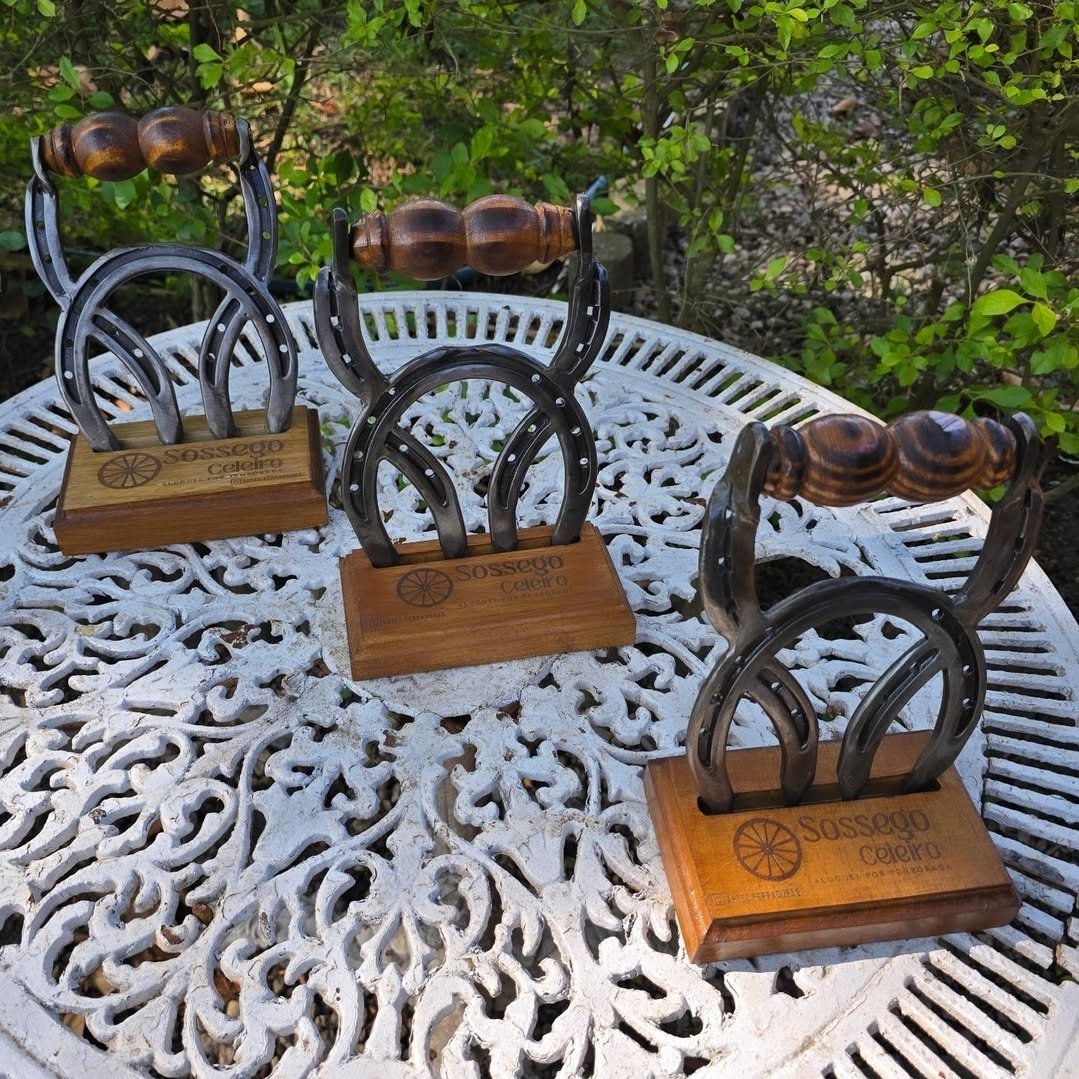 Expositor em madeira, podendo ser personalizada com Nome/Logo. Com ferraduras.