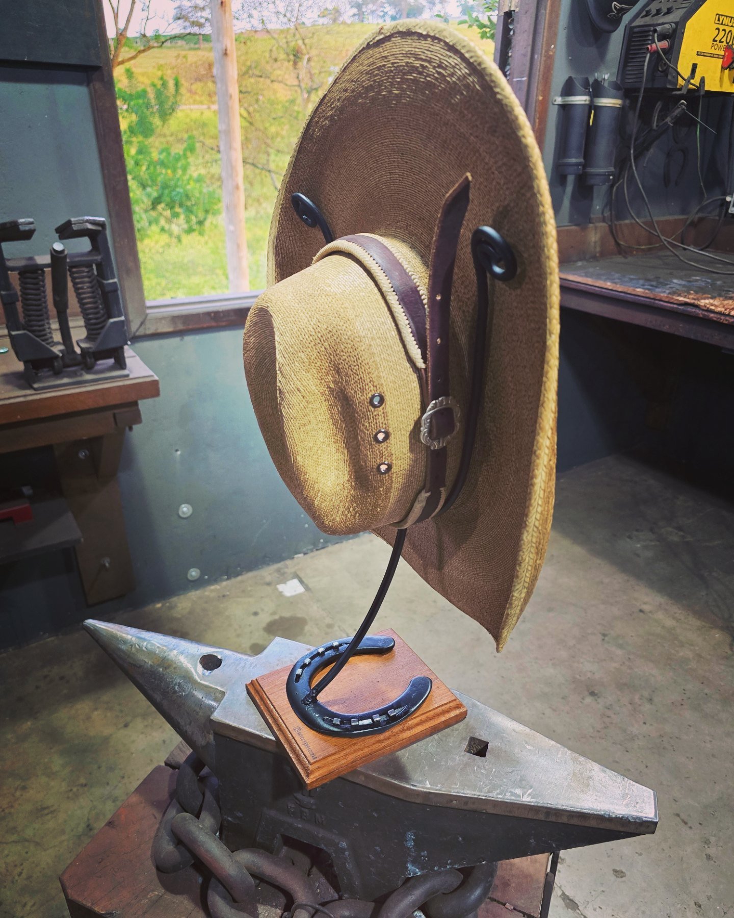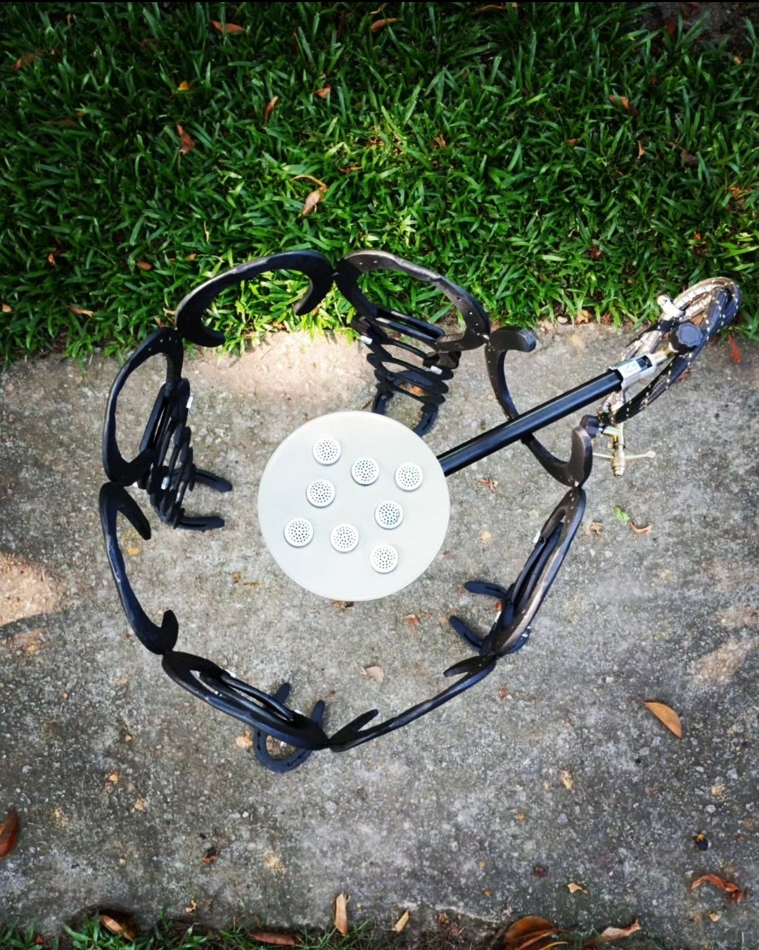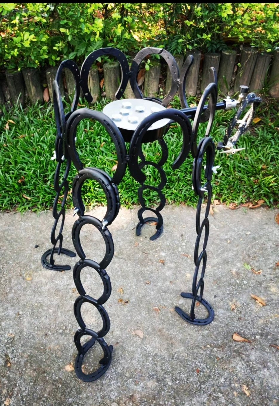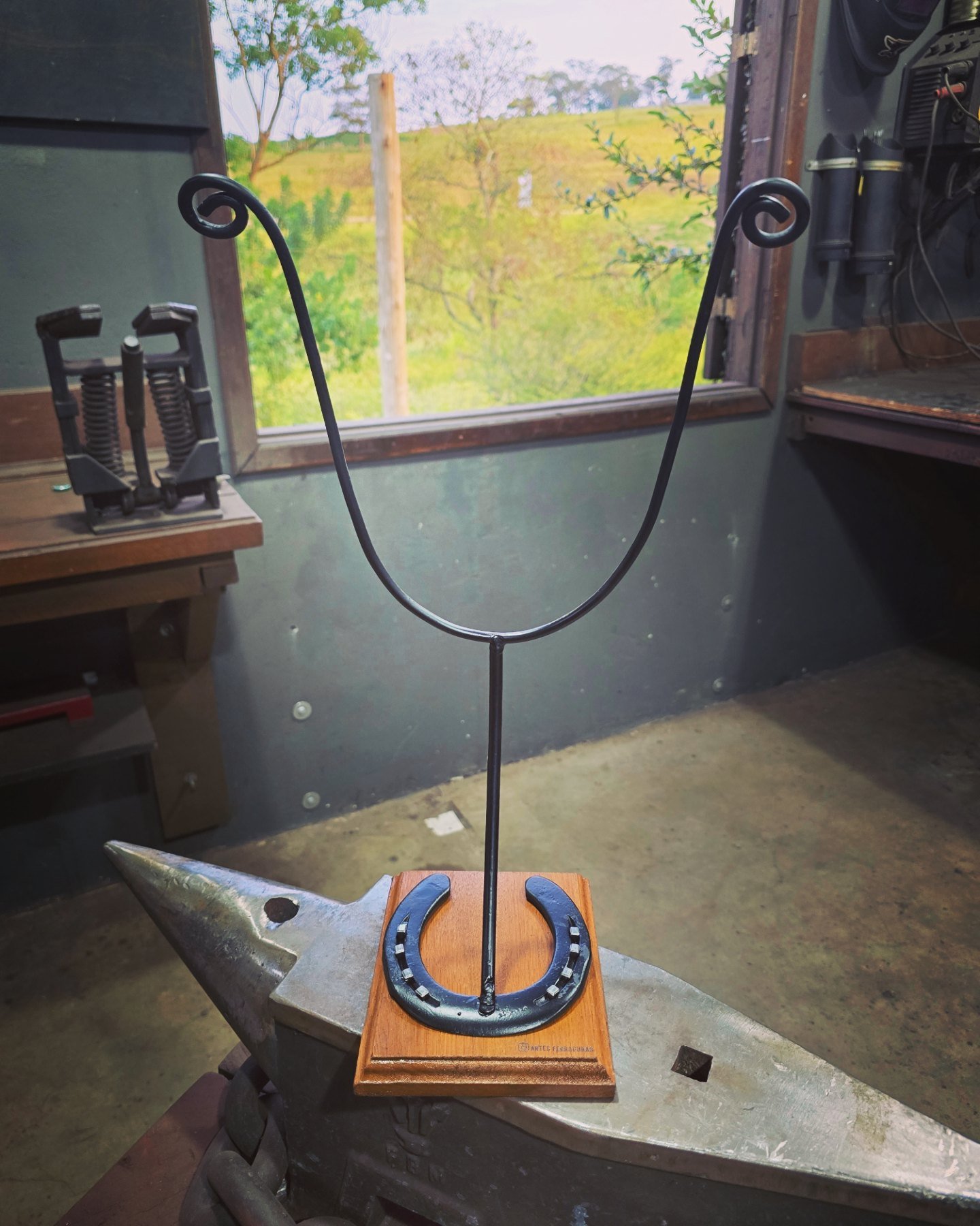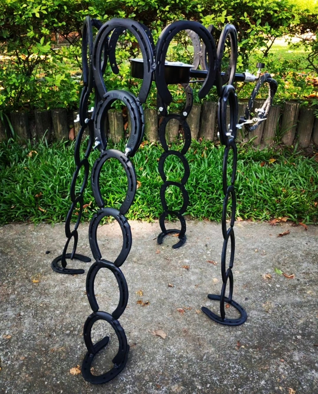 Estante feita de ferraduras com três prateleiras