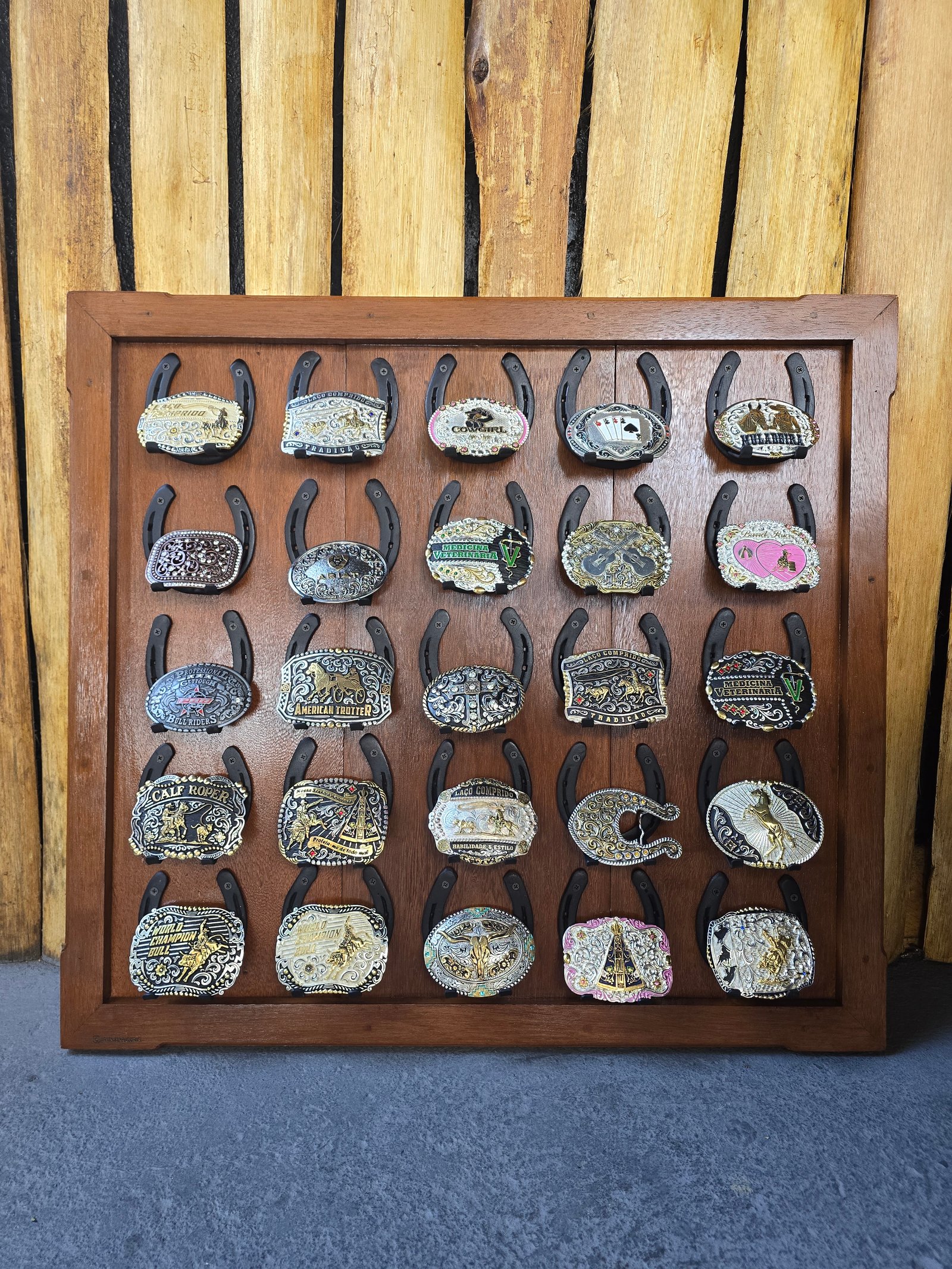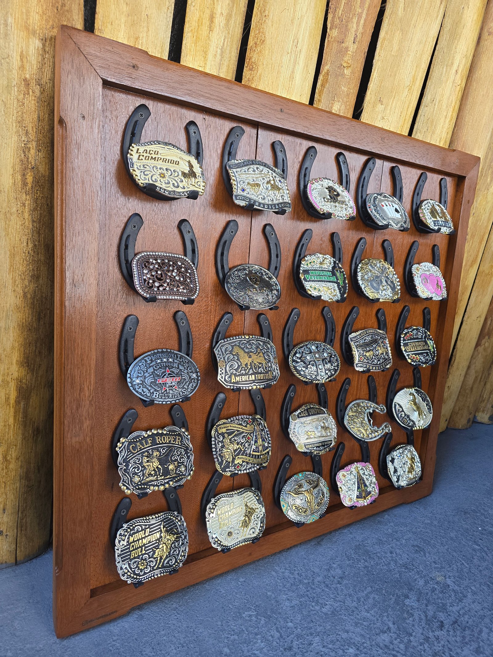 Expositor em madeira, podendo ser personalizada com Nome/Logo. Com ferraduras. Dimensões 80x90. Capacidade para 25 fivelas.